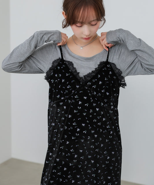 小花柄レース付きベロアキャミワンピース