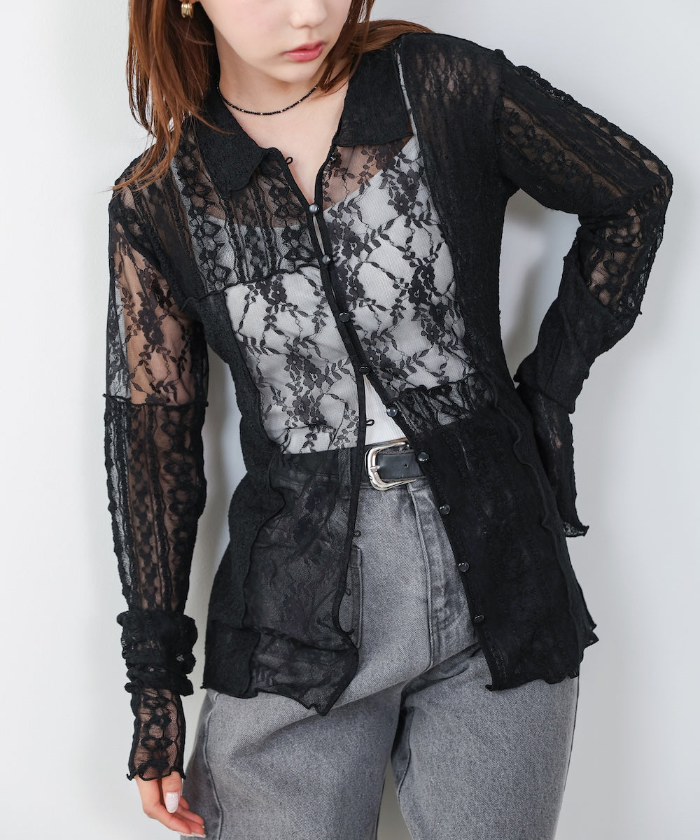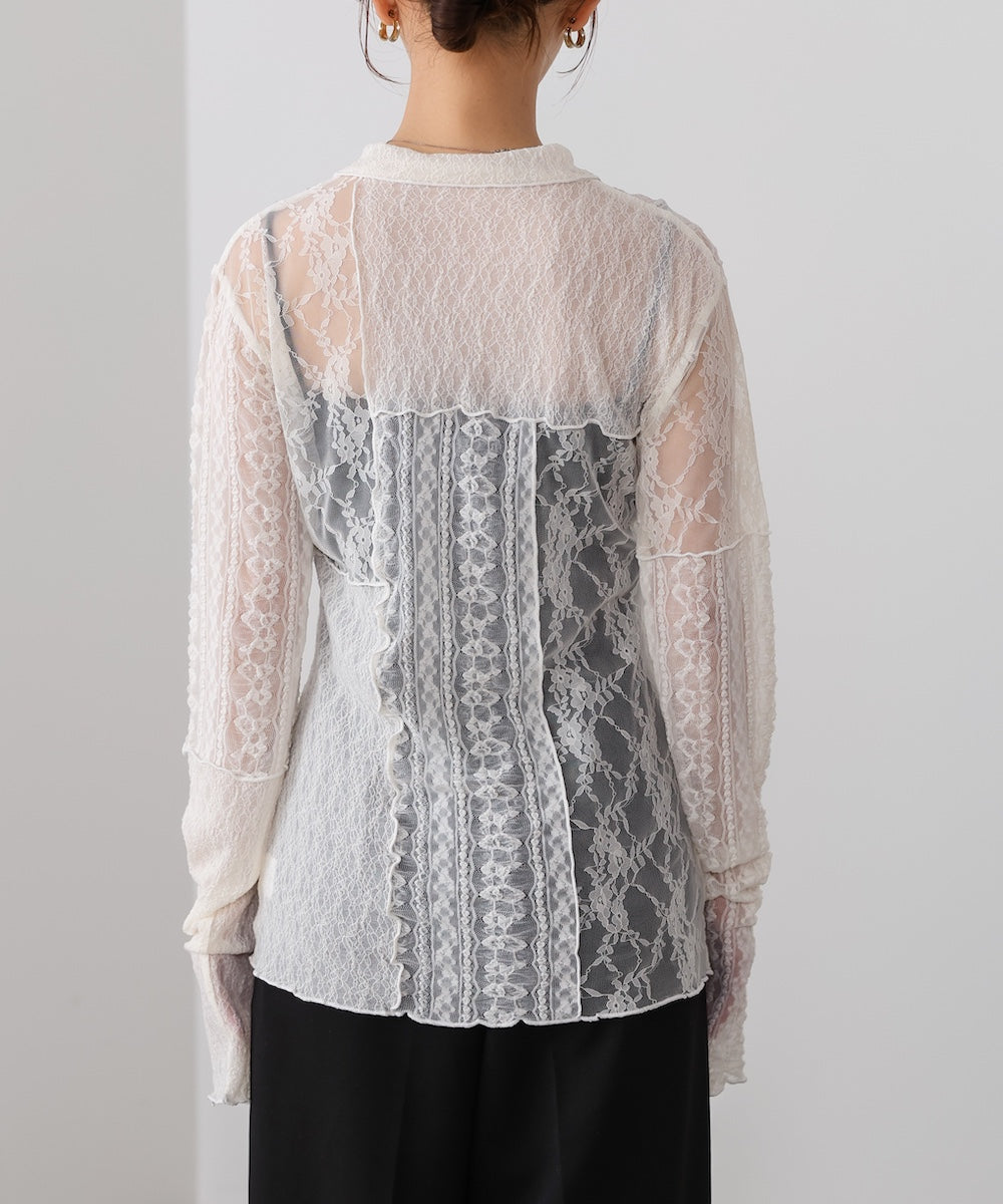襟付きレースパッチワークシャツ