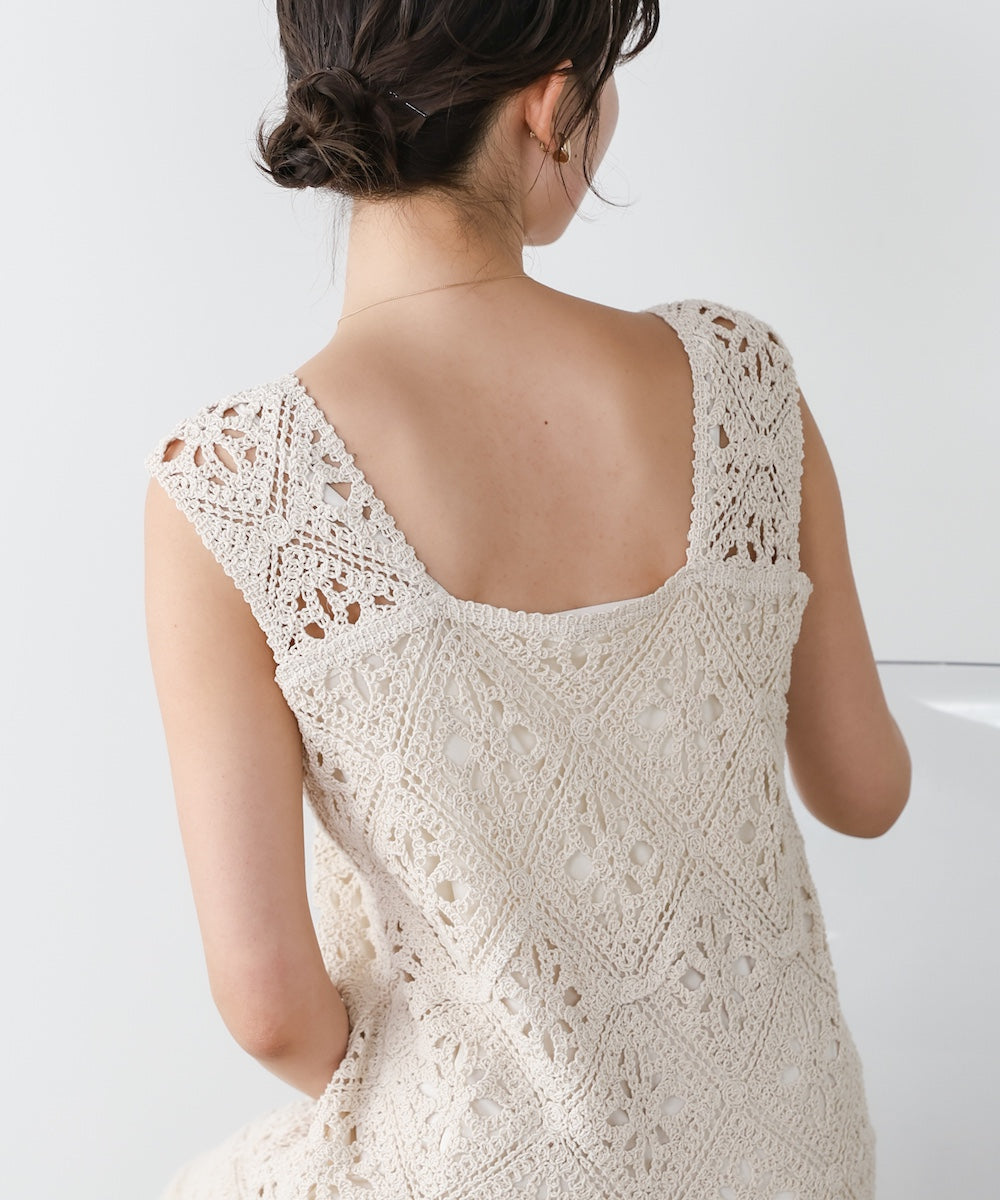 表地は綿をベースにしたクロシェ編み素材で、ナチュラルで柔らかな風合いが魅力。通気性もよく、軽やかな着心地に仕上げています。裏地にはポリエステルを使用しているため、安心感のある着用感です。