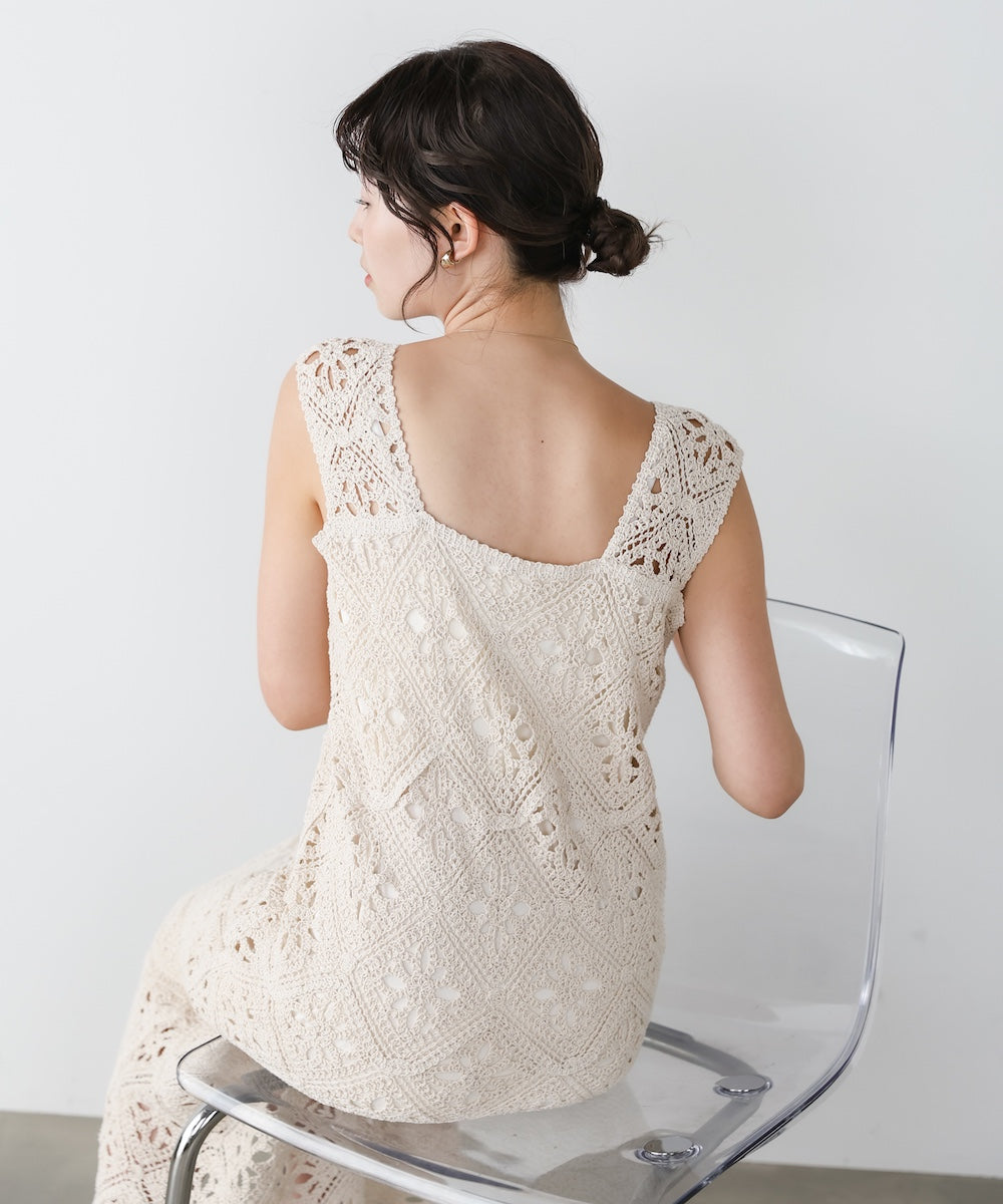 キャミソールやタンクトップをインナーに合わせて、クロシェの透け感を楽しむレイヤードスタイルがおすすめ。サンダルを合わせたリラックス感のある着こなしはもちろん、シアートップスをインナーに入れるとトレンド感のあるスタイリングに仕上がります。
