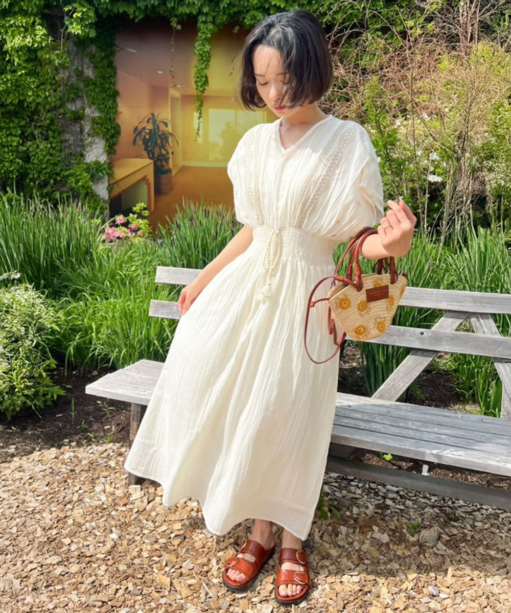 昨シーズンも大好評だったインドコットンを贅沢に使用したワンピース!柔らかくさらっとした質感で肌触りがよく、軽いシワ感はオリエンタルな情緒が漂います。ほどよくシアー感があり、ロングワンピースながら抜け感を演出できる1枚。顔周りやデコルテをすっきりと見せるVネックとウエストシャーリングでスタイルアップも叶い、脚長効果も期待できます。派手過ぎず上品見えする刺繍の位置やデザインにもこだわりました。
