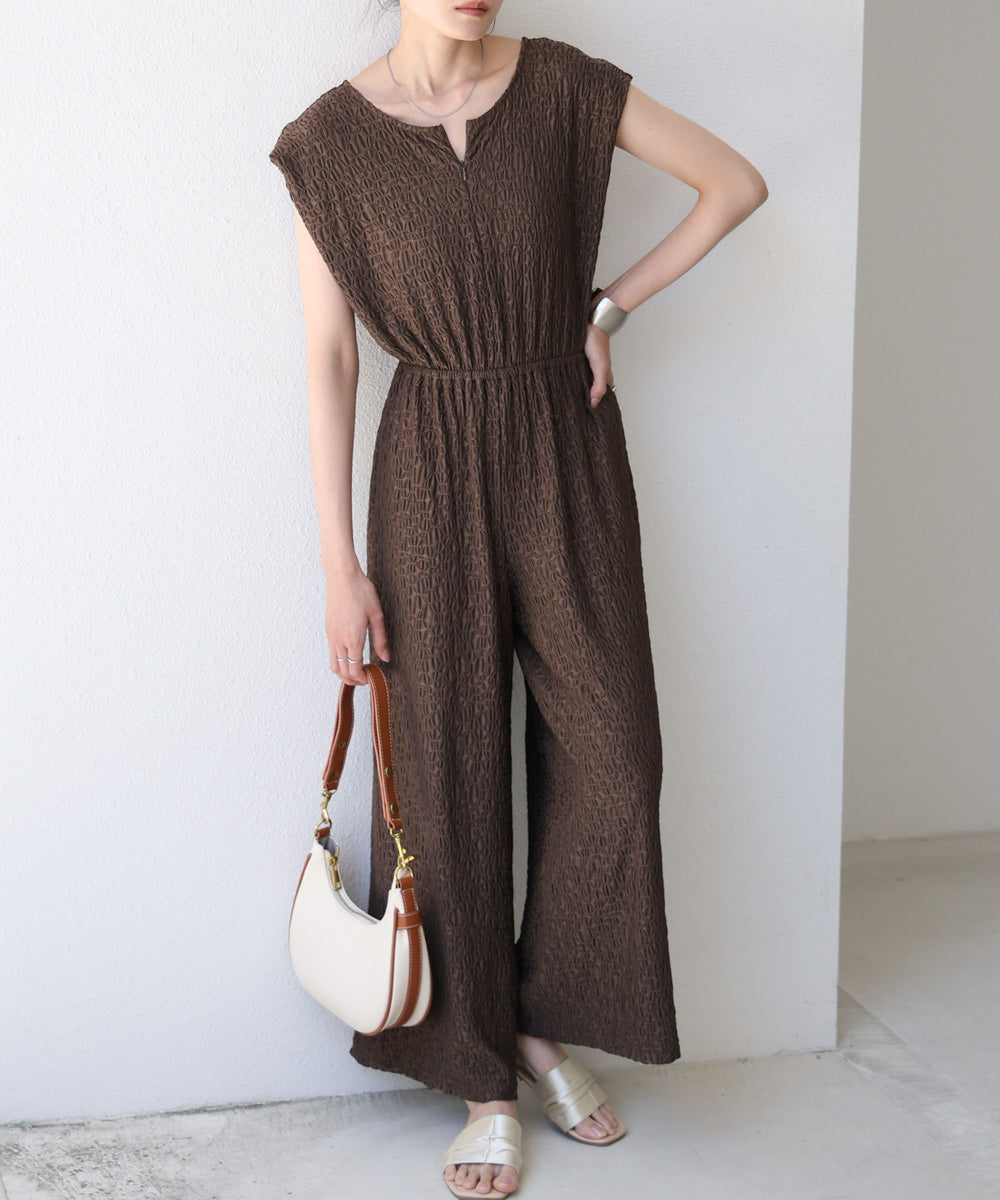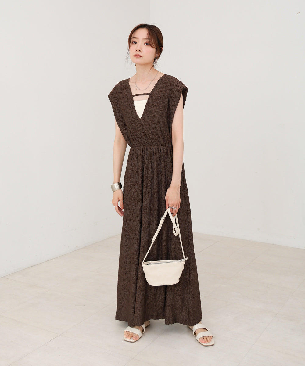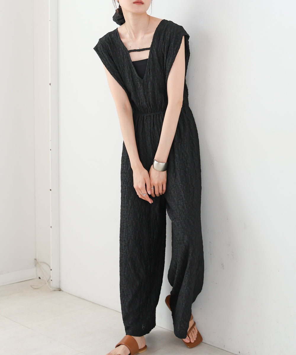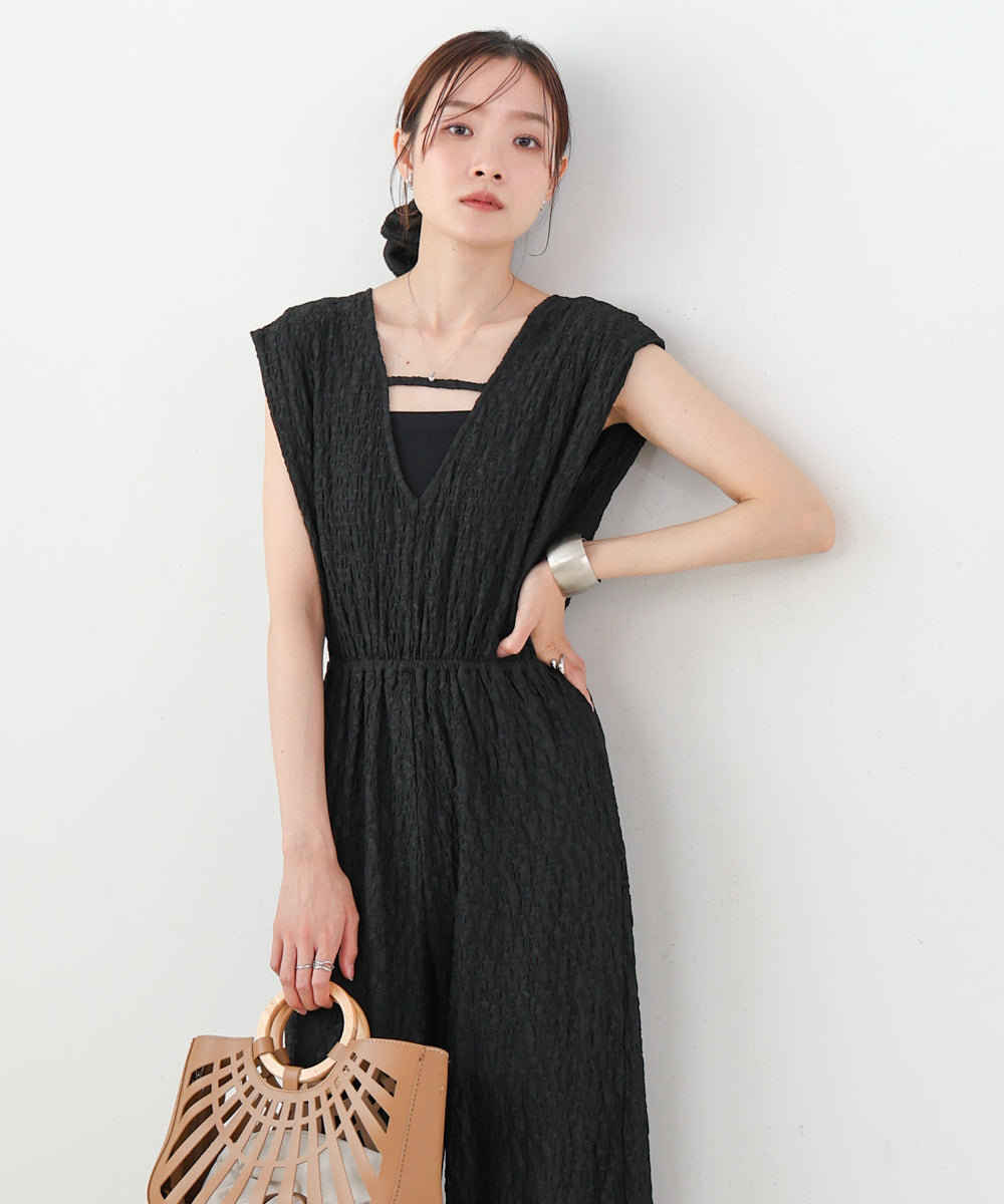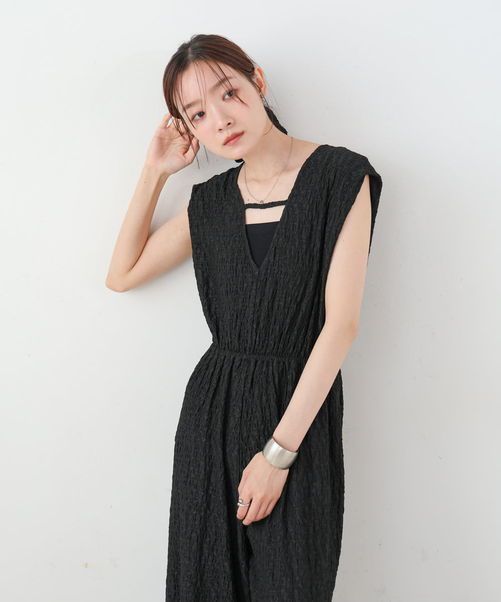 前後2WAY使用のワンピース・オールインワンが登場!柔らかい質感になっています。片面はVネックになっていてキャミソールなどと合わせていただくのがおすすめです!もう片方はジッパーが付いているUネックタイプでジップを調節してお好きな空き具合にしていただけます◎どちらのタイプも鎖骨が見えるので着瘦せして見えるのポイントです!また、中央の切り替え位置がゴムになっていているのでゆったりと着ていただきながらもスタイルアップして見えます!