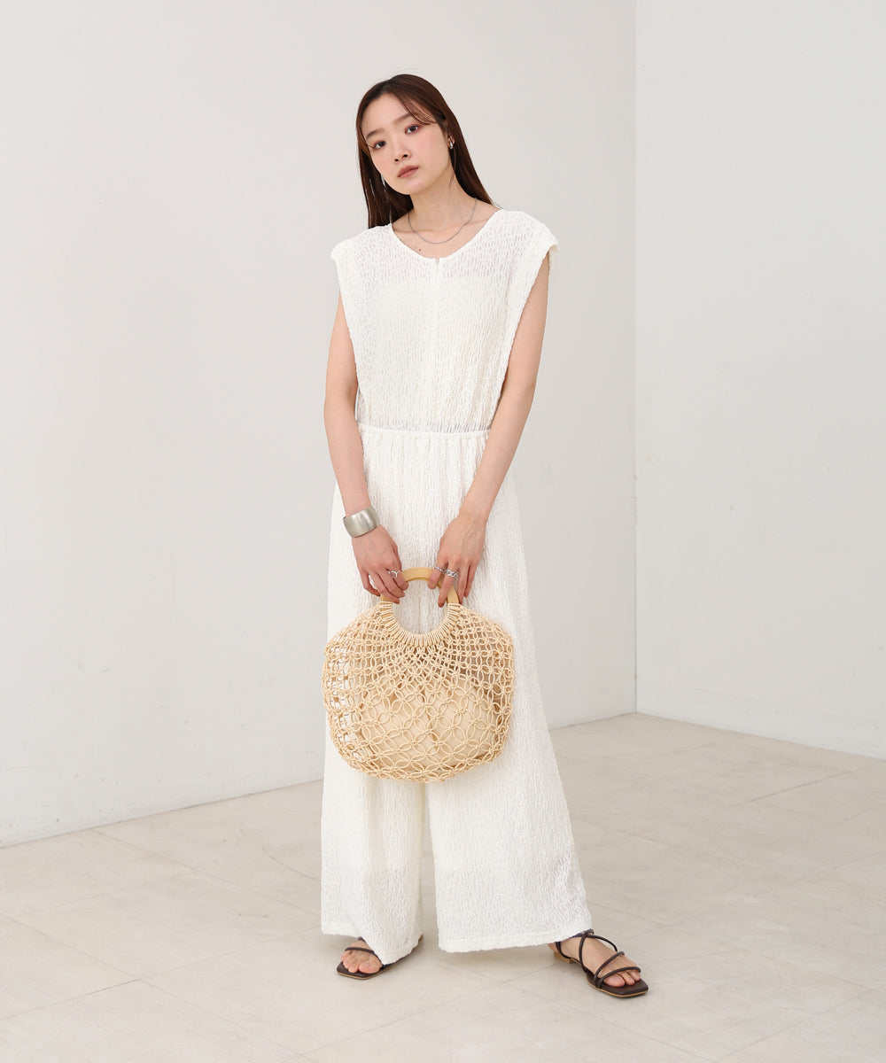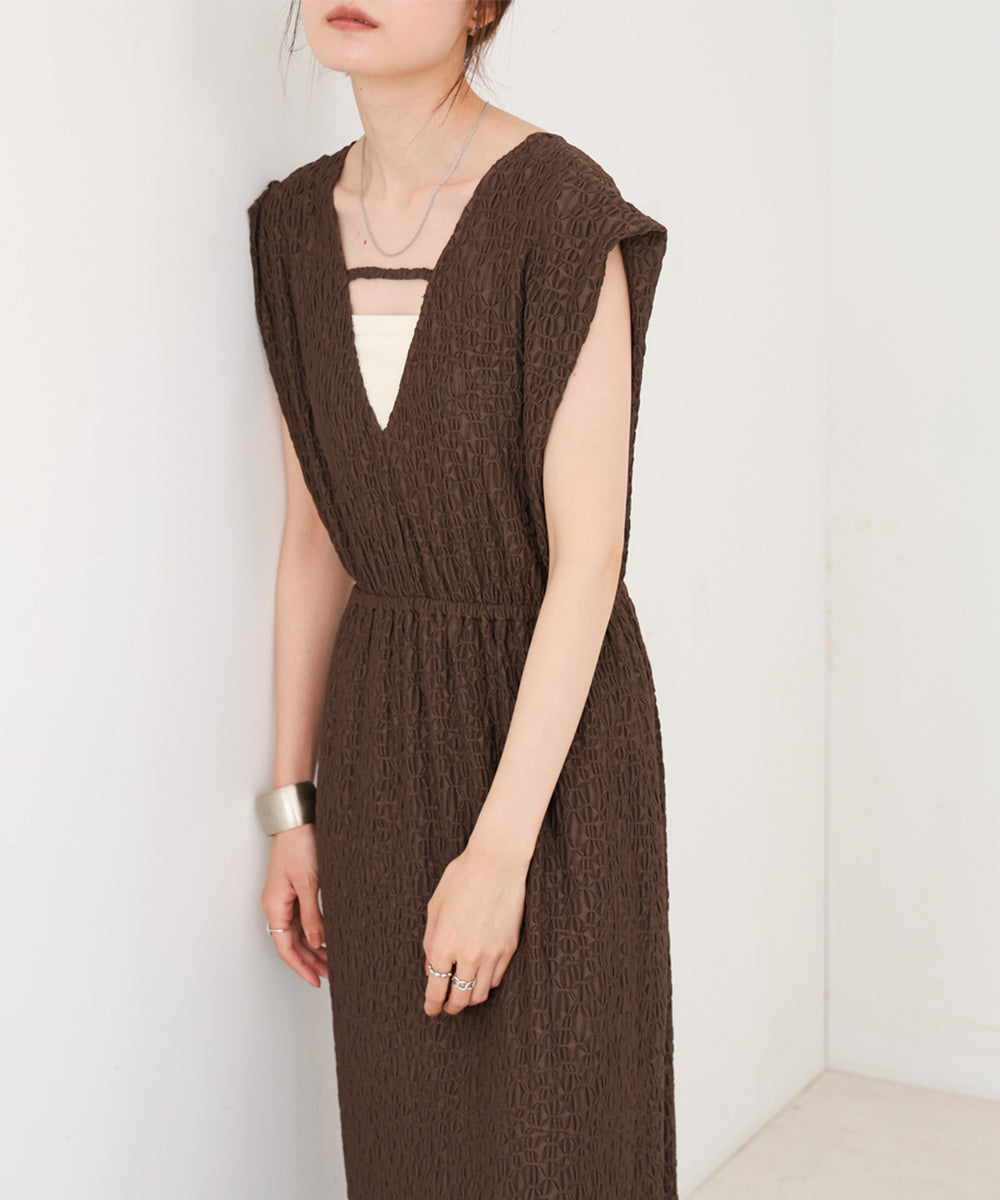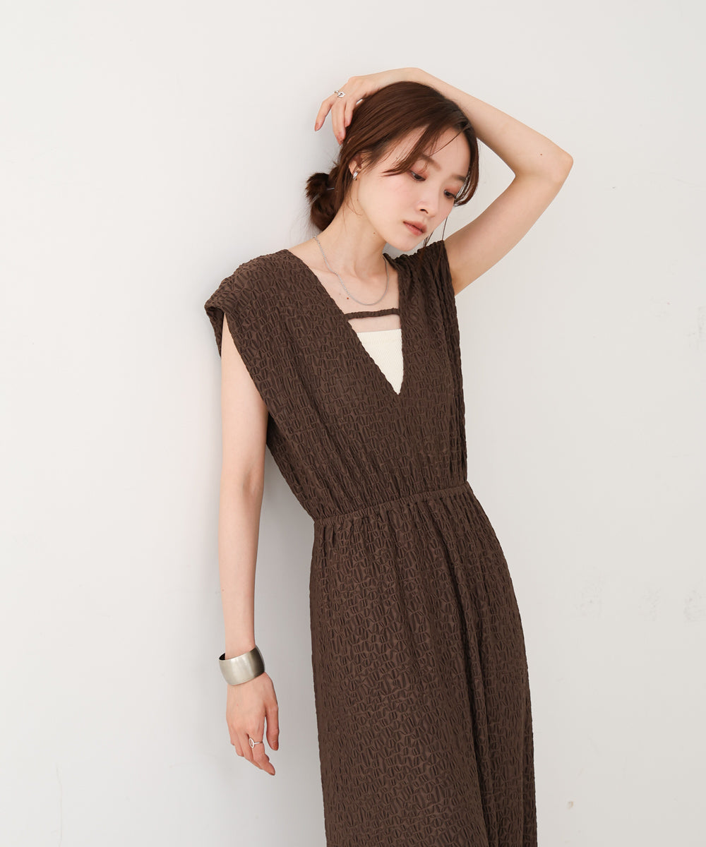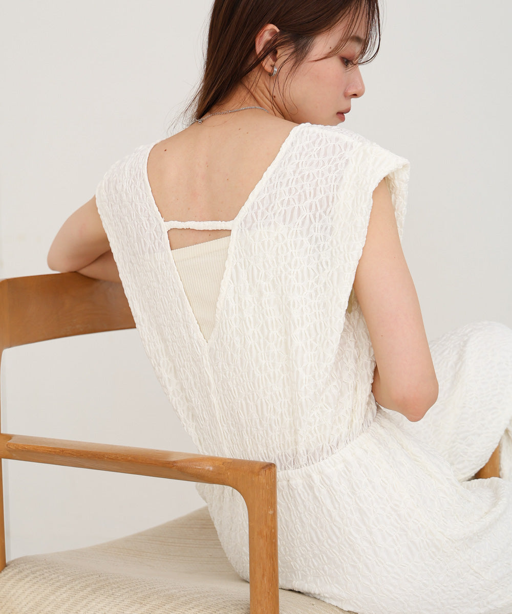 キャミソールなどを着て一枚でまとめていただいたり、中に薄手のカットソーを着ていただくスタイルなどがおすすめです!カジュアルにもきれいめにもなるのでスニーカーやサンダル合わせでも、ヒール合わせでも決まる一枚になっています!