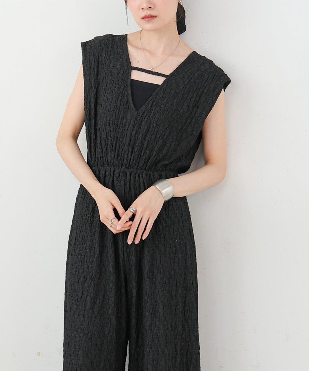 前後2WAY使用のワンピース・オールインワンが登場!柔らかい質感になっています。片面はVネックになっていてキャミソールなどと合わせていただくのがおすすめです!もう片方はジッパーが付いているUネックタイプでジップを調節してお好きな空き具合にしていただけます◎どちらのタイプも鎖骨が見えるので着?せして見えるのポイントです!また、中央の切り替え位置がゴムになっていているのでゆったりと着ていただきながらもスタイルアップして見えます!