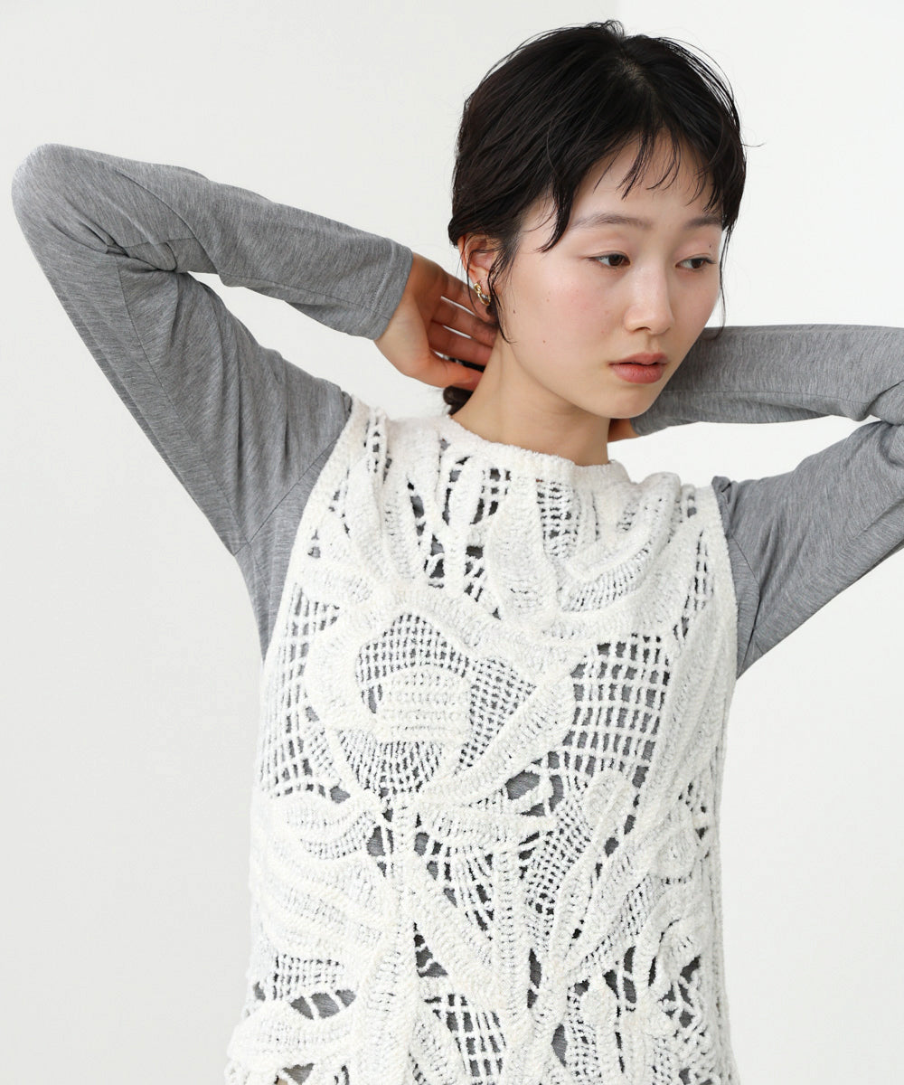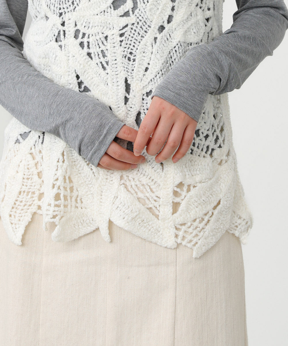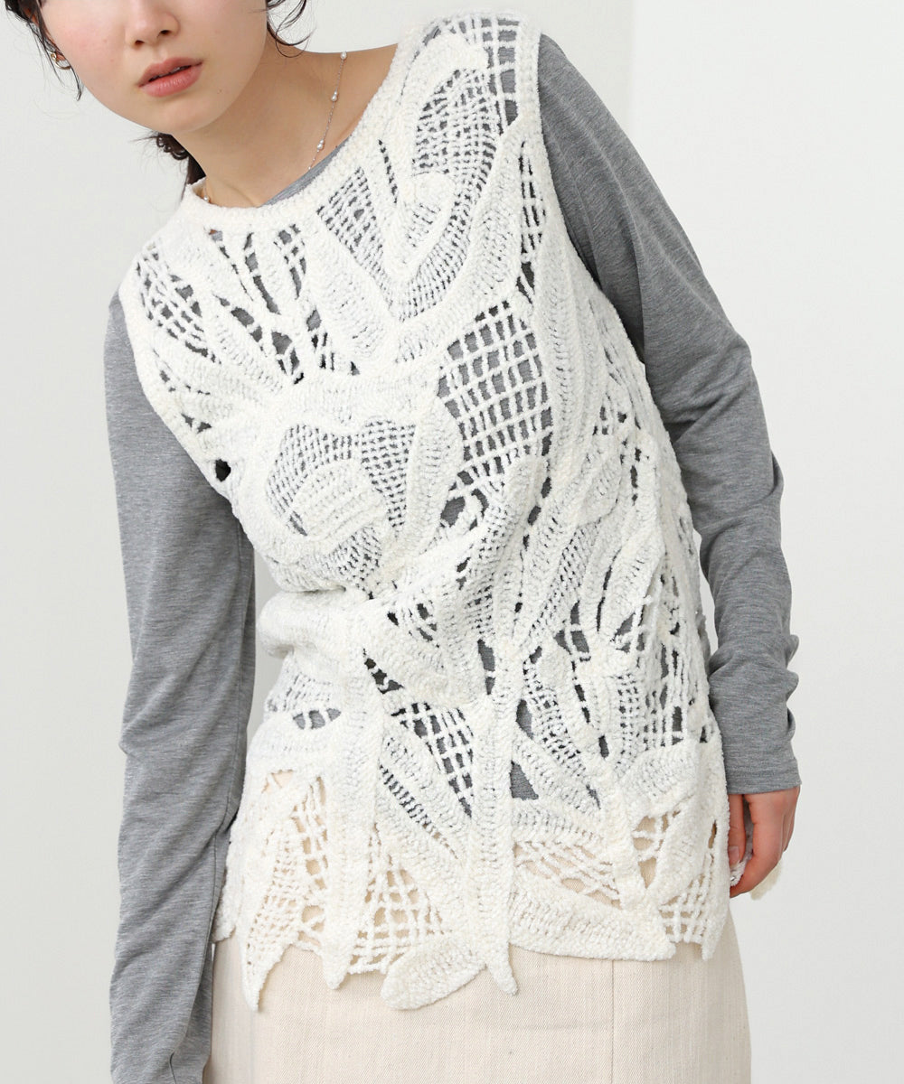 クロシェシリーズの冬仕様からチュニックベストが登場!モールヤーンで繊細なボタニカル柄を編んでいます。着るだけで優しく、フェミニンな印象を与えてくれます。丈感は通常のベストよりも長めに作られているので、ジャケットなどと合わせてレイヤードスタイルをお楽しみいただけます。1枚着るだけでも暖かいので秋冬のベストとして大活躍間違いなしのアイテムです。