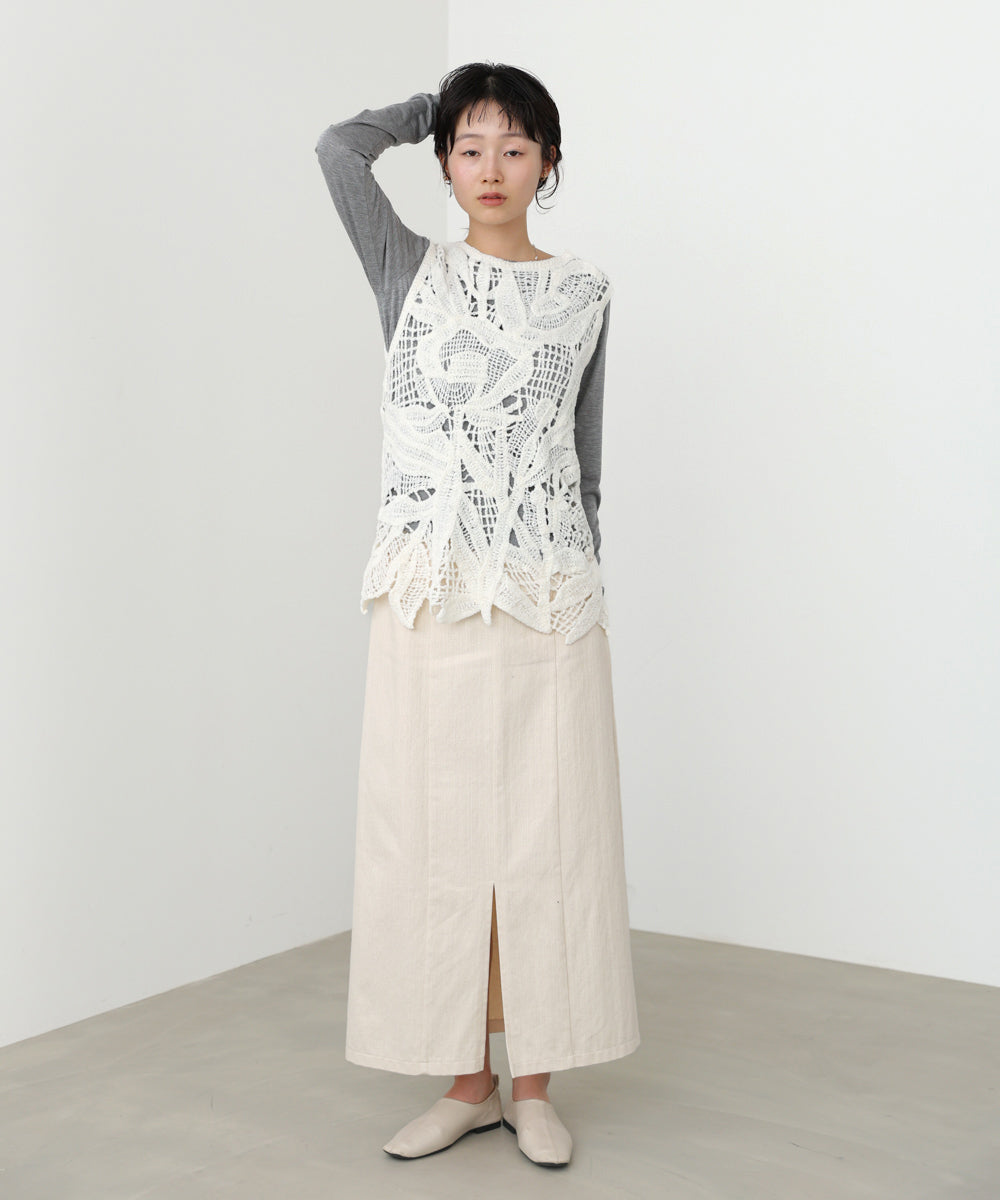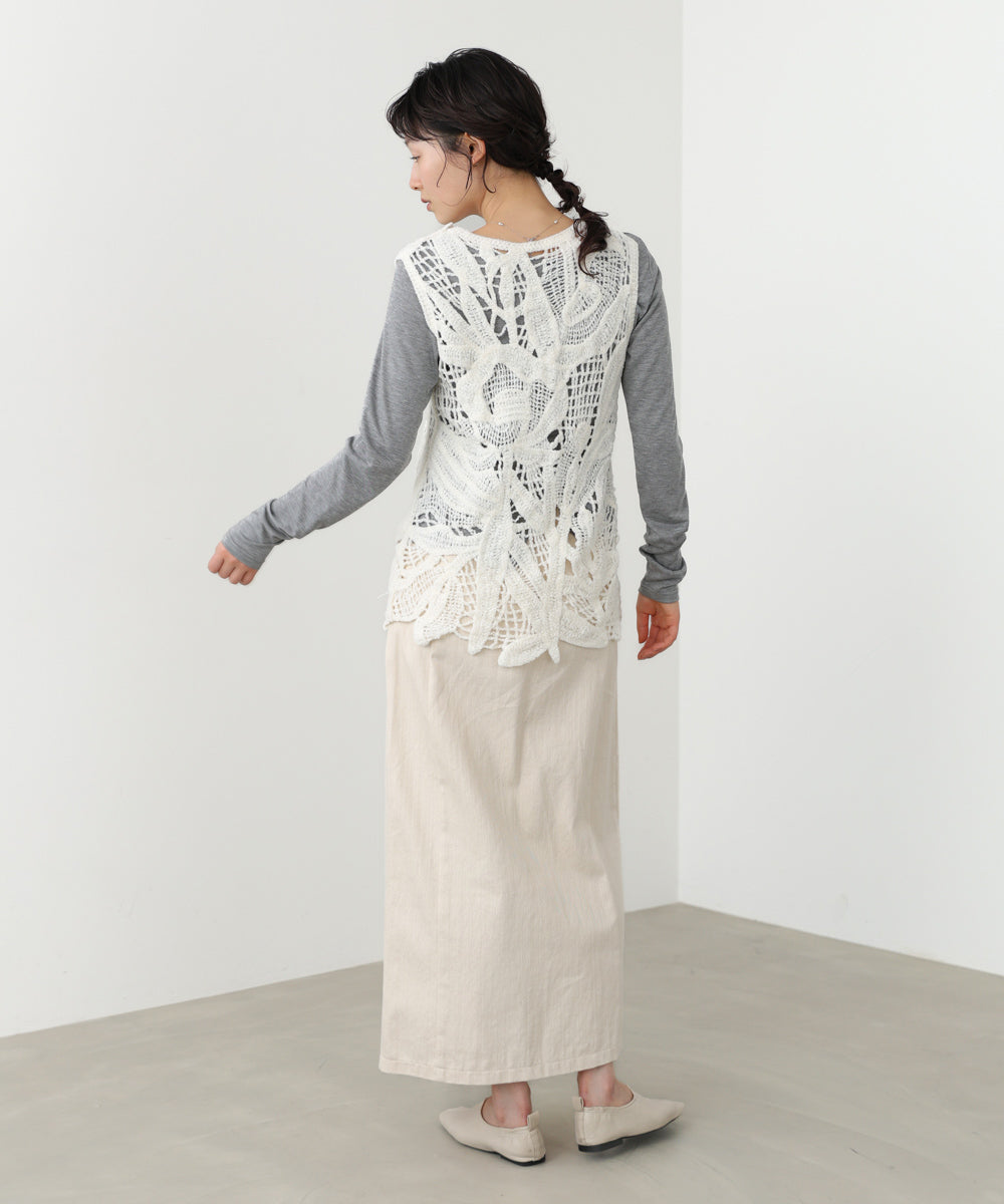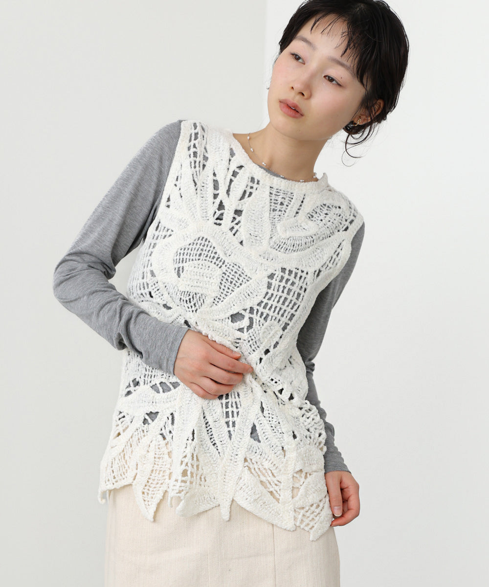 クロシェシリーズの冬仕様からチュニックベストが登場!モールヤーンで繊細なボタニカル柄を編んでいます。着るだけで優しく、フェミニンな印象を与えてくれます。丈感は通常のベストよりも長めに作られているので、ジャケットなどと合わせてレイヤードスタイルをお楽しみいただけます。1枚着るだけでも暖かいので秋冬のベストとして大活躍間違いなしのアイテムです。