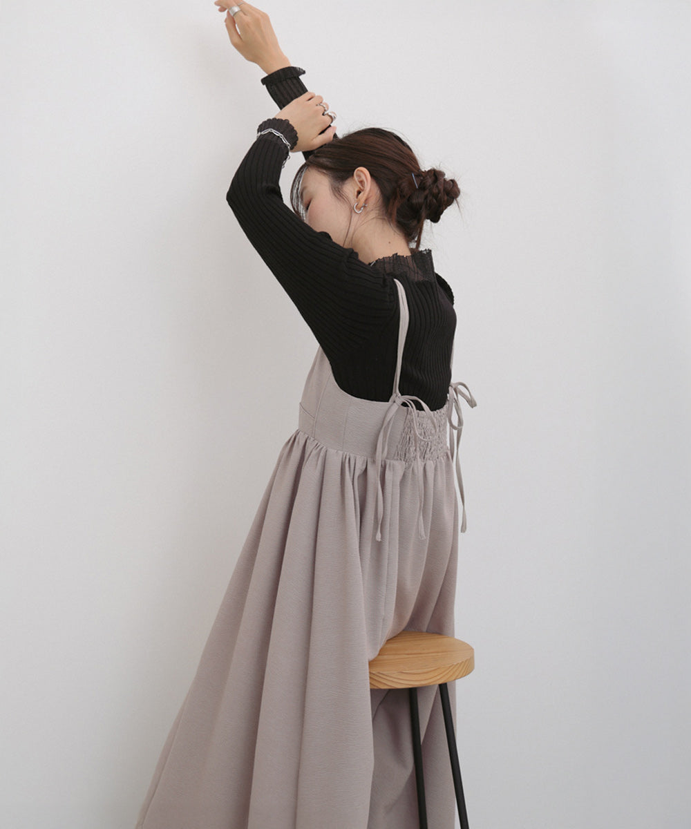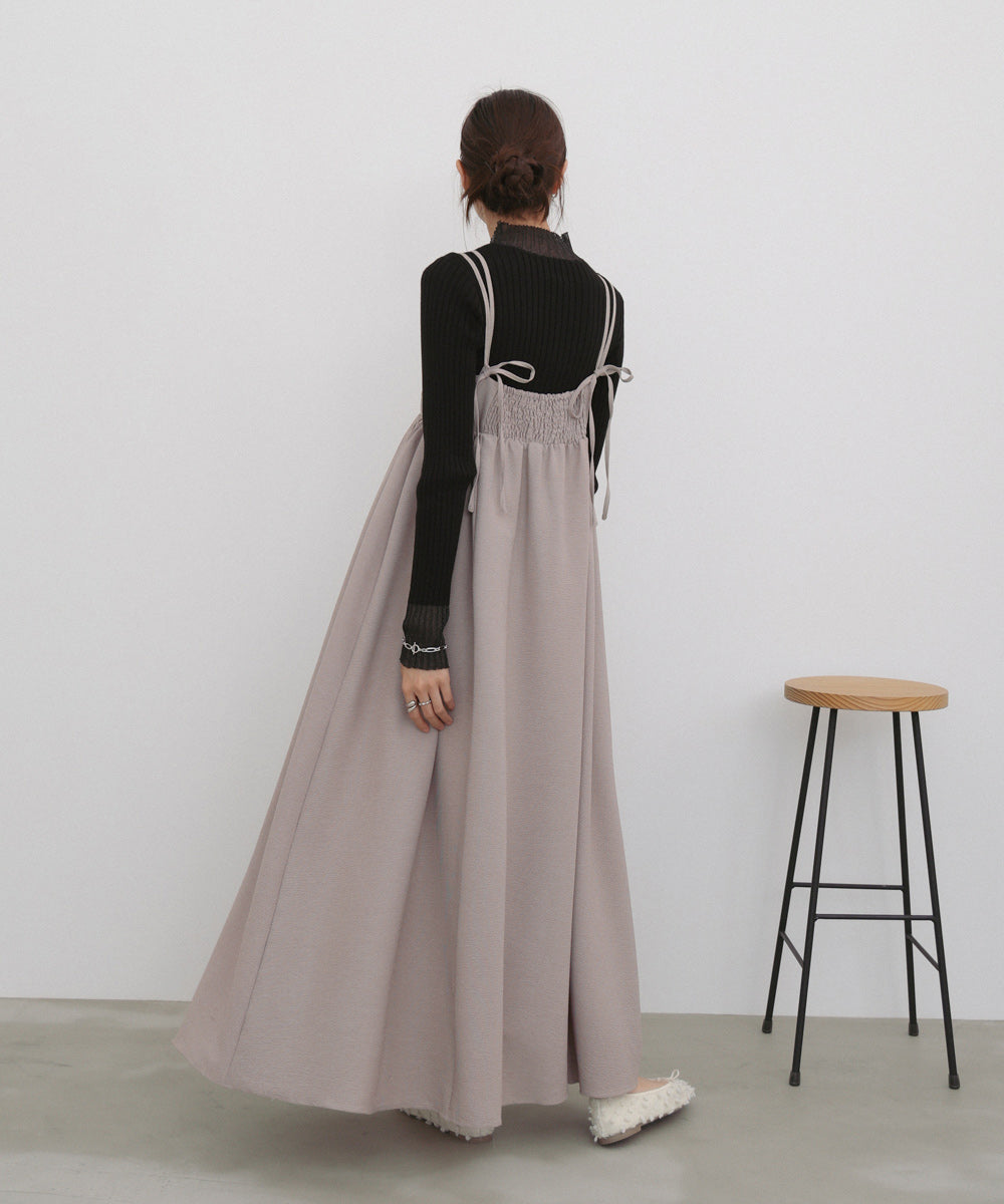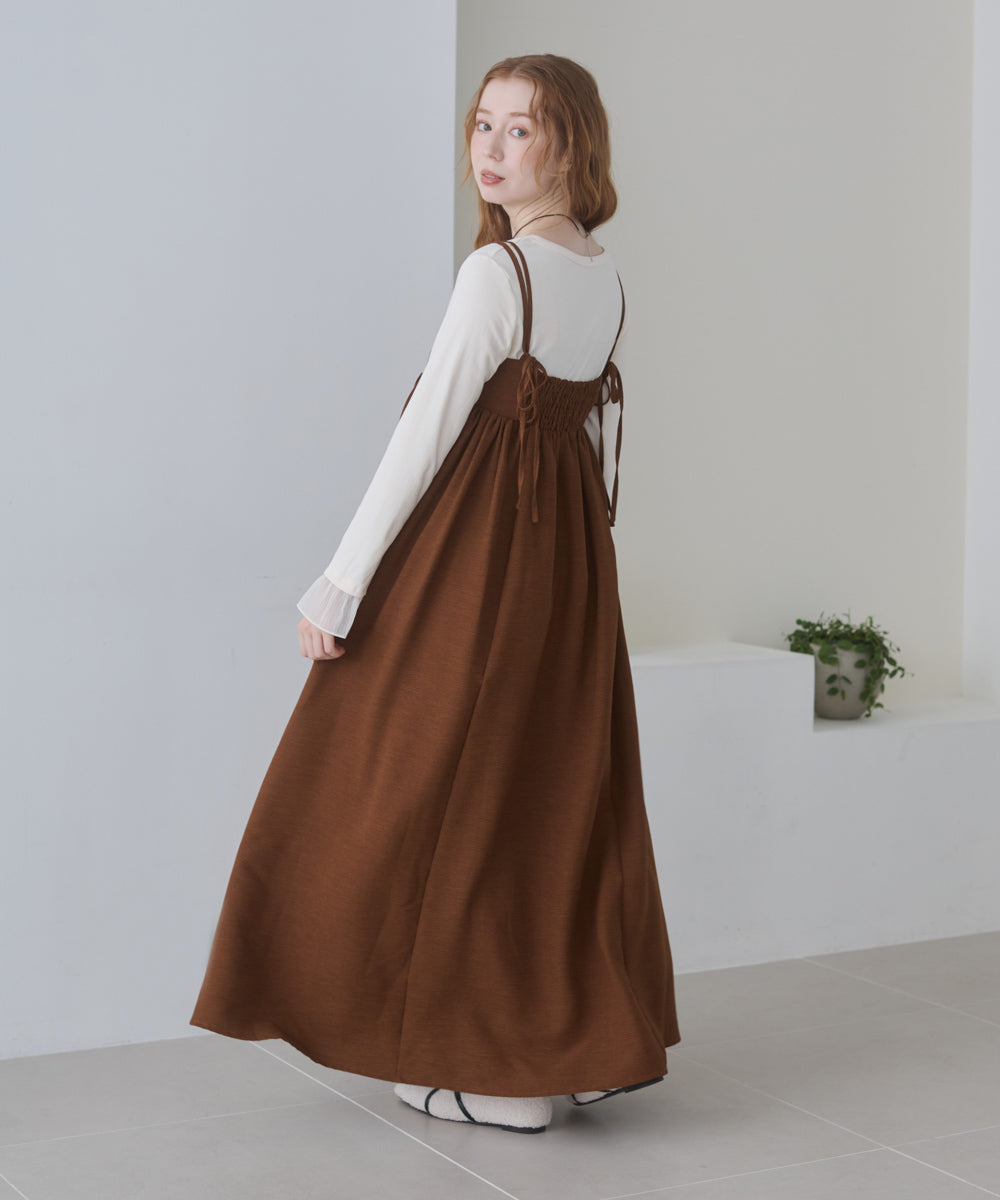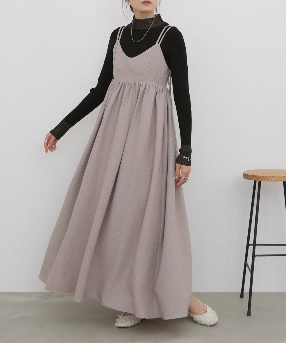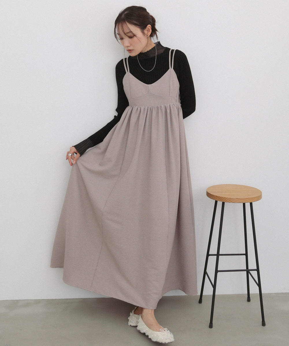 胸元部分からふわっと柔らかく広がるフレアキャミワンピが登場!まるでビスチェとフレアスカートが一枚になったようなフェミニン感あふれるワンピースです。夏から秋にかけてぴったりな硬すぎず薄すぎずな生地感に仕上がっています。上身頃後ろの部分はゴムになっているので着心地よくなっています。長袖のシアーカーディガンと合わせると夏から秋にかけての気温にぴったりなコーデが完成します。