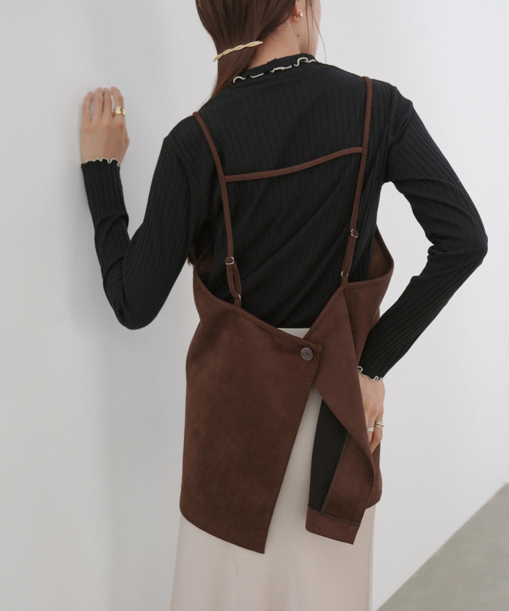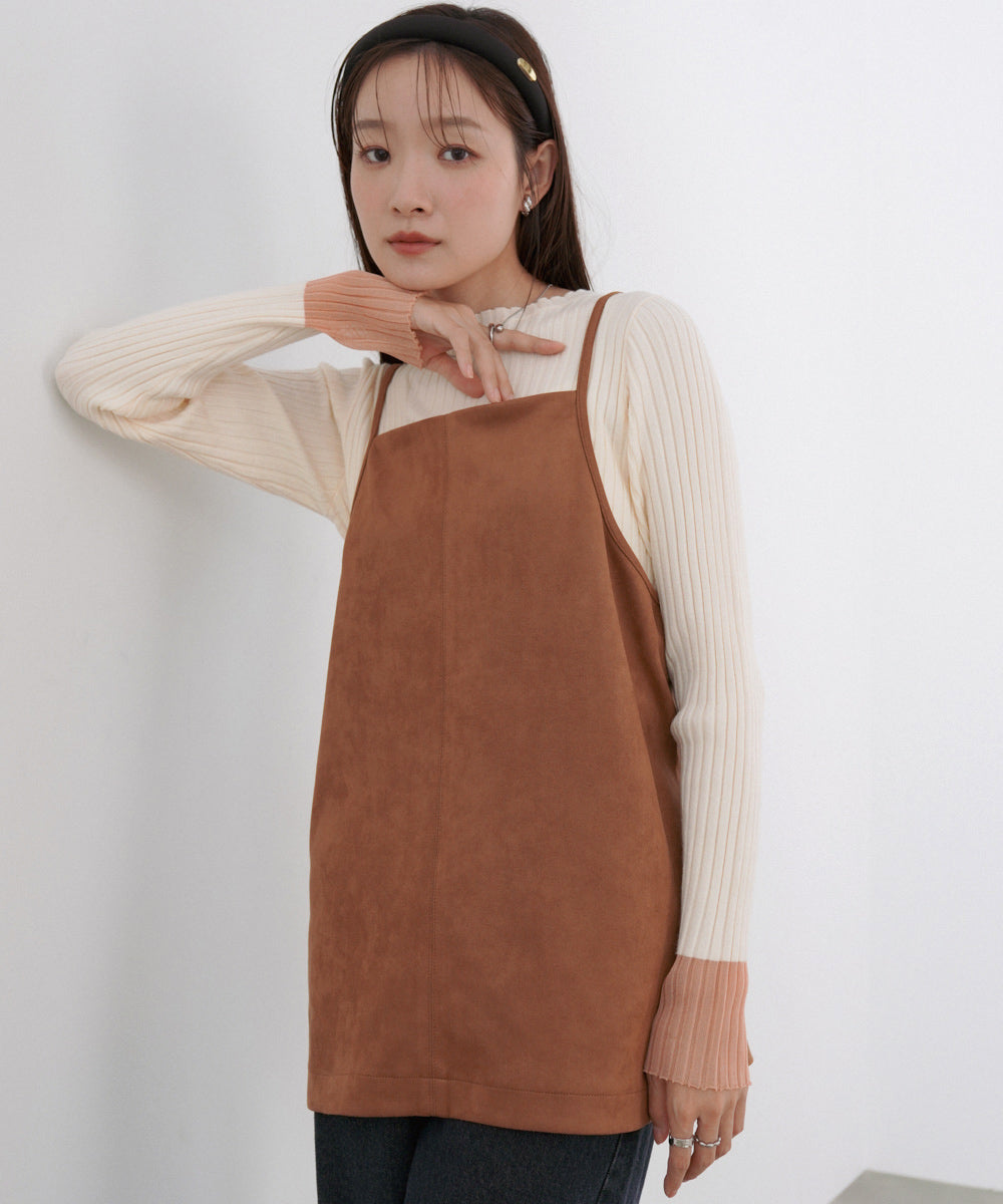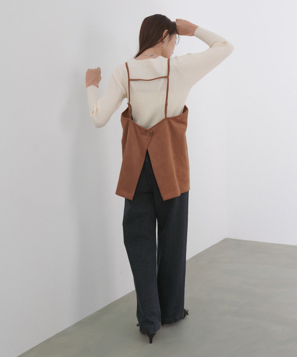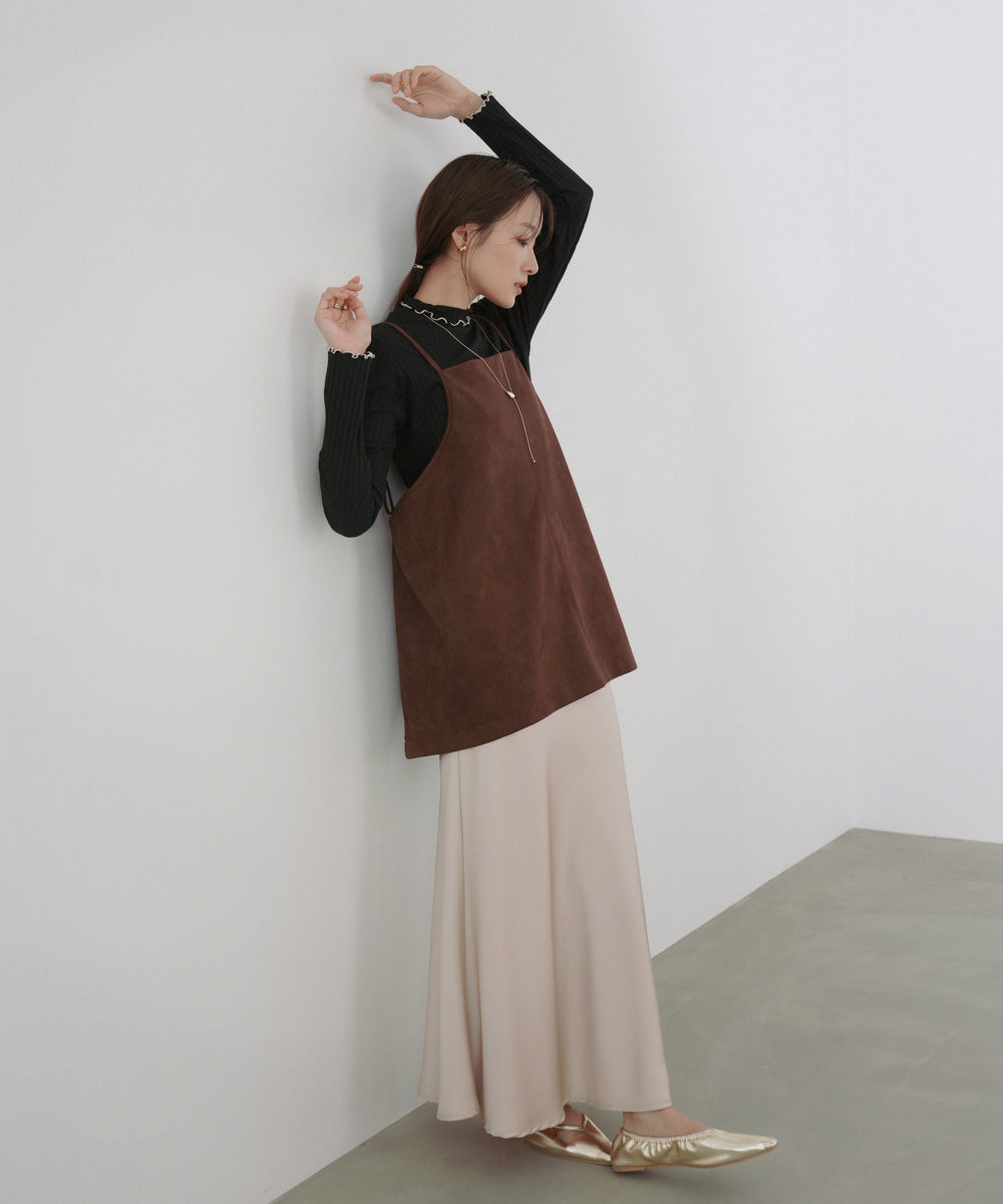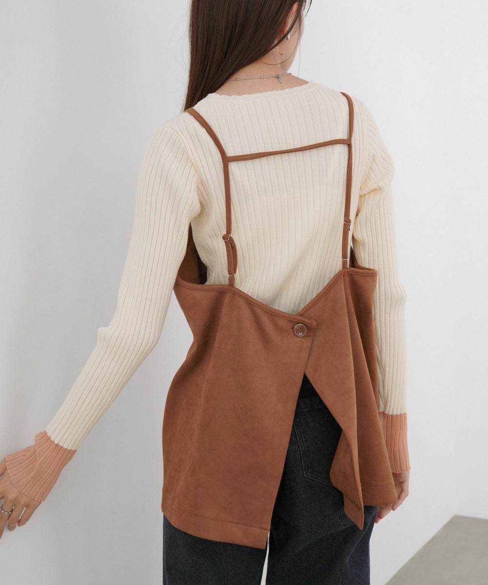バックデザインが一癖あるビスチェが登場!スウェード生地を使うことでより秋らしい雰囲気を演出してくれます。フロントデザインはシンプルですが、バック部分が広がるようなデザインになっています。薄手のカットソーと合わせて着ていただくのがおすすめです。