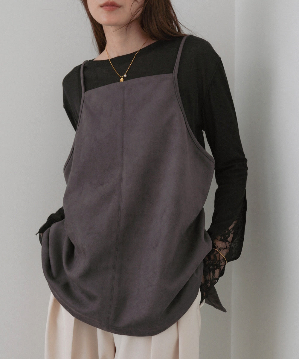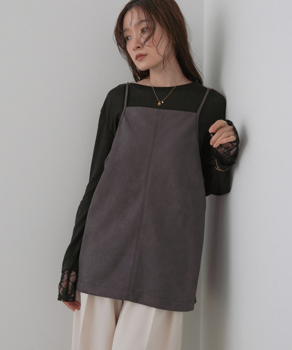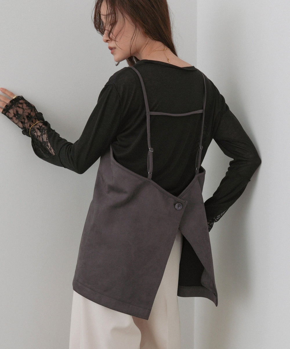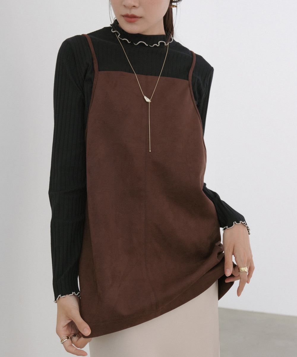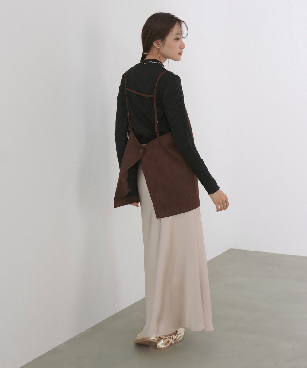 バックデザインが一癖あるビスチェが登場!スウェード生地を使うことでより秋らしい雰囲気を演出してくれます。フロントデザインはシンプルですが、バック部分が広がるようなデザインになっています。薄手のカットソーと合わせて着ていただくのがおすすめです。