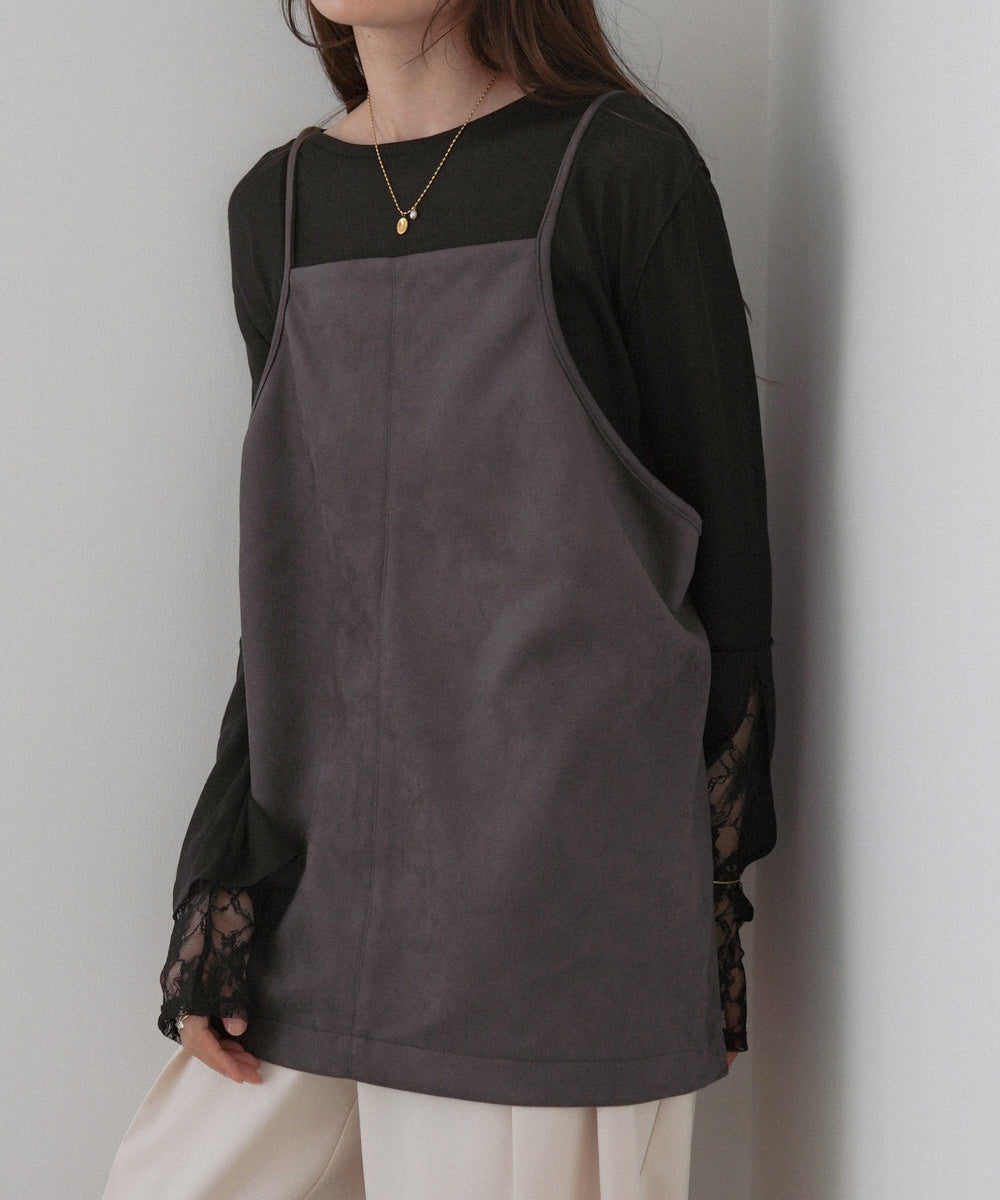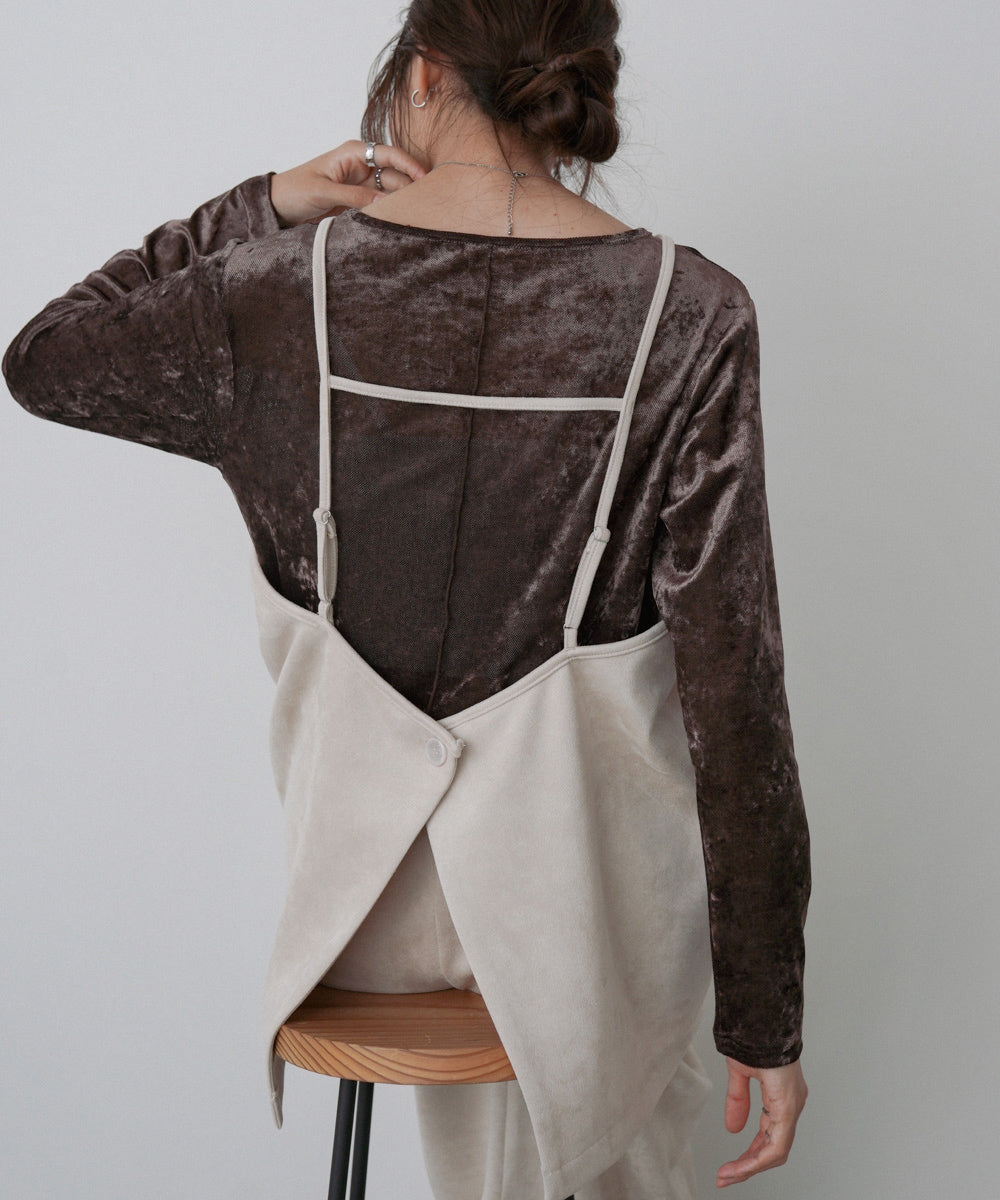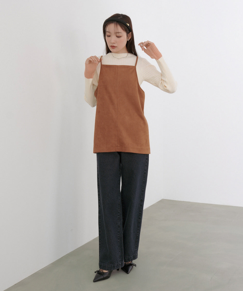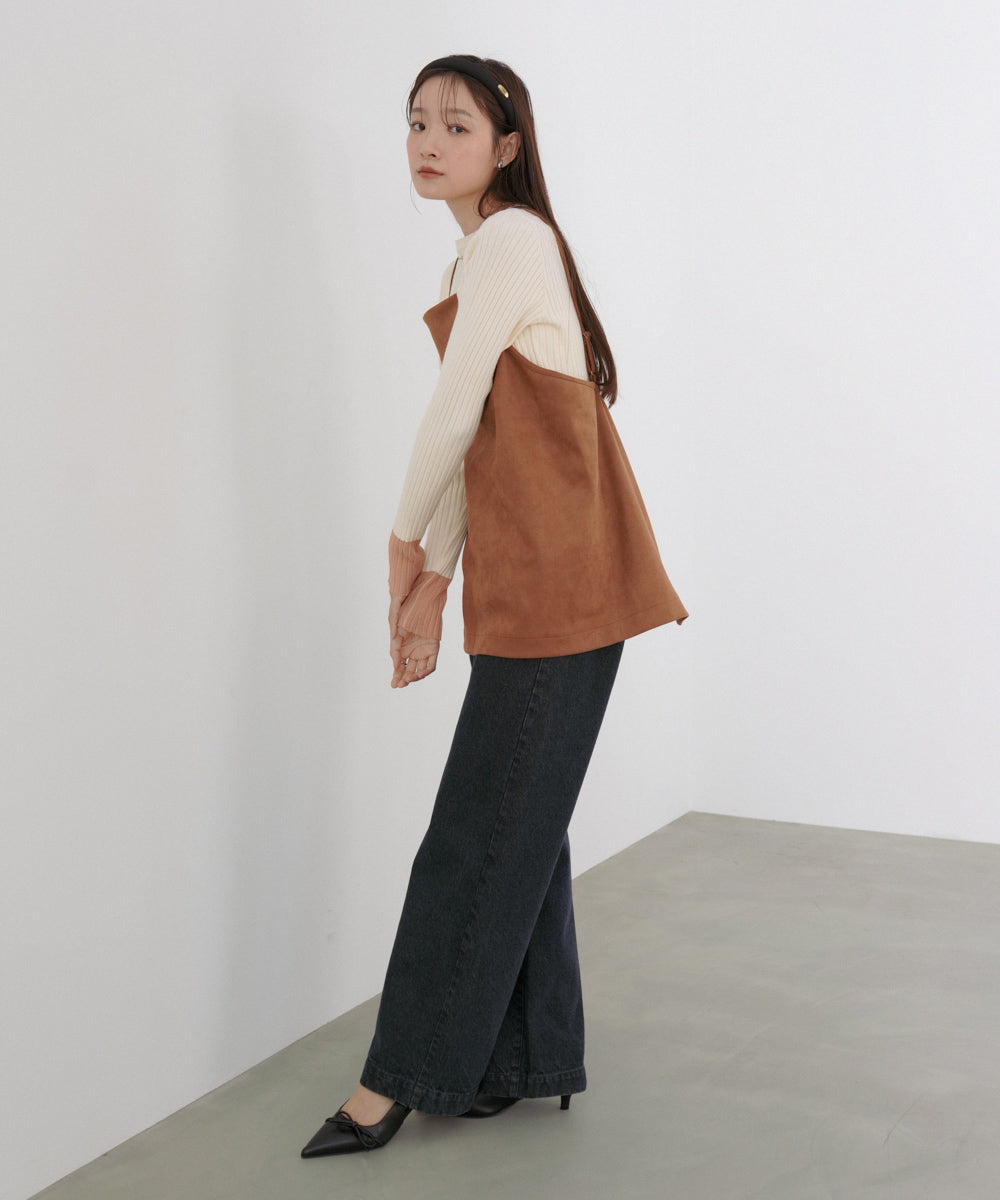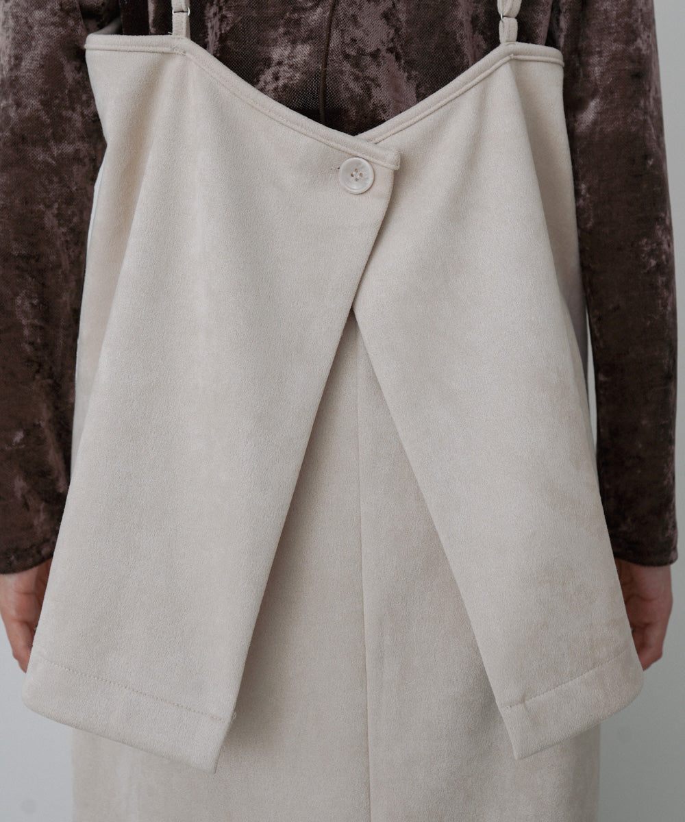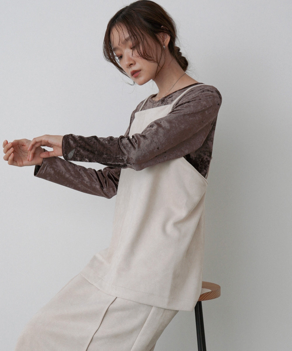 バックデザインが一癖あるビスチェが登場!スウェード生地を使うことでより秋らしい雰囲気を演出してくれます。フロントデザインはシンプルですが、バック部分が広がるようなデザインになっています。薄手のカットソーと合わせて着ていただくのがおすすめです。