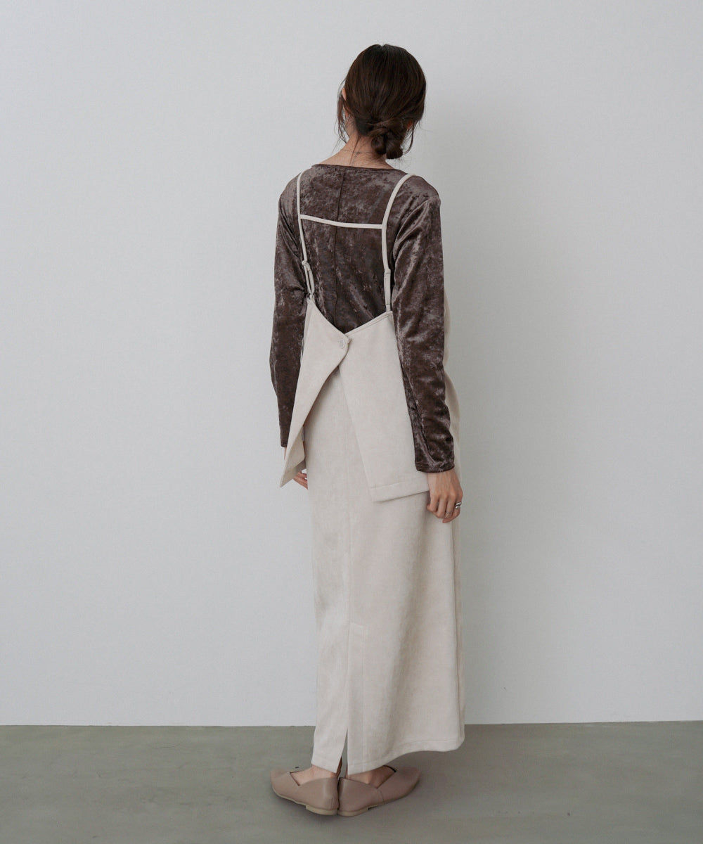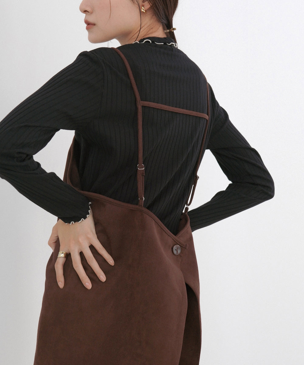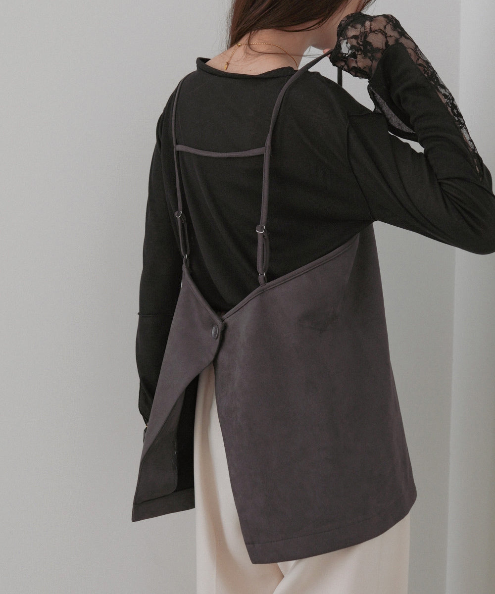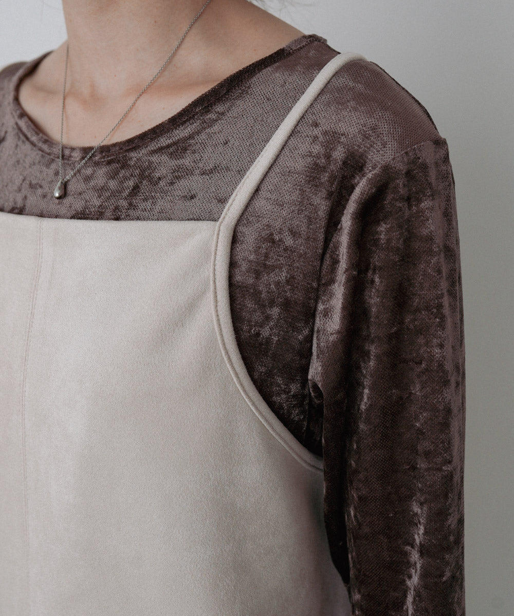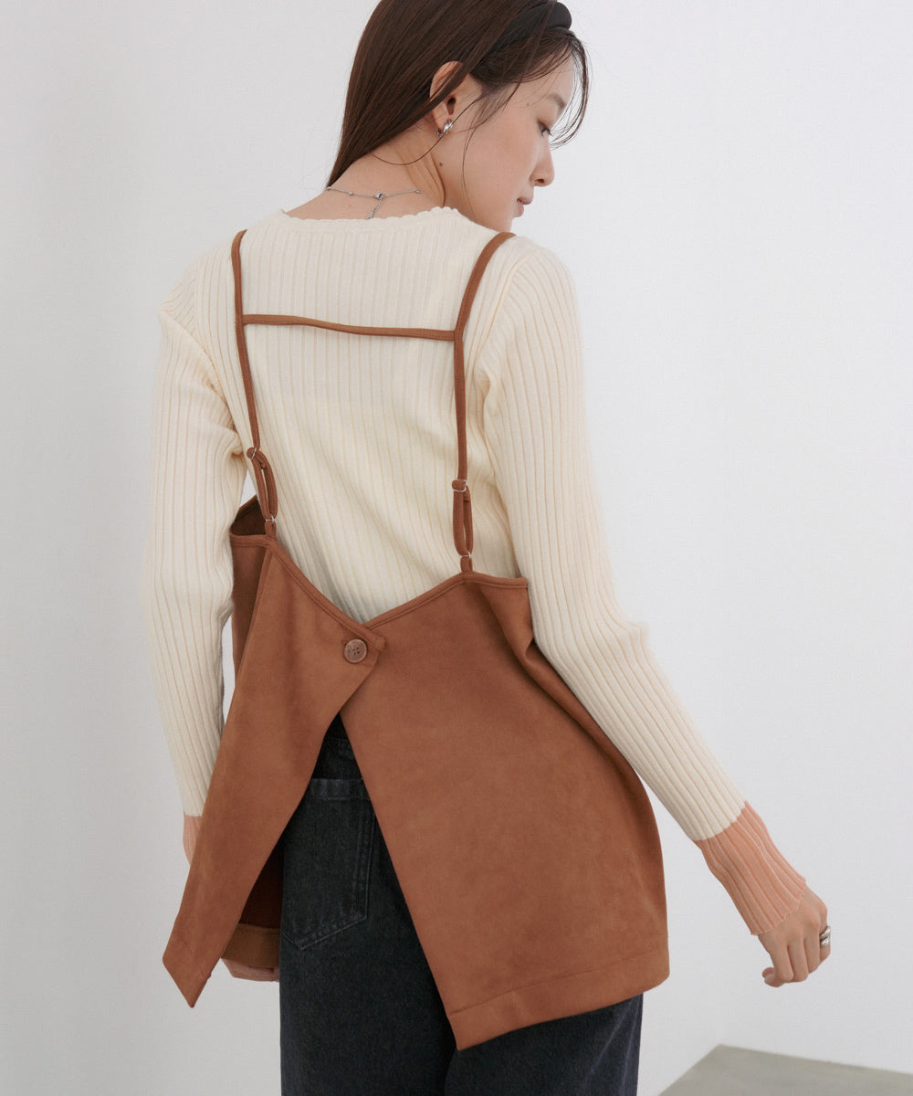 バックデザインが一癖あるビスチェが登場!スウェード生地を使うことでより秋らしい雰囲気を演出してくれます。フロントデザインはシンプルですが、バック部分が広がるようなデザインになっています。薄手のカットソーと合わせて着ていただくのがおすすめです。