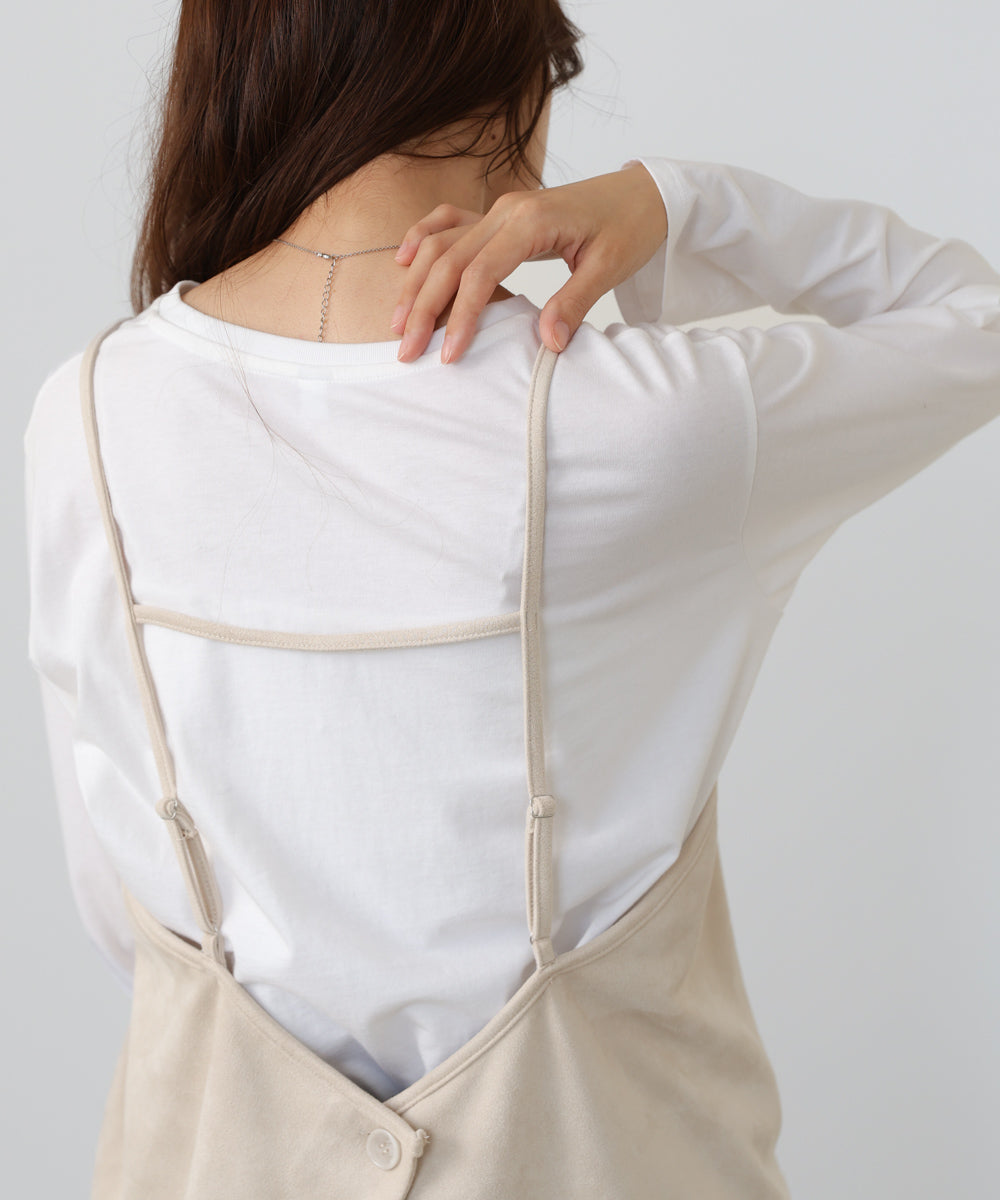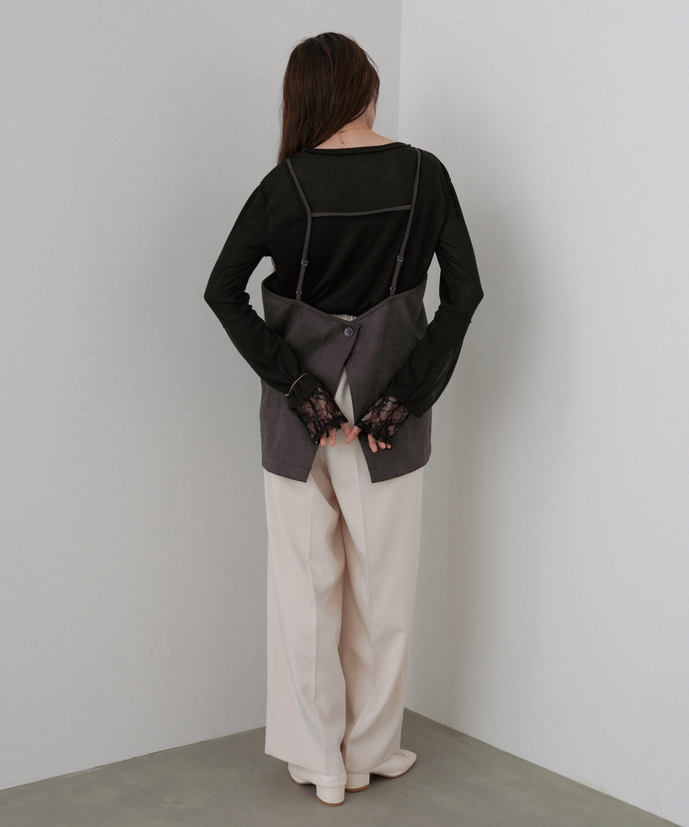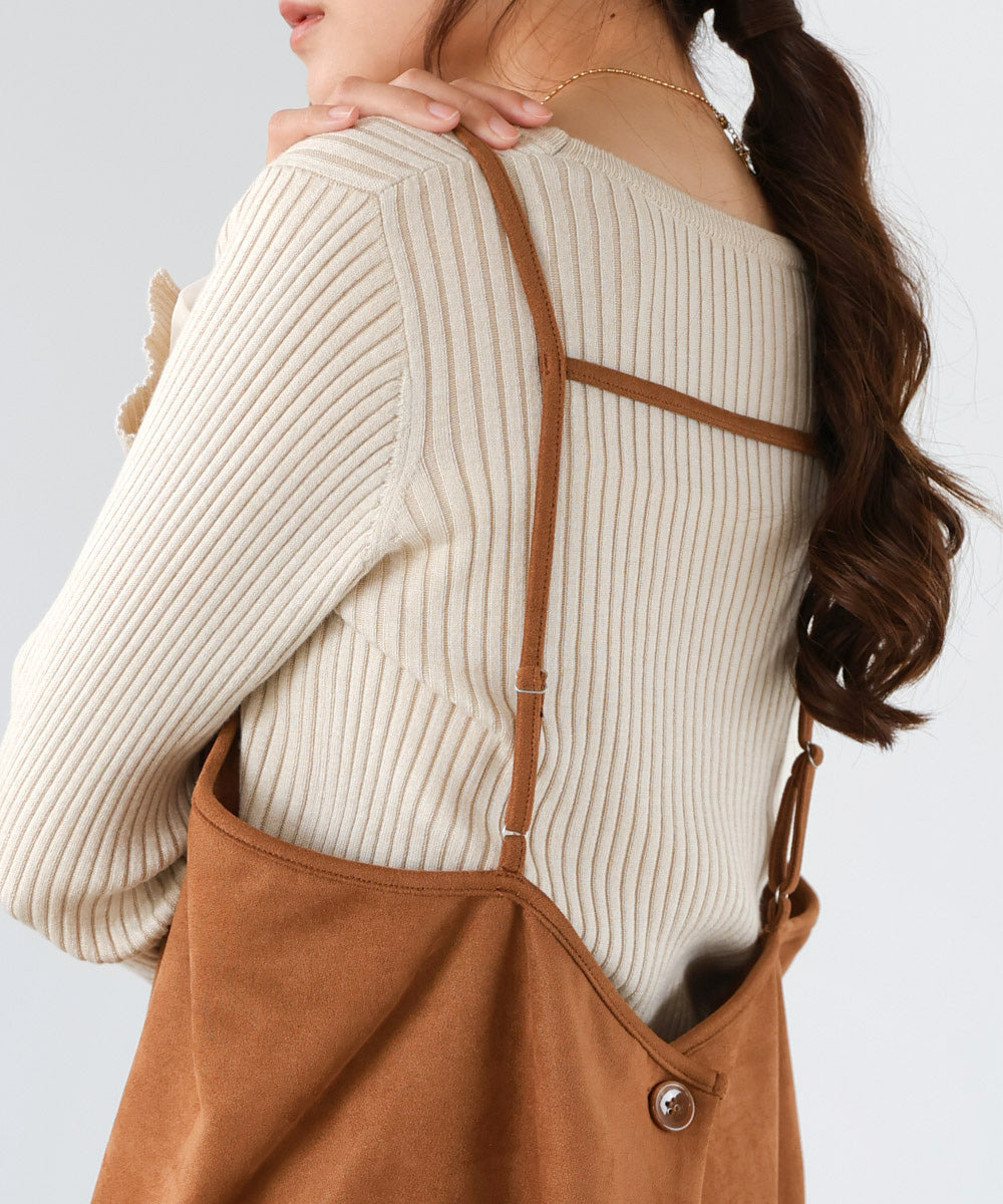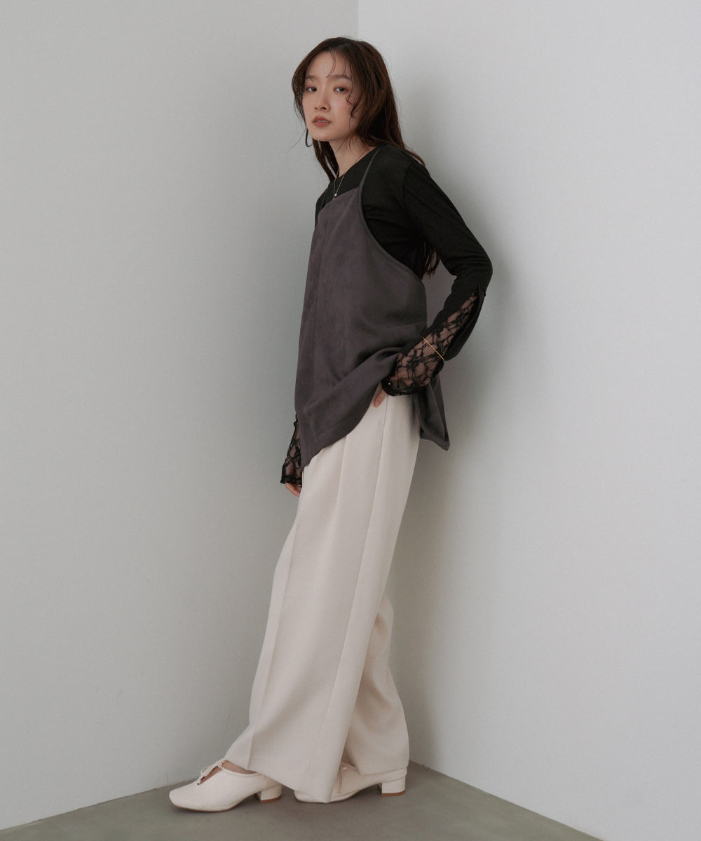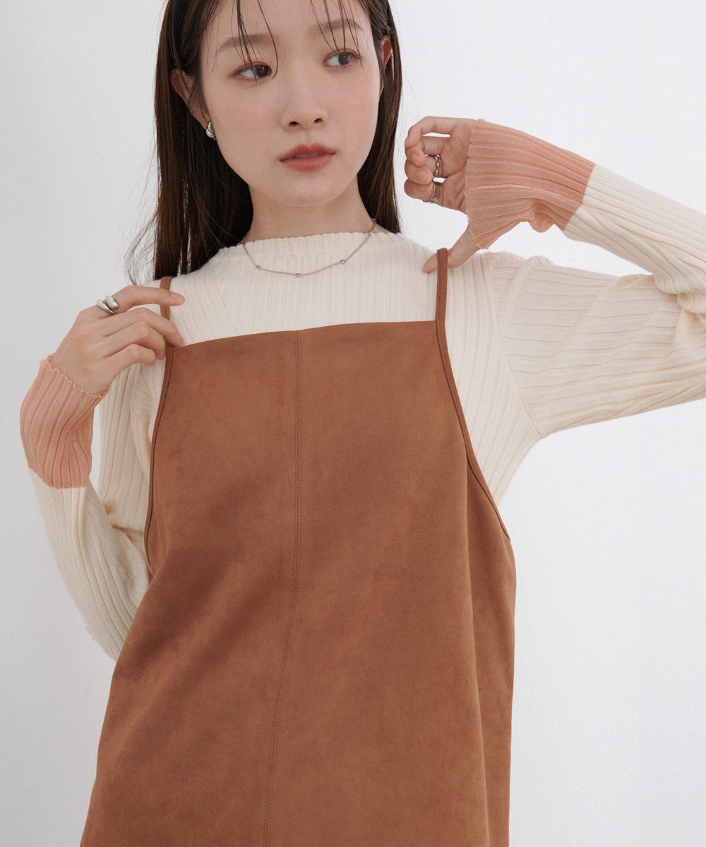 バックデザインが一癖あるビスチェが登場!スウェード生地を使うことでより秋らしい雰囲気を演出してくれます。フロントデザインはシンプルですが、バック部分が広がるようなデザインになっています。薄手のカットソーと合わせて着ていただくのがおすすめです。