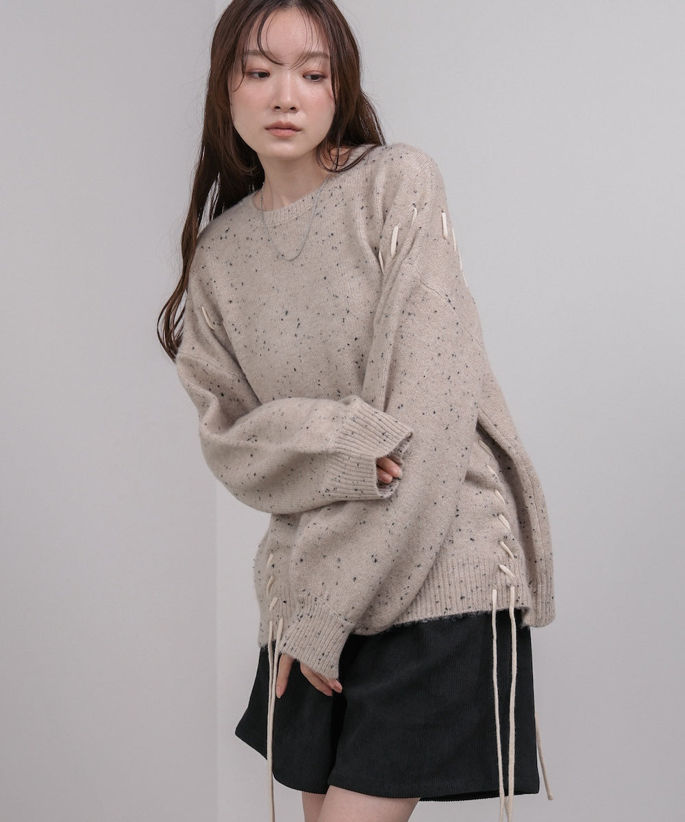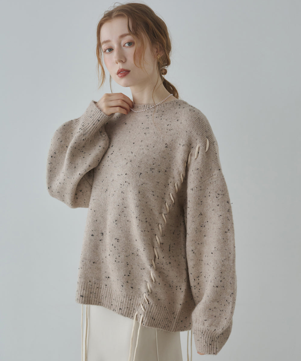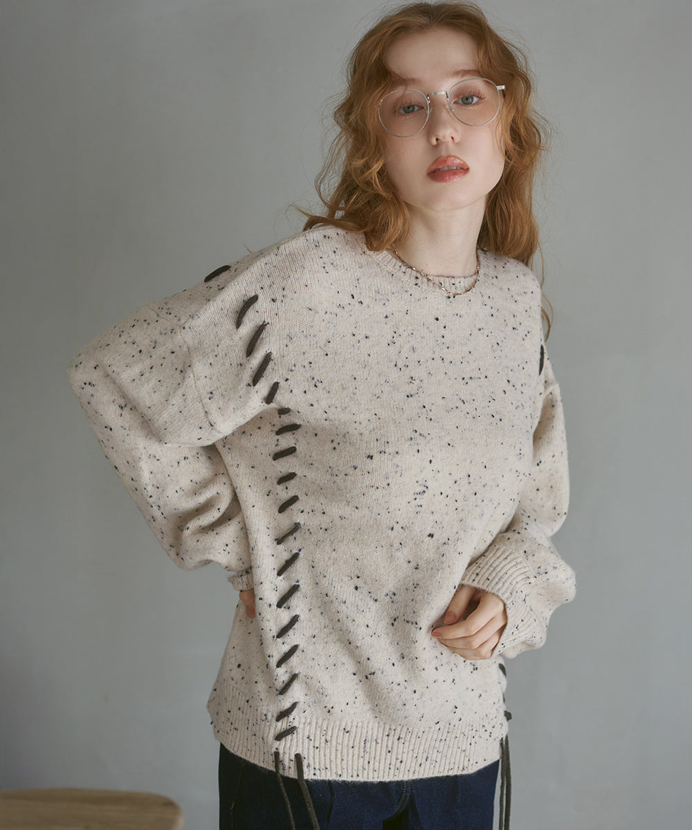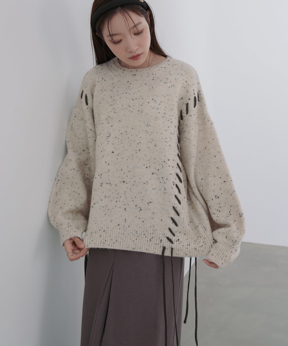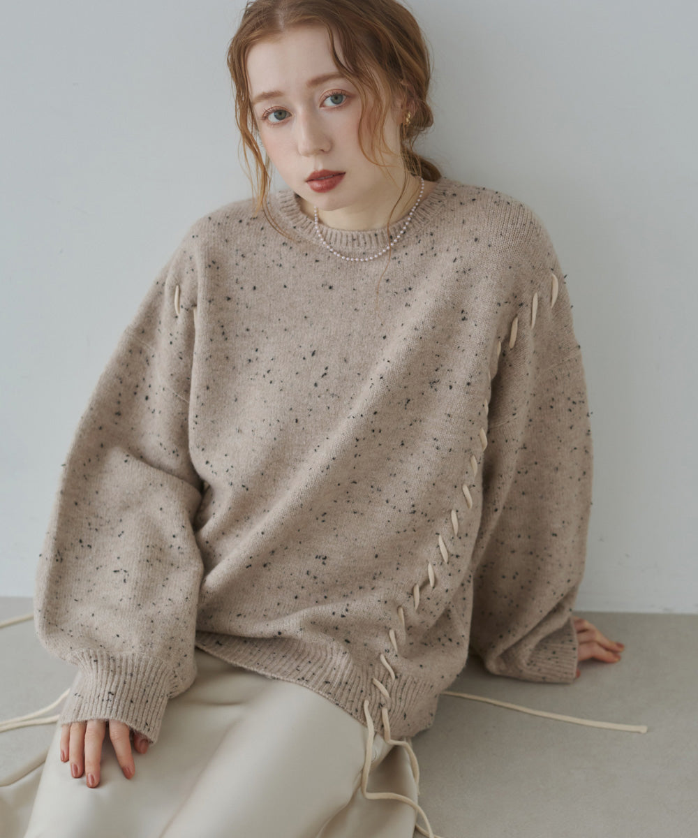 去年大人気だったチョコチップニットトップスが新しいカラーを加えて登場!ネップヤーンの暖かみがシーズンムード満載なニットトップス!控えめに浮き出た表面感が、まるでチョコチップのような可愛らしいルックスです。ショルダー部分から施された編み上げのデザインが目を惹くアクセントになり、1枚でお召し頂いても華やかさ際立つディティールに。ルーズなシルエットがフェミニンさを引き立て、大人女子のカジュアルスタイルをさらにブラッシュアップしてくれるアイテムになりました。