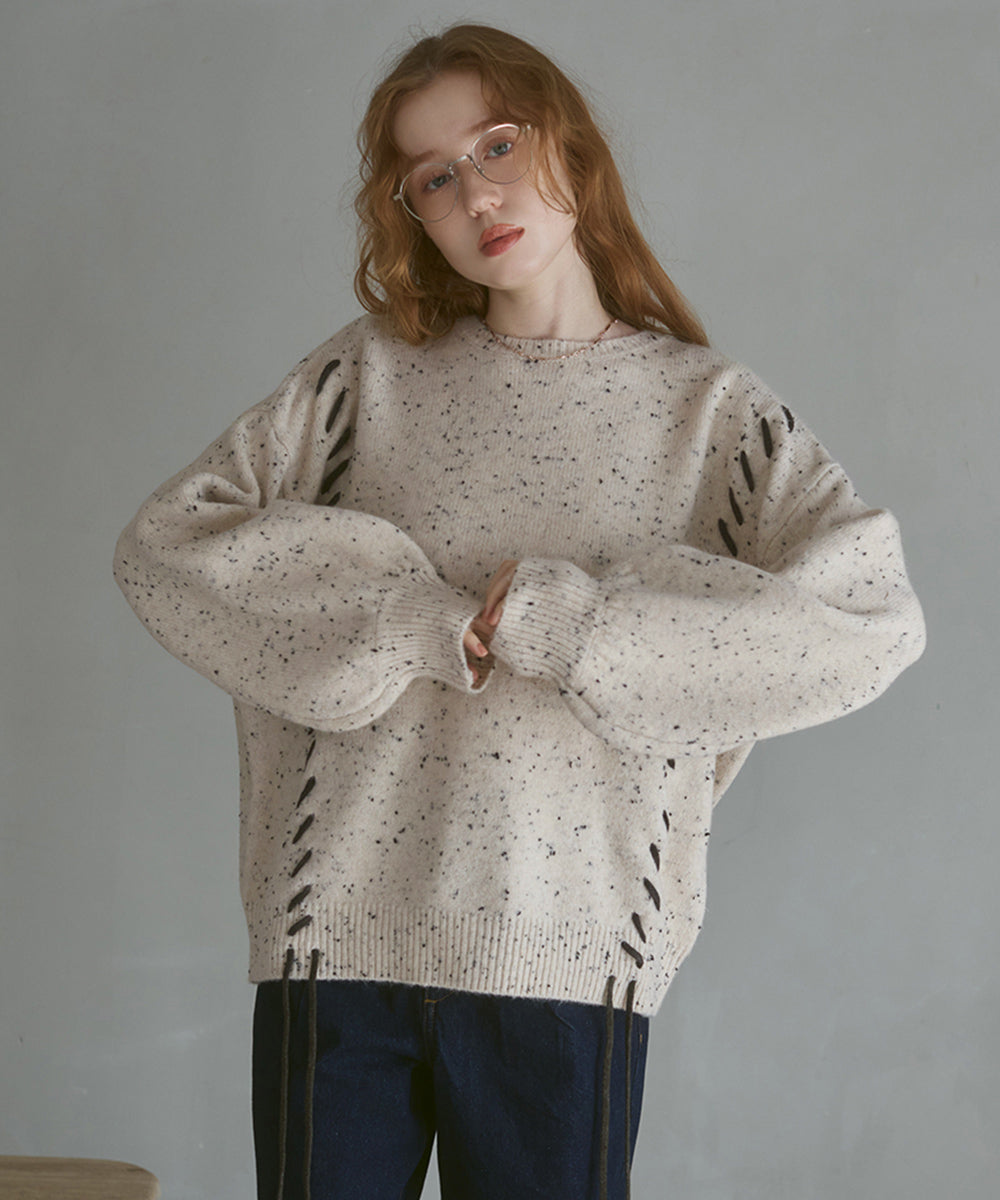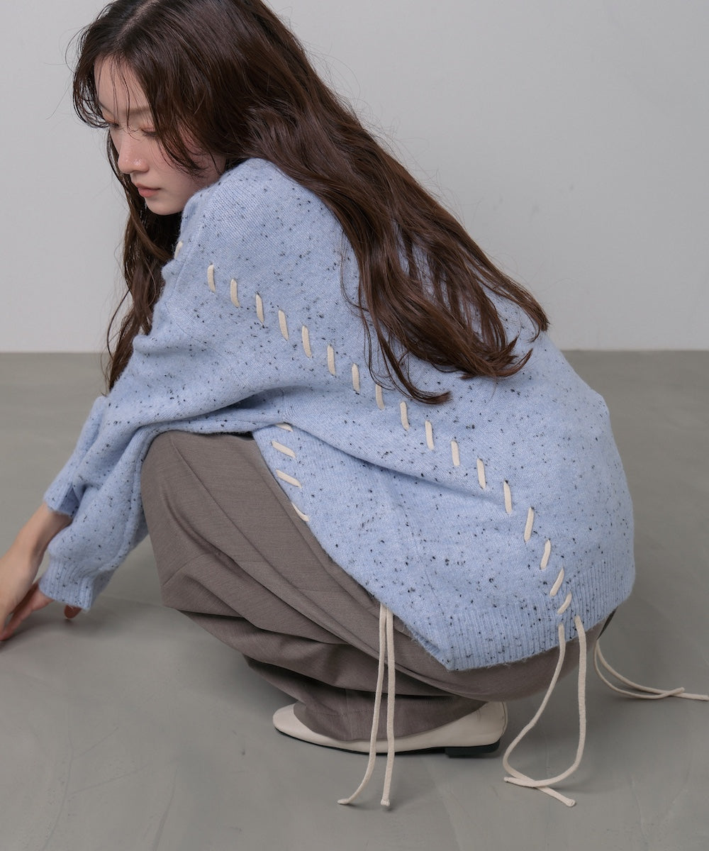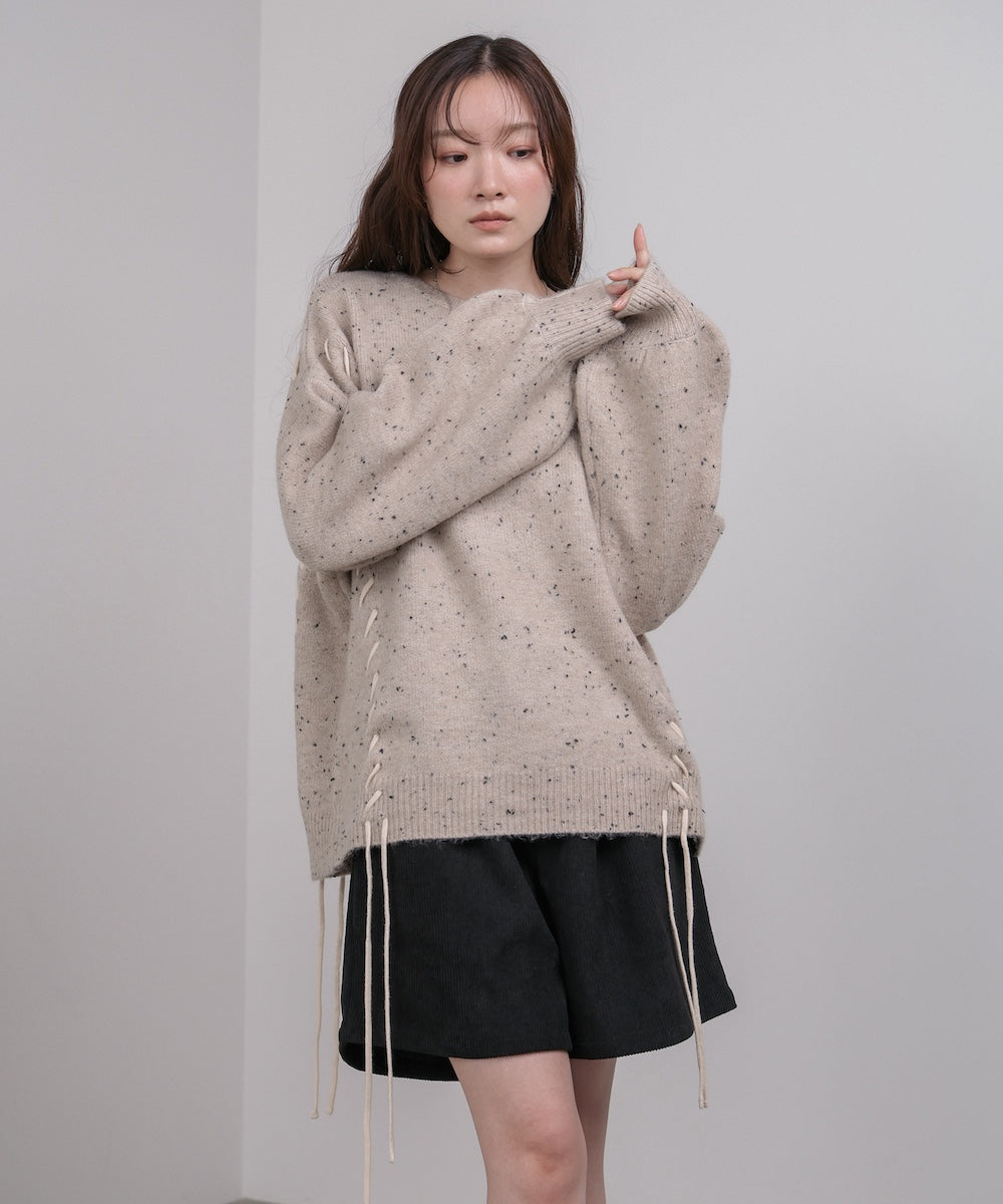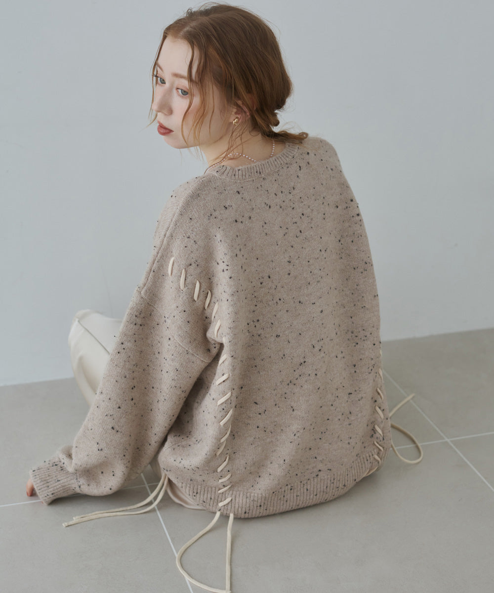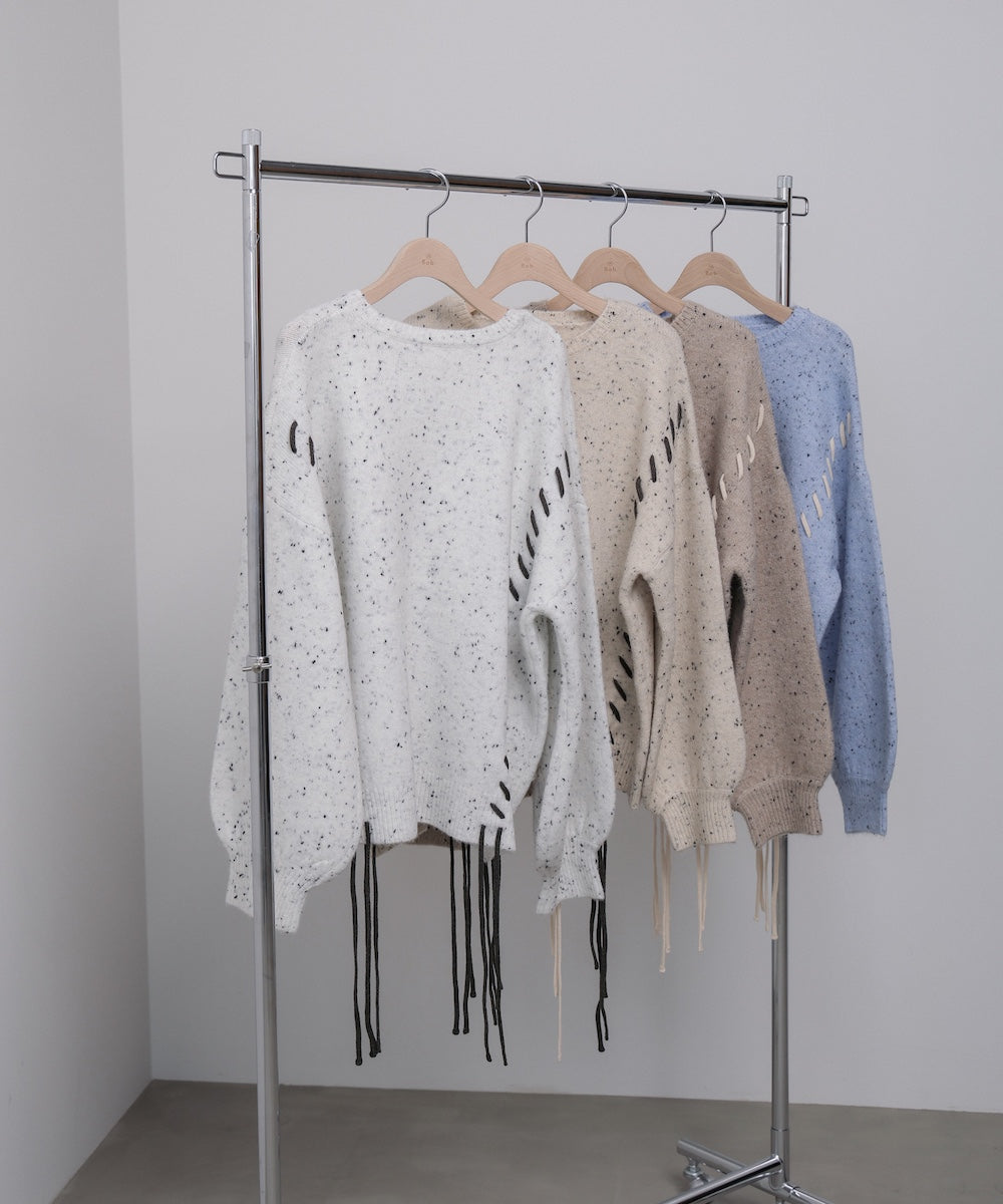 去年大人気だったチョコチップニットトップスが新しいカラーを加えて登場!ネップヤーンの暖かみがシーズンムード満載なニットトップス!控えめに浮き出た表面感が、まるでチョコチップのような可愛らしいルックスです。ショルダー部分から施された編み上げのデザインが目を惹くアクセントになり、1枚でお召し頂いても華やかさ際立つディティールに。ルーズなシルエットがフェミニンさを引き立て、大人女子のカジュアルスタイルをさらにブラッシュアップしてくれるアイテムになりました。