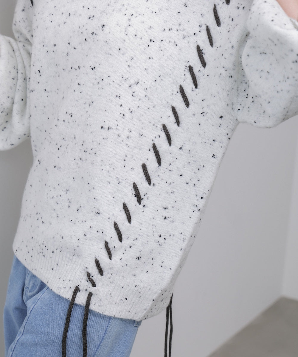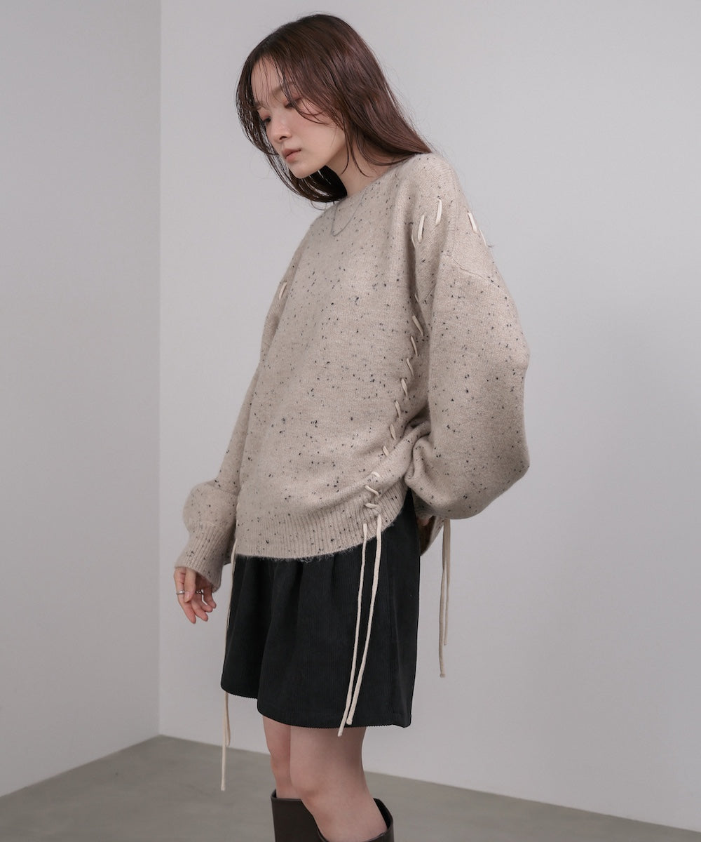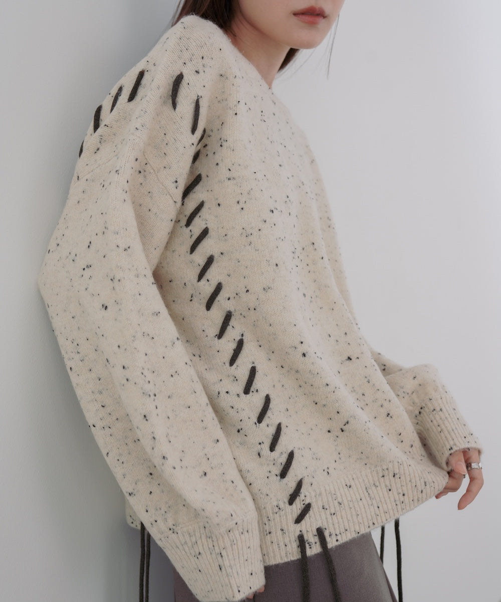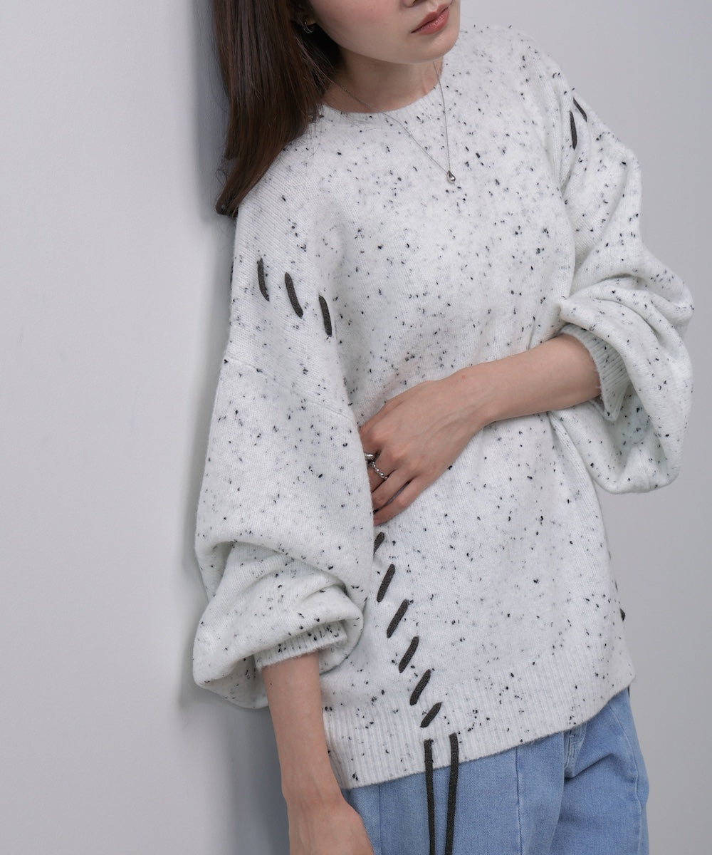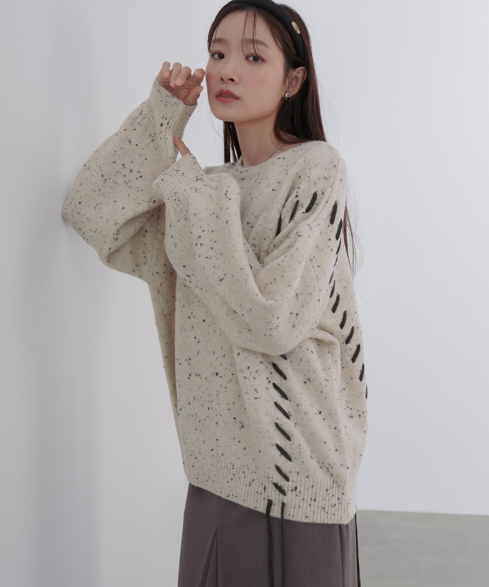 去年大人気だったチョコチップニットトップスが新しいカラーを加えて登場!ネップヤーンの暖かみがシーズンムード満載なニットトップス!控えめに浮き出た表面感が、まるでチョコチップのような可愛らしいルックスです。ショルダー部分から施された編み上げのデザインが目を惹くアクセントになり、1枚でお召し頂いても華やかさ際立つディティールに。ルーズなシルエットがフェミニンさを引き立て、大人女子のカジュアルスタイルをさらにブラッシュアップしてくれるアイテムになりました。