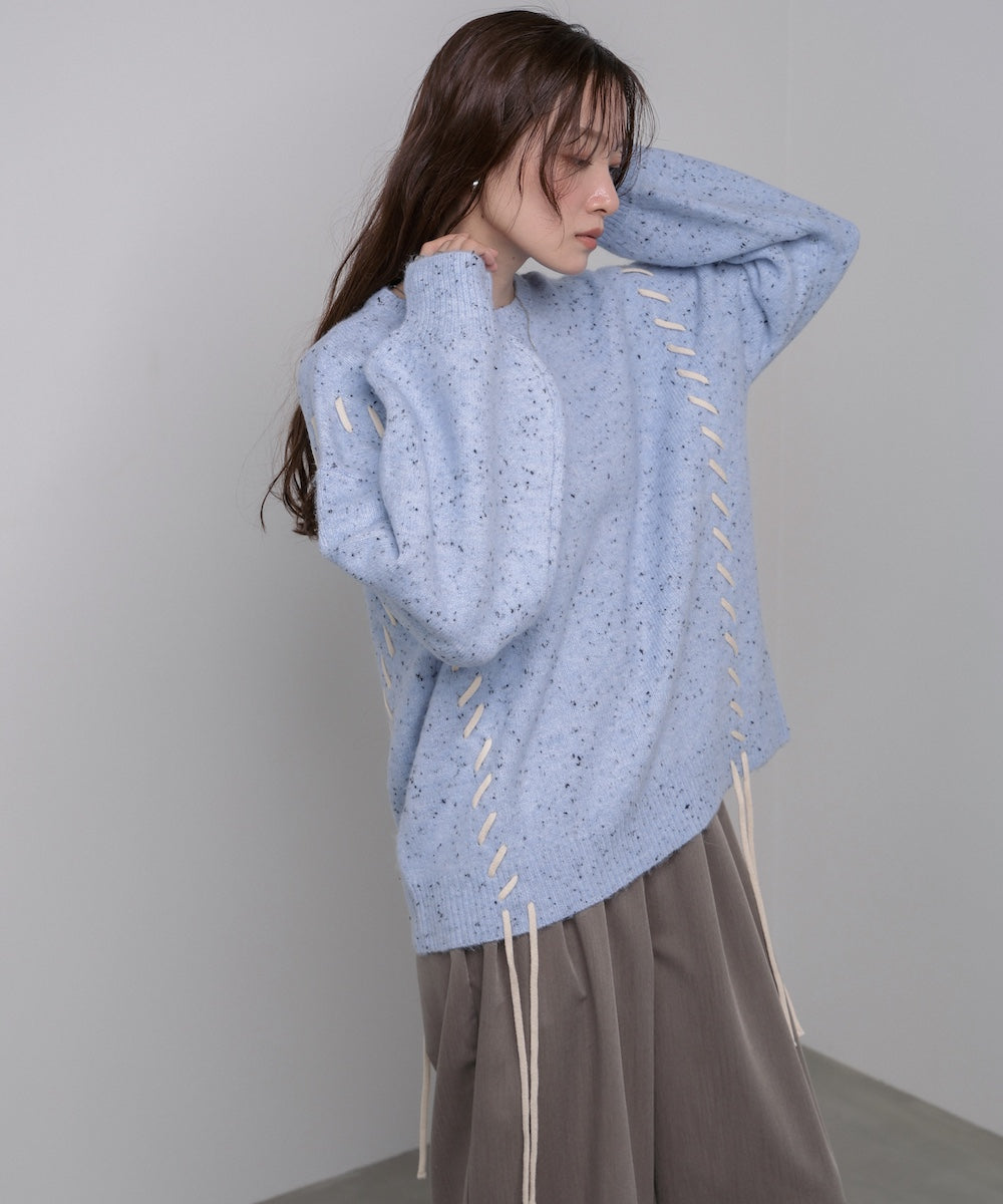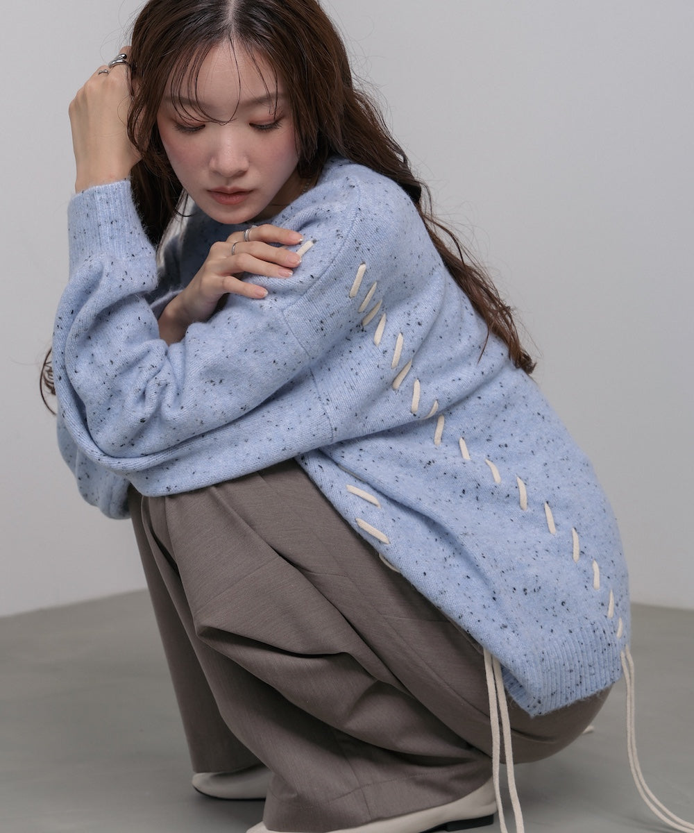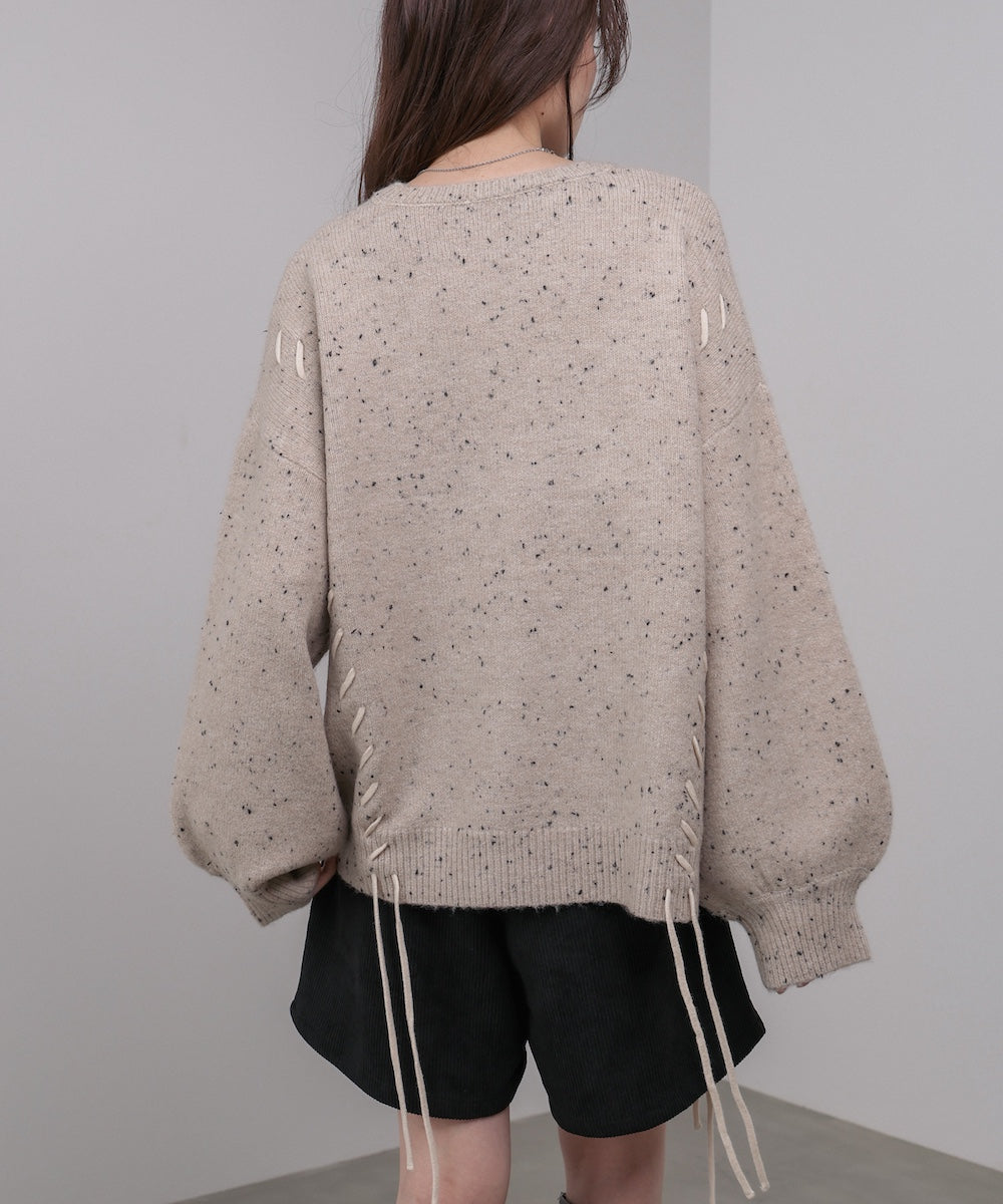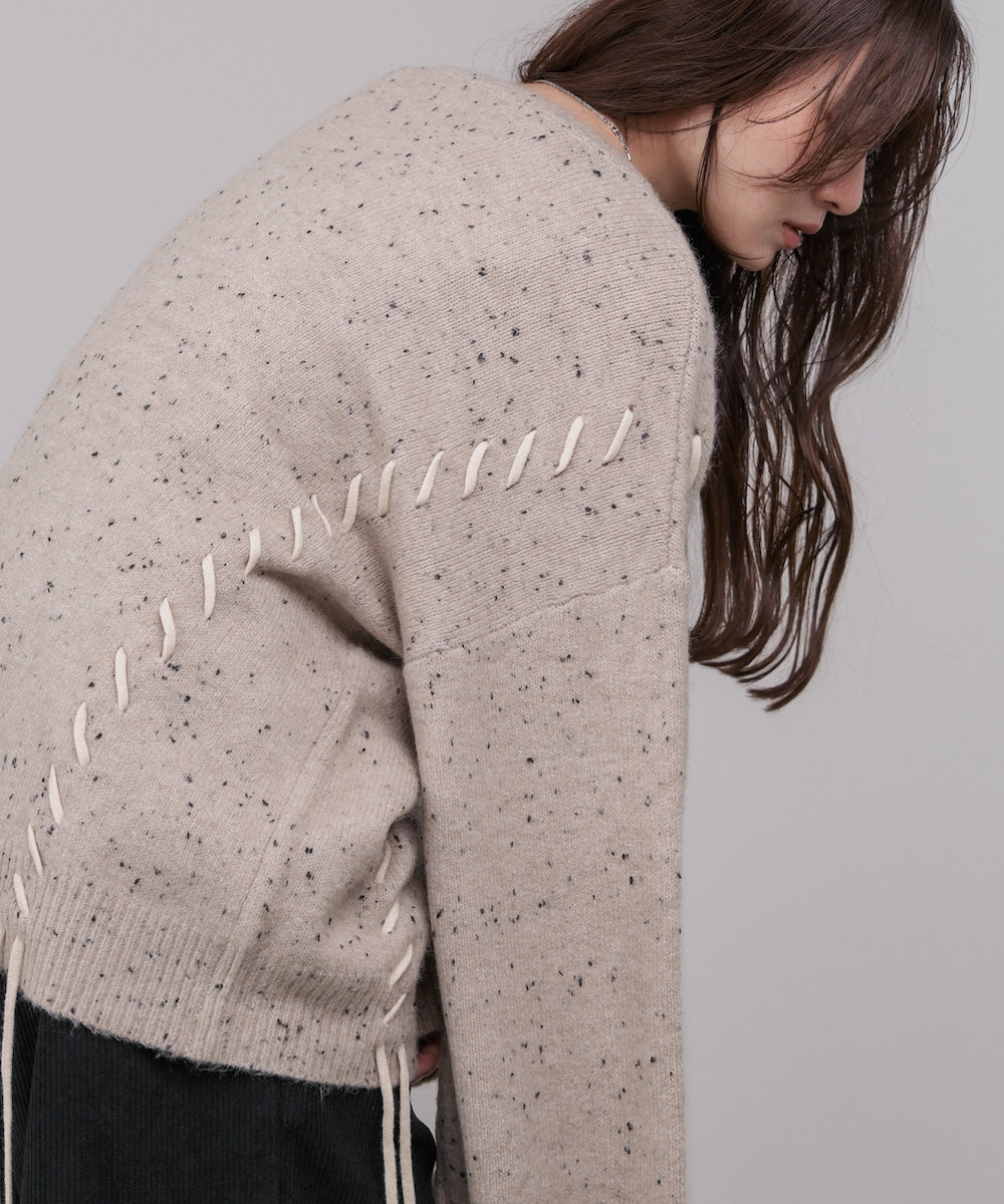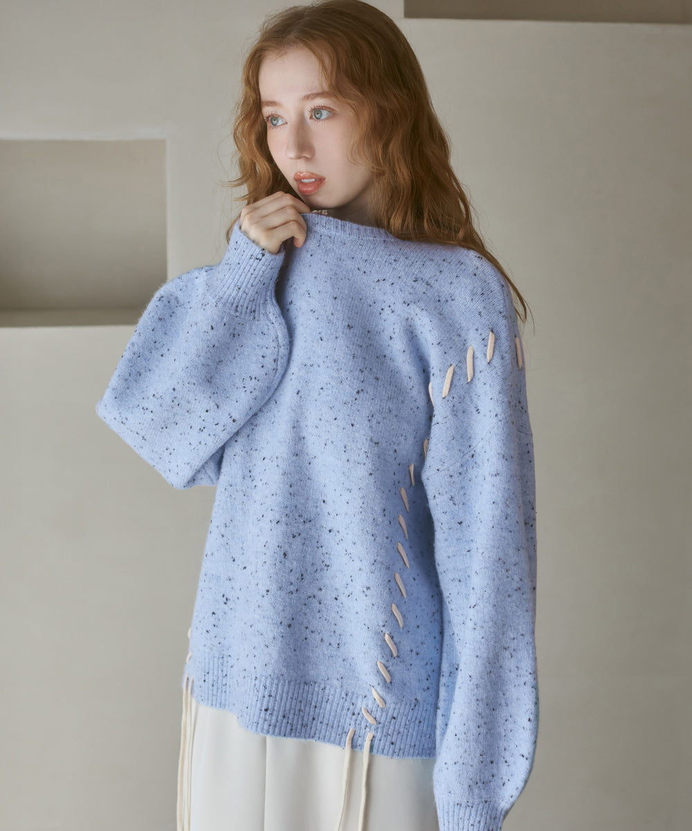 去年大人気だったチョコチップニットトップスが新しいカラーを加えて登場!ネップヤーンの暖かみがシーズンムード満載なニットトップス!控えめに浮き出た表面感が、まるでチョコチップのような可愛らしいルックスです。ショルダー部分から施された編み上げのデザインが目を惹くアクセントになり、1枚でお召し頂いても華やかさ際立つディティールに。ルーズなシルエットがフェミニンさを引き立て、大人女子のカジュアルスタイルをさらにブラッシュアップしてくれるアイテムになりました。