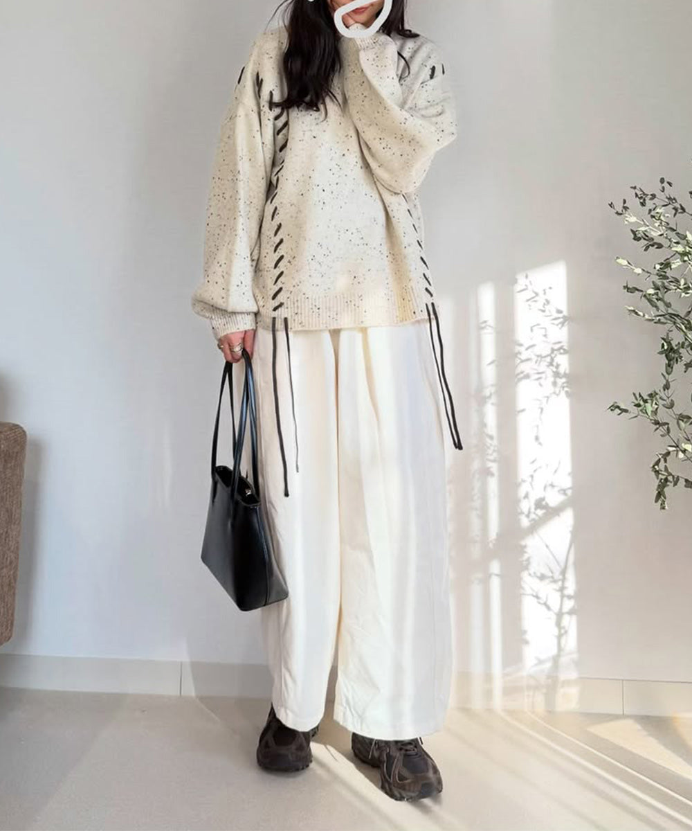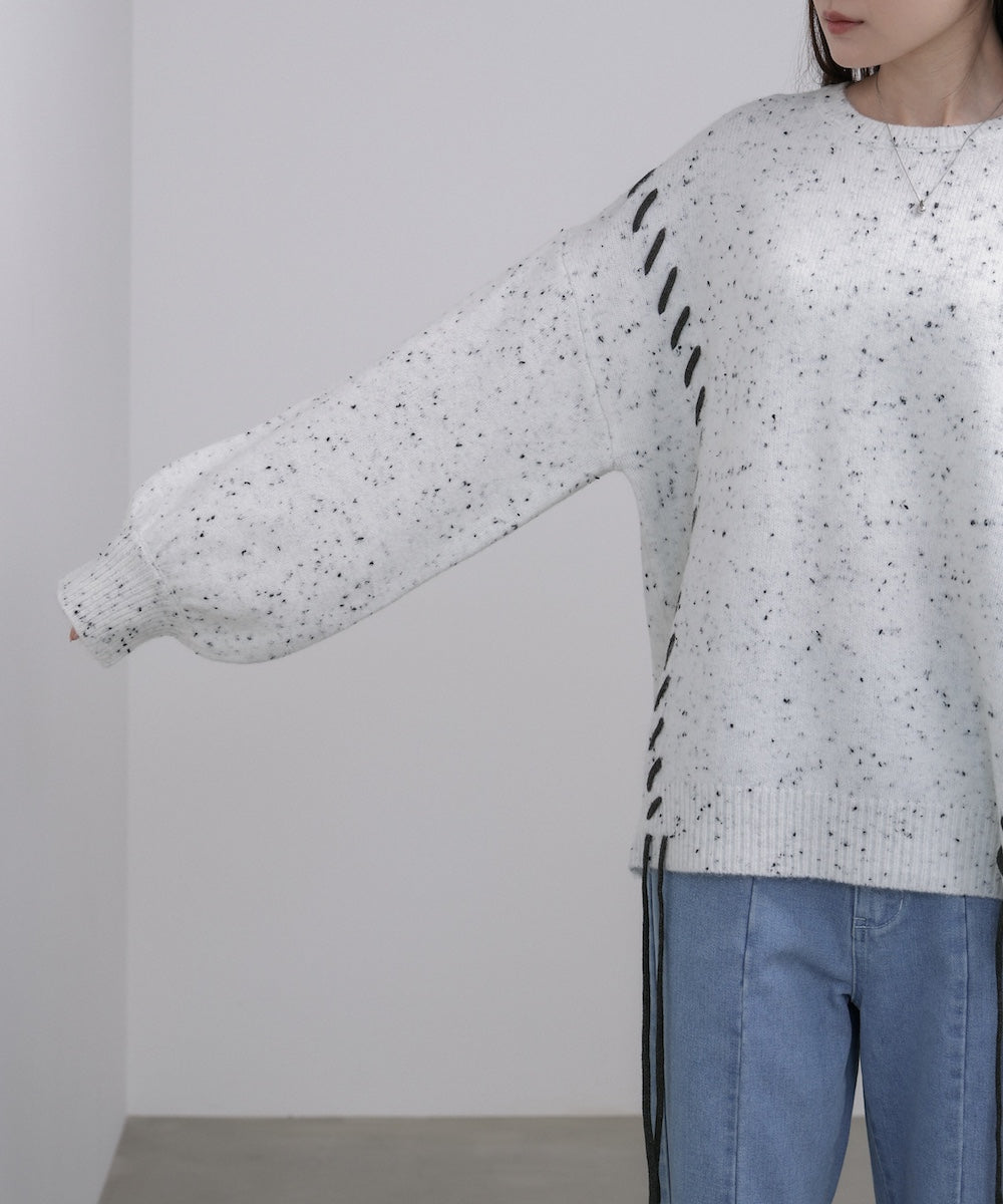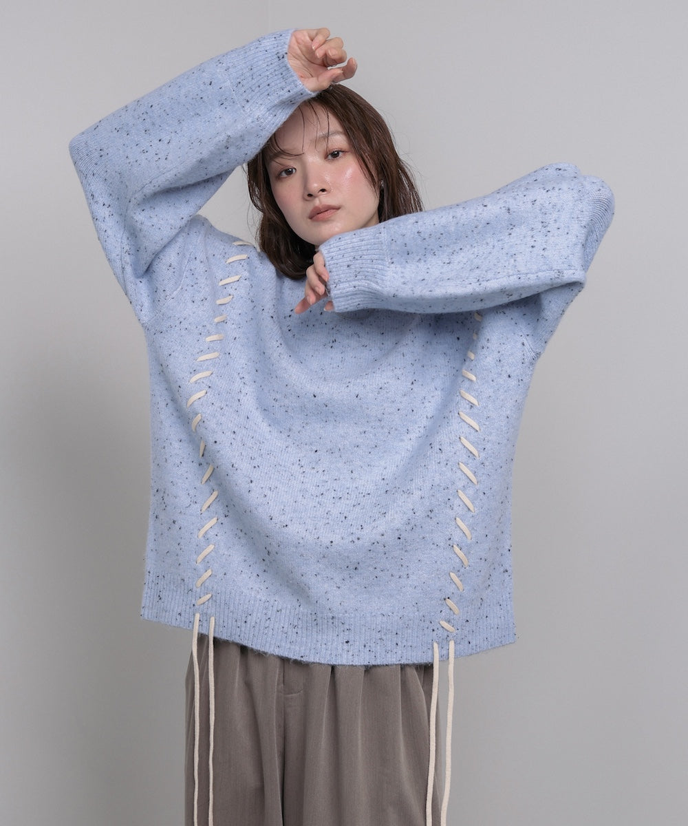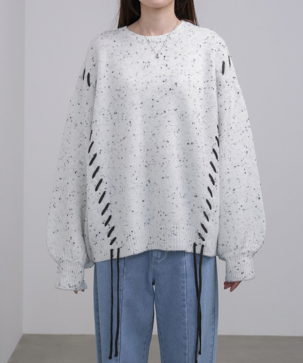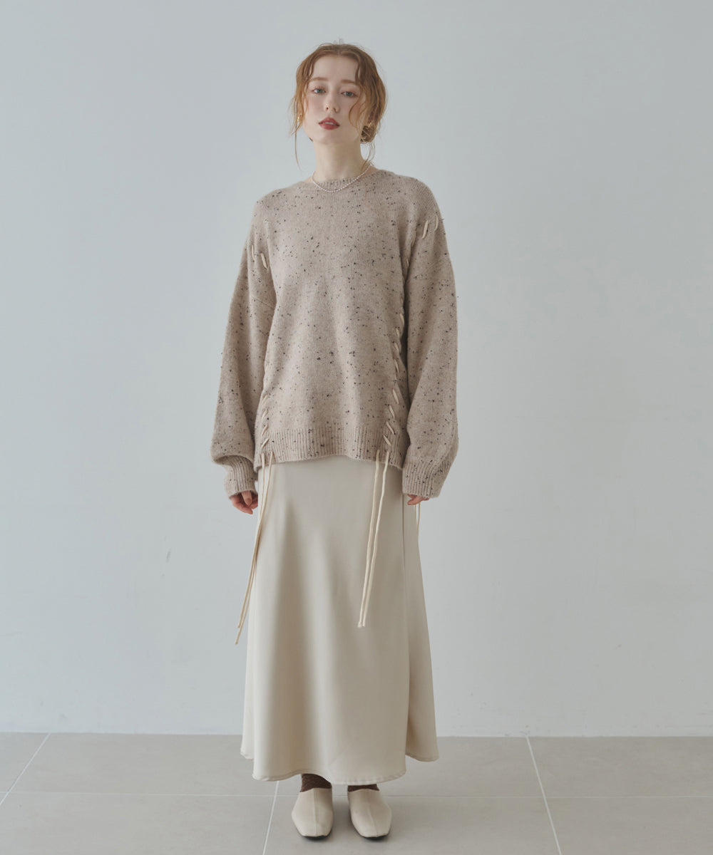 去年大人気だったチョコチップニットトップスが新しいカラーを加えて登場!ネップヤーンの暖かみがシーズンムード満載なニットトップス!控えめに浮き出た表面感が、まるでチョコチップのような可愛らしいルックスです。ショルダー部分から施された編み上げのデザインが目を惹くアクセントになり、1枚でお召し頂いても華やかさ際立つディティールに。ルーズなシルエットがフェミニンさを引き立て、大人女子のカジュアルスタイルをさらにブラッシュアップしてくれるアイテムになりました。