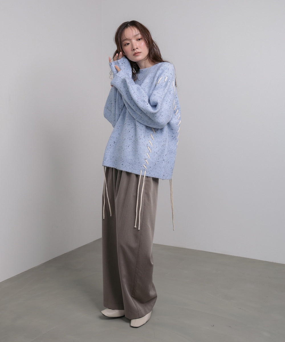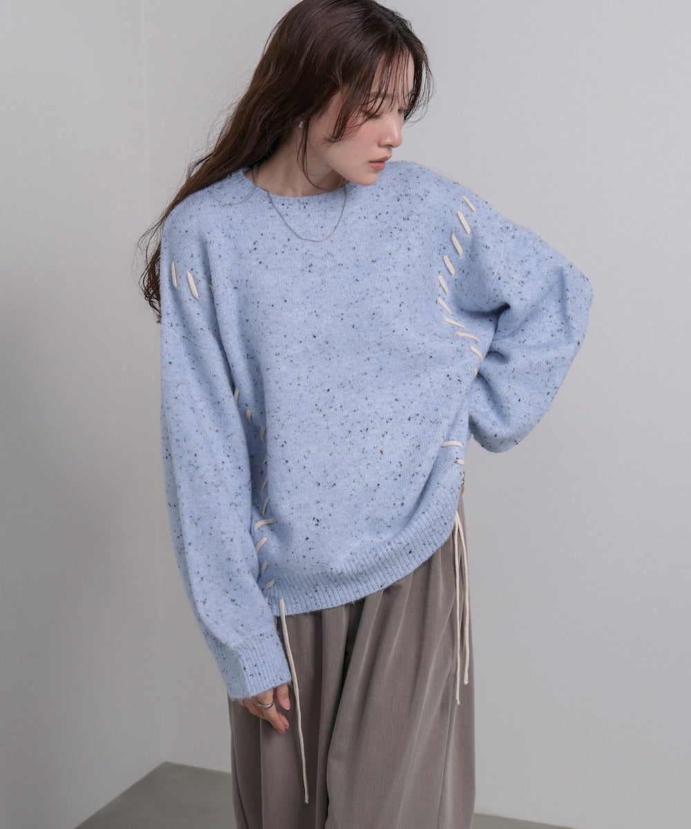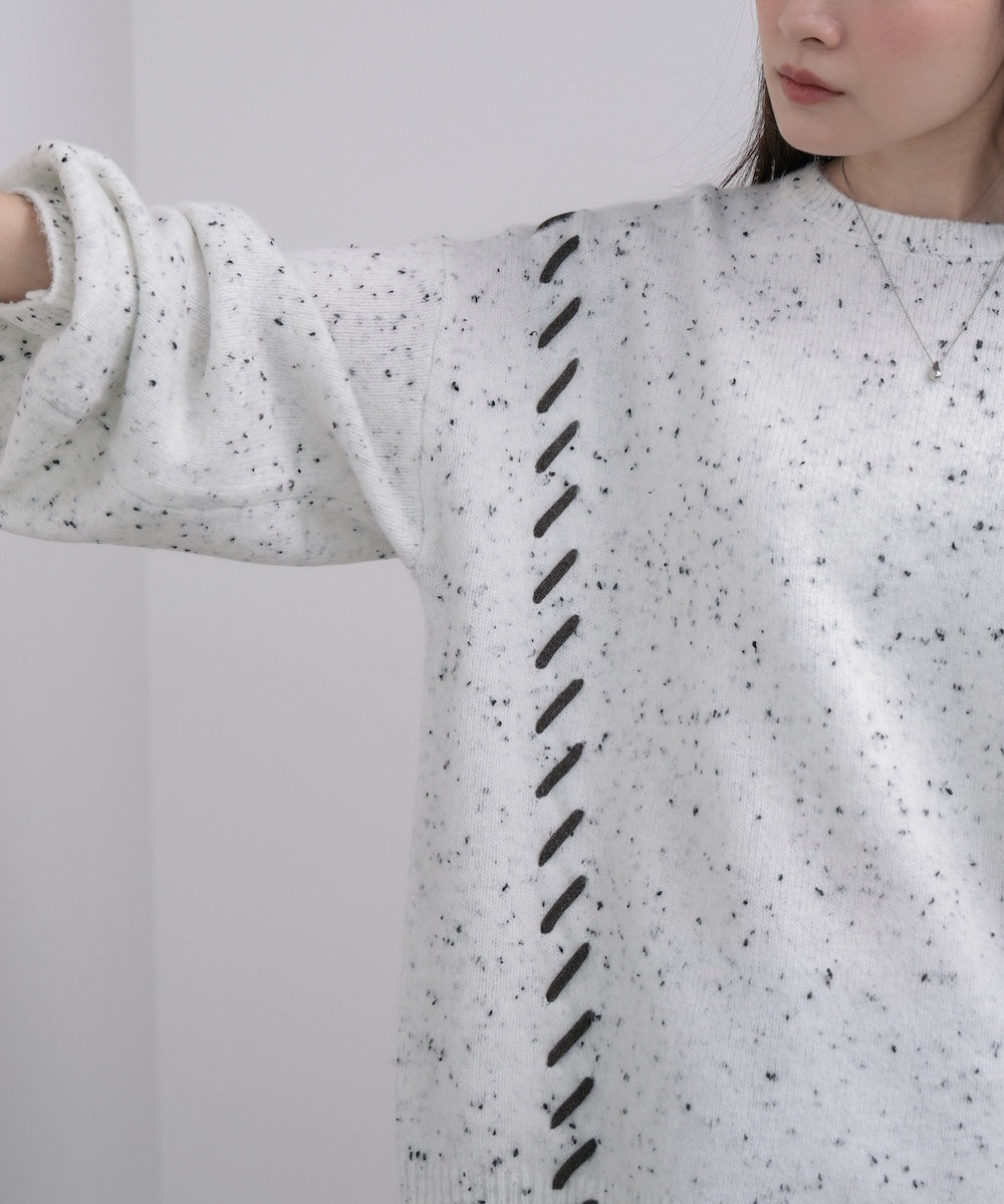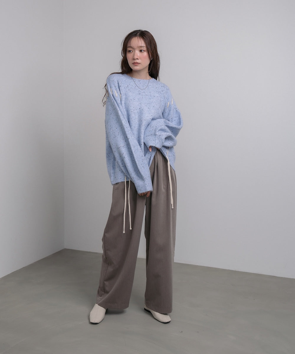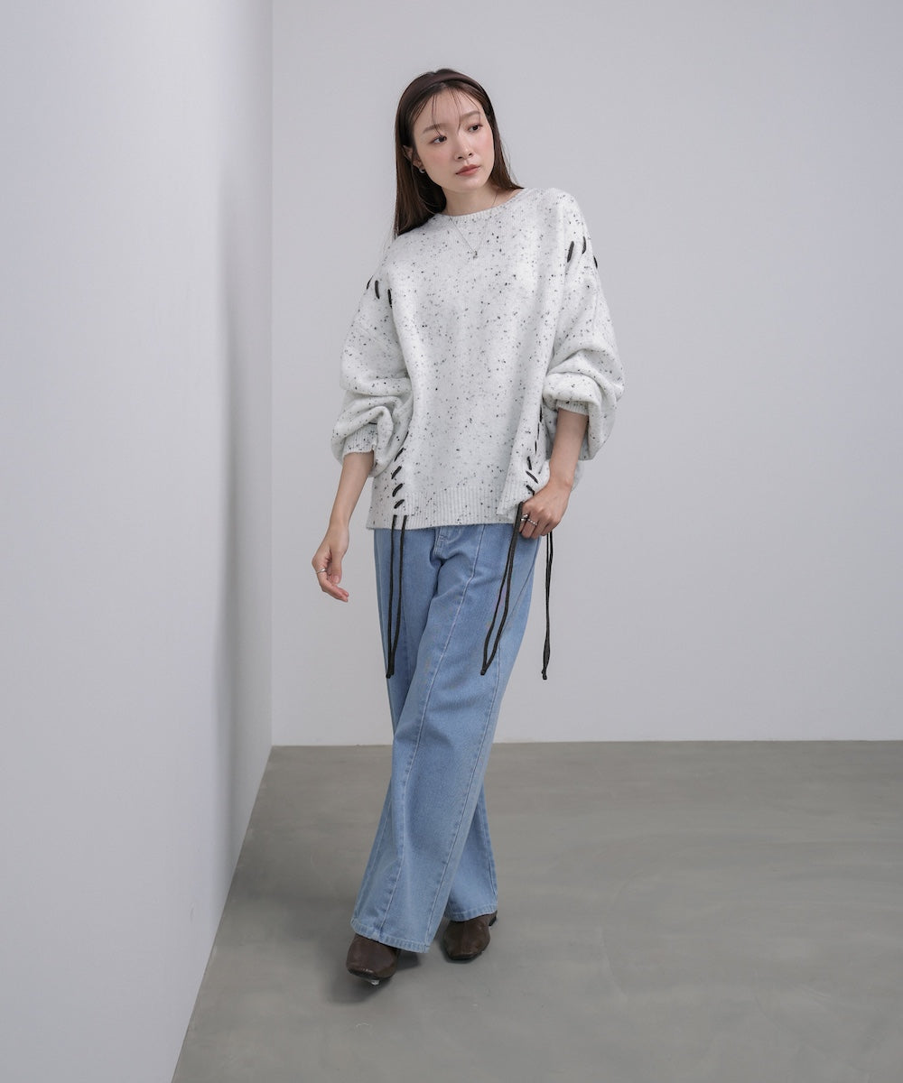 去年大人気だったチョコチップニットトップスが新しいカラーを加えて登場!ネップヤーンの暖かみがシーズンムード満載なニットトップス!控えめに浮き出た表面感が、まるでチョコチップのような可愛らしいルックスです。ショルダー部分から施された編み上げのデザインが目を惹くアクセントになり、1枚でお召し頂いても華やかさ際立つディティールに。ルーズなシルエットがフェミニンさを引き立て、大人女子のカジュアルスタイルをさらにブラッシュアップしてくれるアイテムになりました。