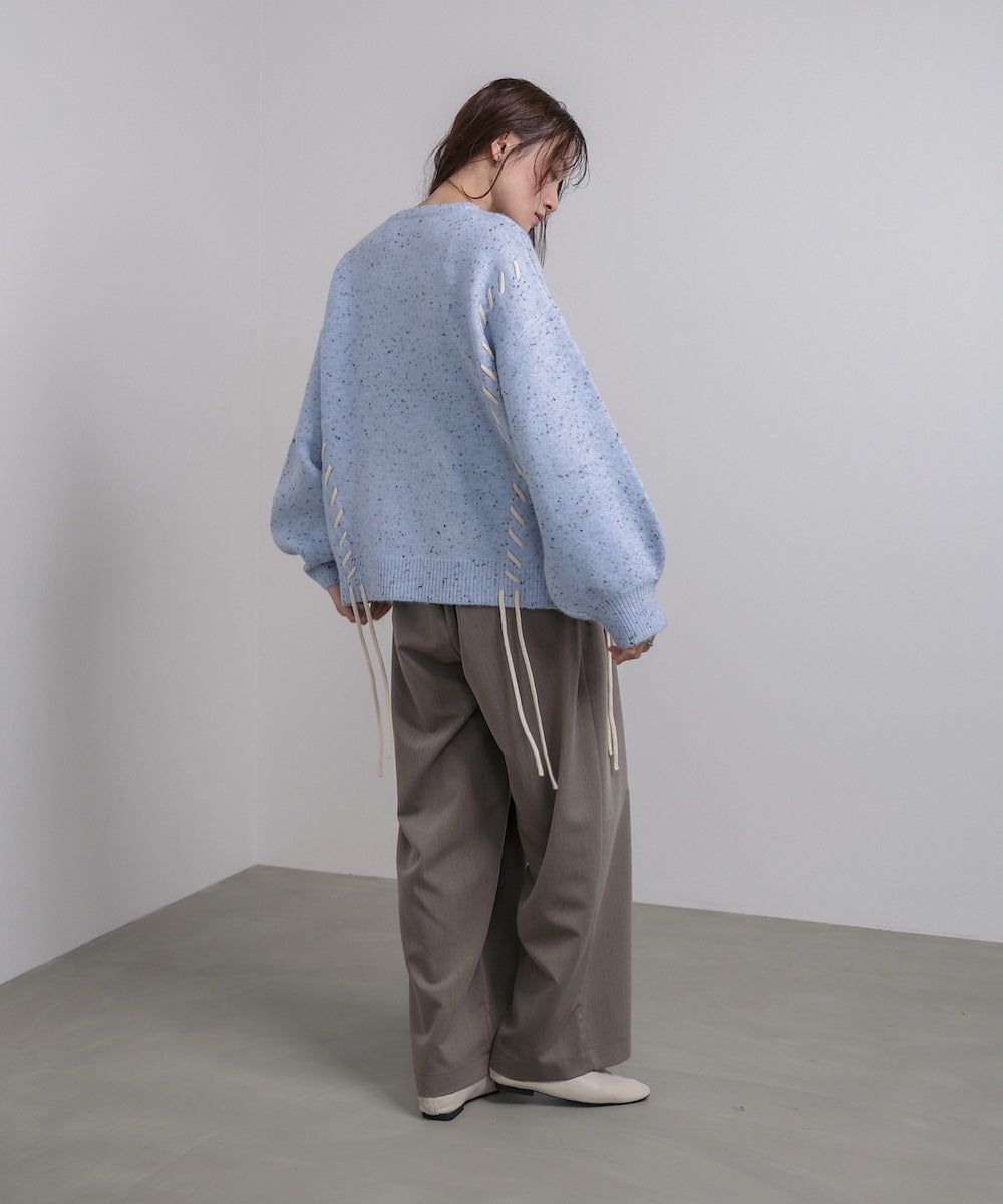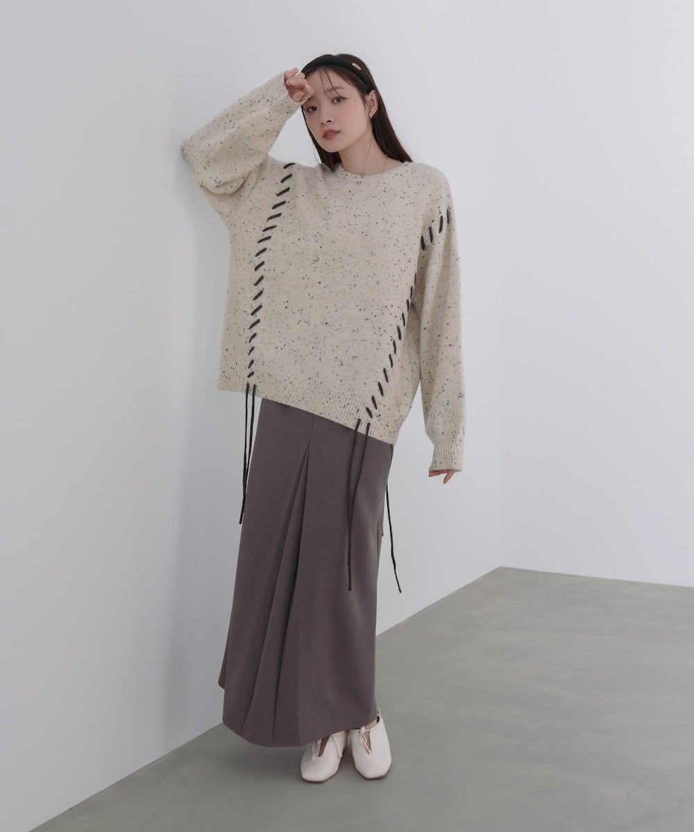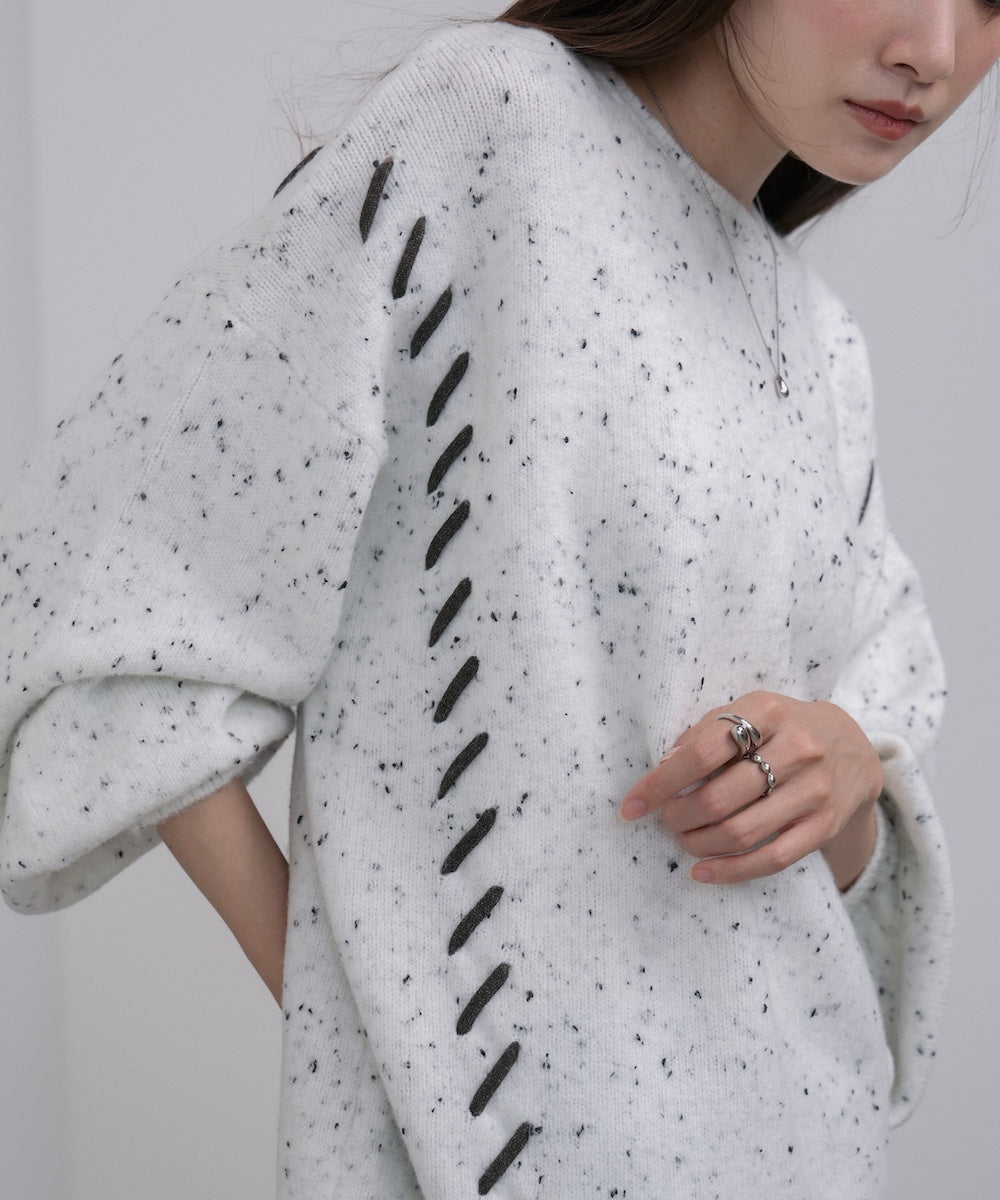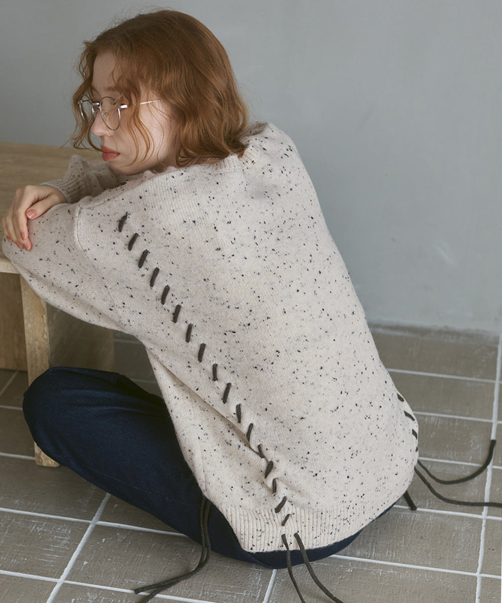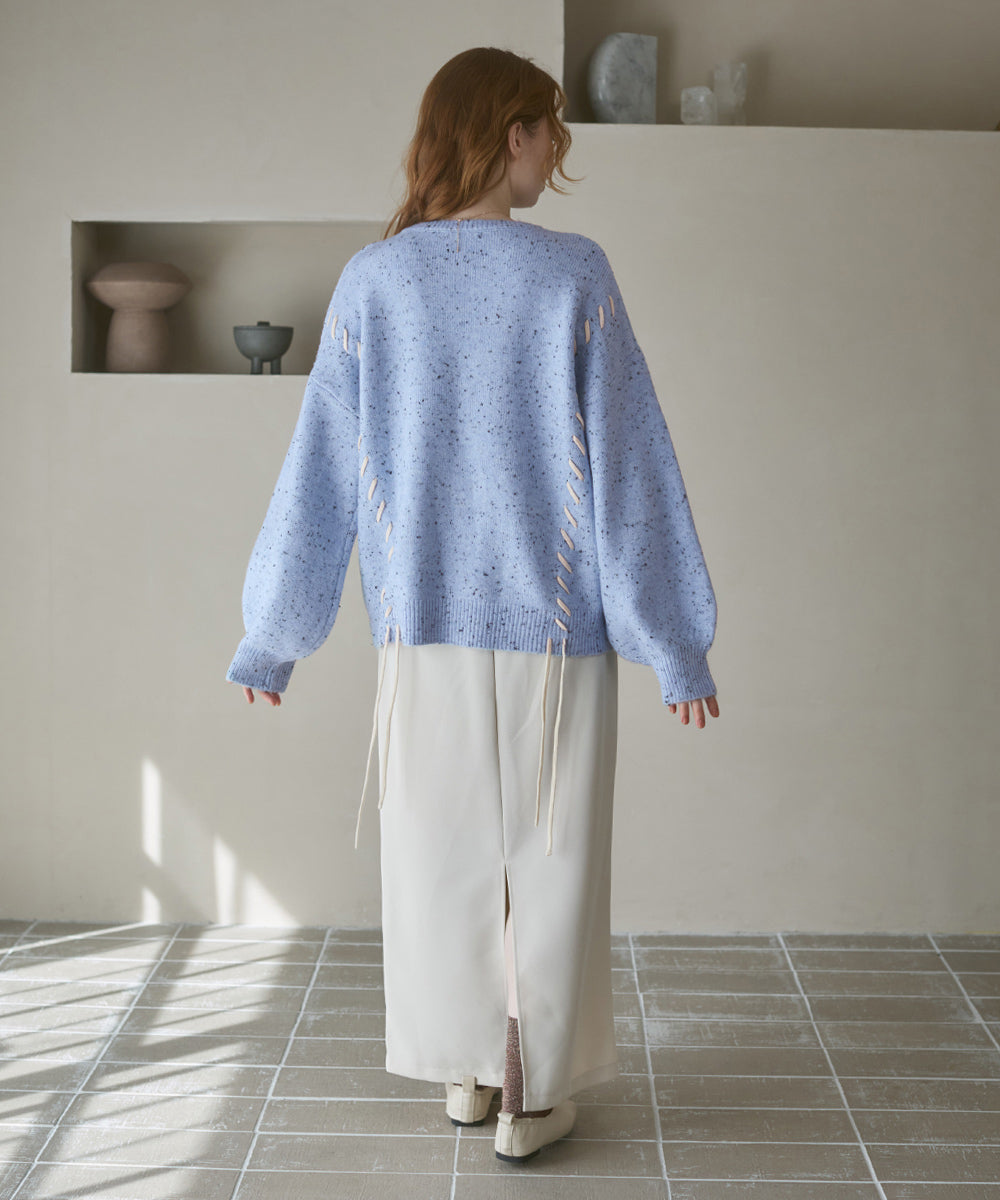 去年大人気だったチョコチップニットトップスが新しいカラーを加えて登場!ネップヤーンの暖かみがシーズンムード満載なニットトップス!控えめに浮き出た表面感が、まるでチョコチップのような可愛らしいルックスです。ショルダー部分から施された編み上げのデザインが目を惹くアクセントになり、1枚でお召し頂いても華やかさ際立つディティールに。ルーズなシルエットがフェミニンさを引き立て、大人女子のカジュアルスタイルをさらにブラッシュアップしてくれるアイテムになりました。