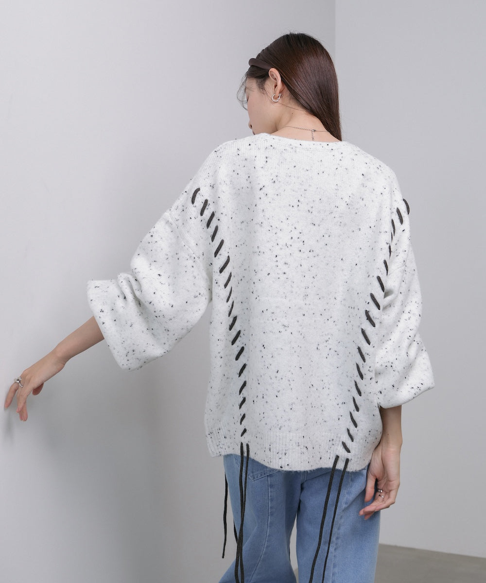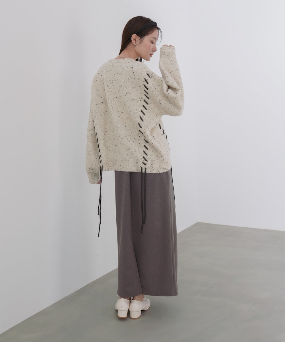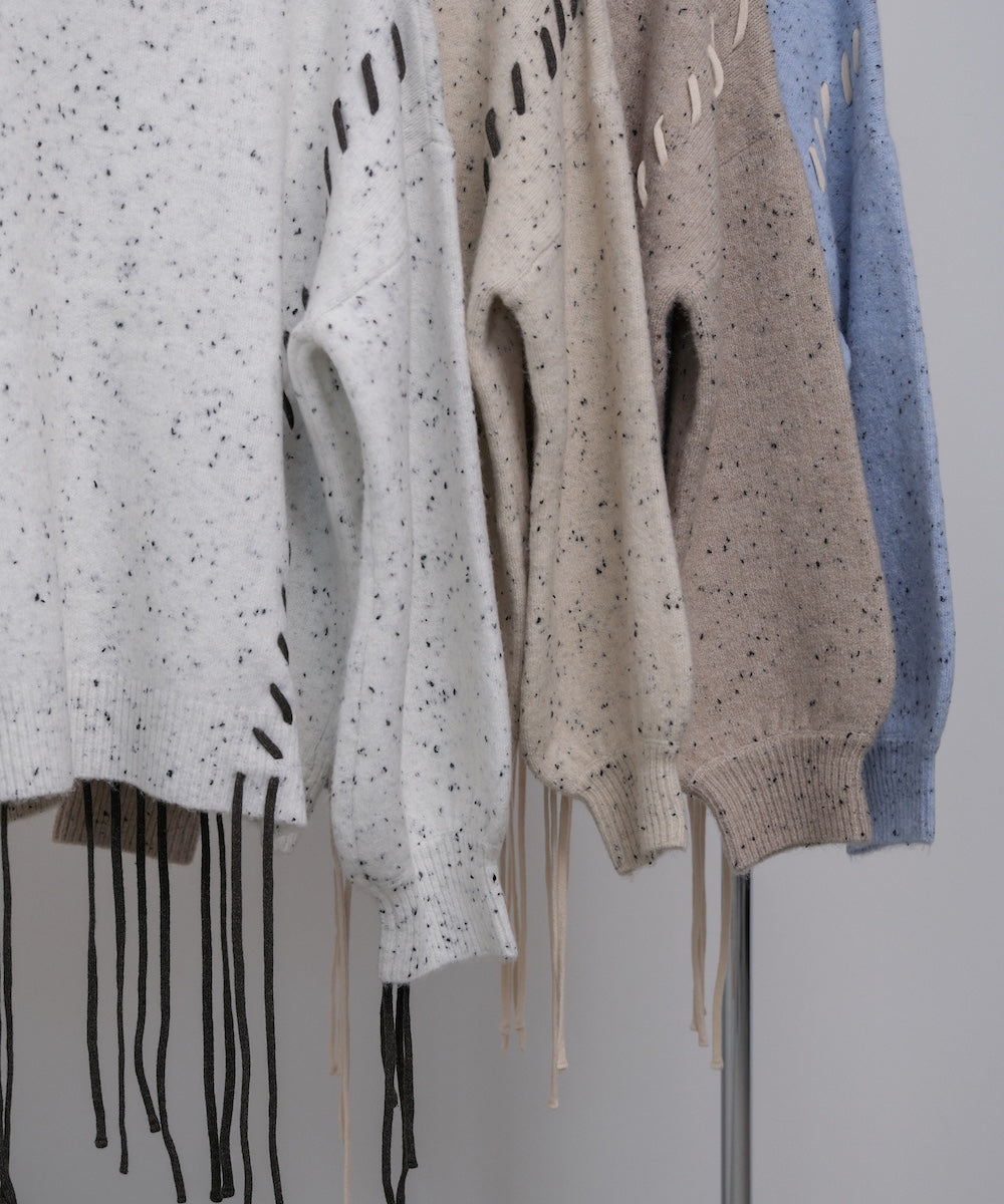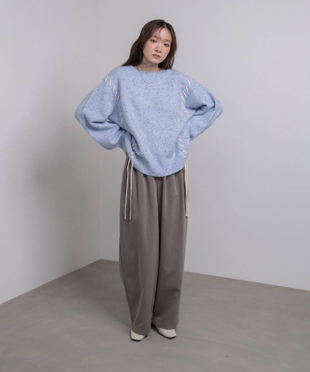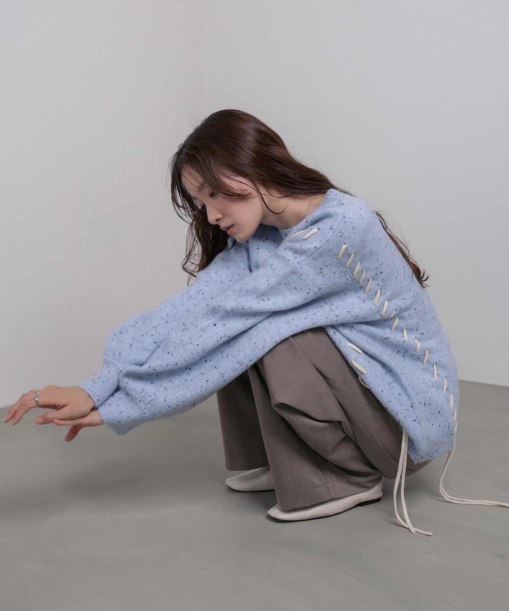 去年大人気だったチョコチップニットトップスが新しいカラーを加えて登場!ネップヤーンの暖かみがシーズンムード満載なニットトップス!控えめに浮き出た表面感が、まるでチョコチップのような可愛らしいルックスです。ショルダー部分から施された編み上げのデザインが目を惹くアクセントになり、1枚でお召し頂いても華やかさ際立つディティールに。ルーズなシルエットがフェミニンさを引き立て、大人女子のカジュアルスタイルをさらにブラッシュアップしてくれるアイテムになりました。