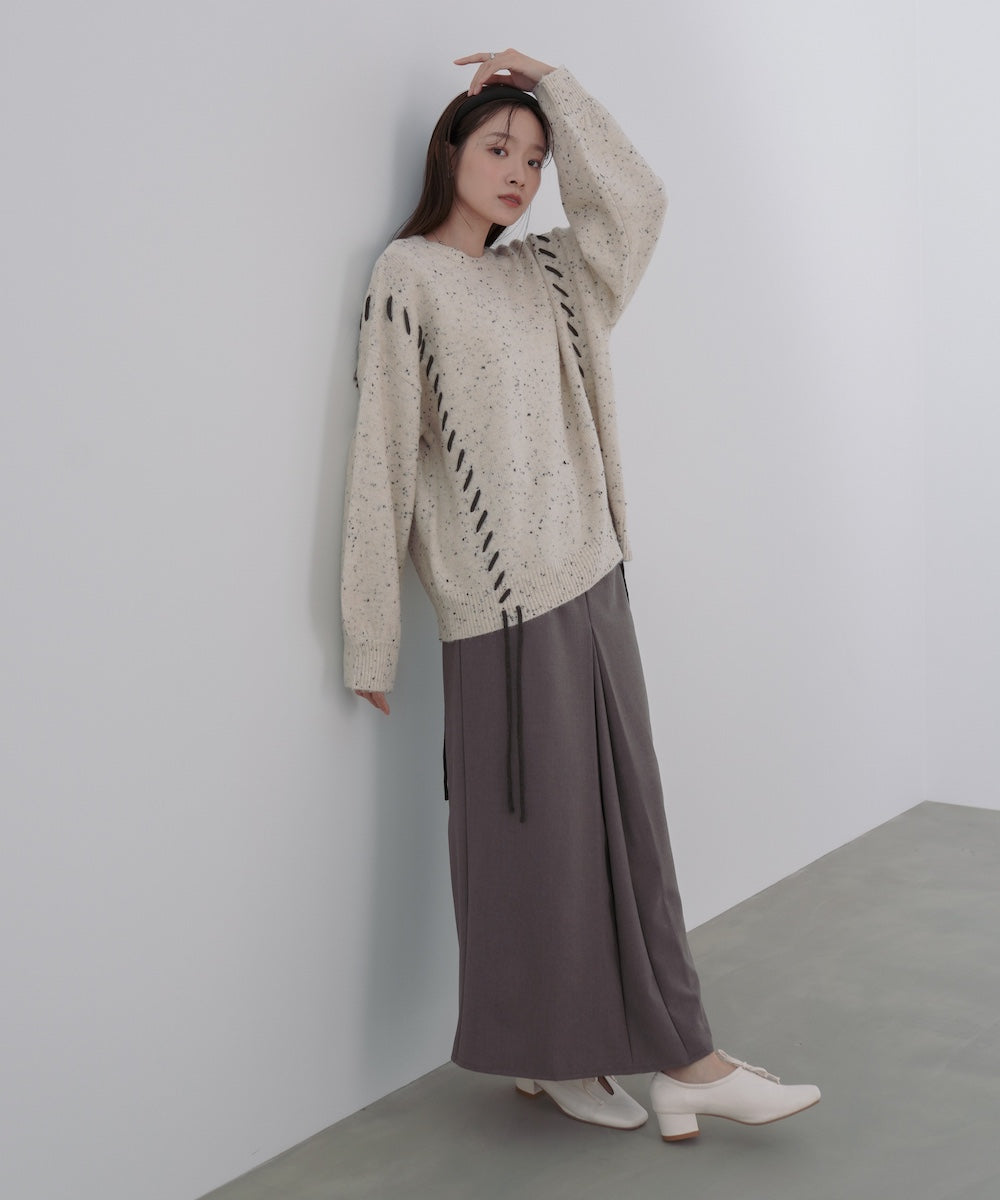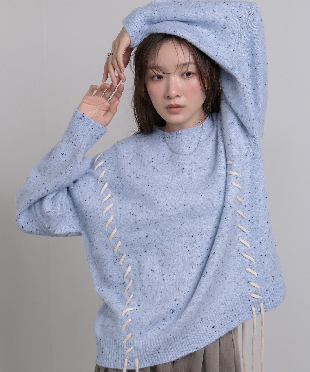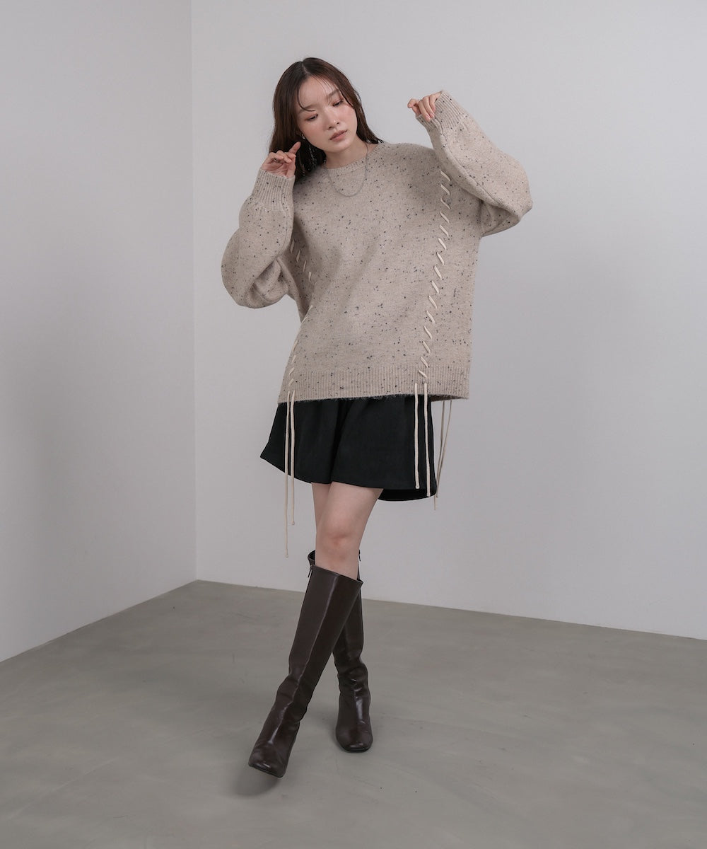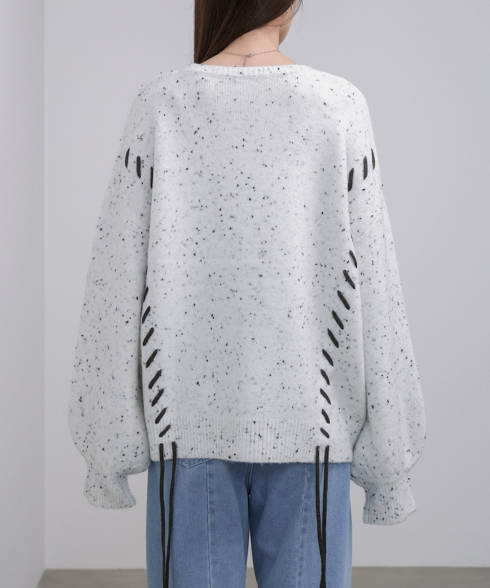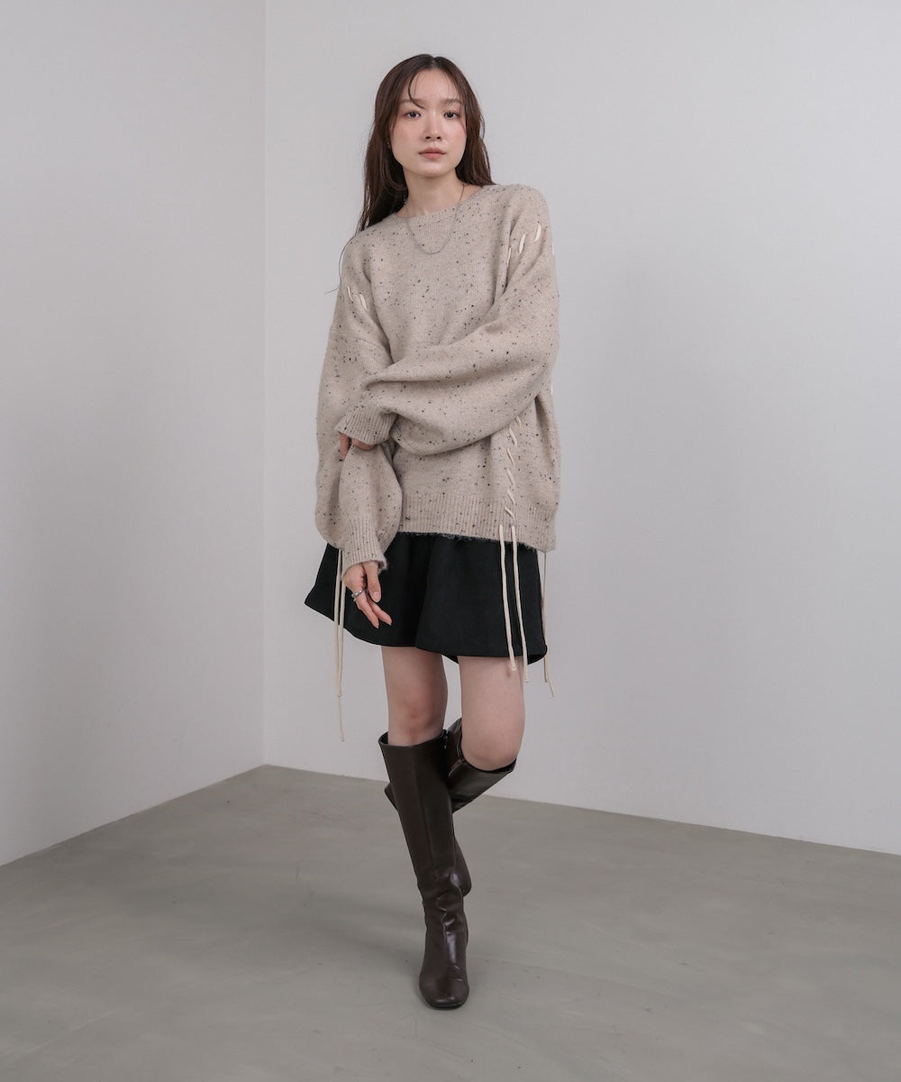 去年大人気だったチョコチップニットトップスが新しいカラーを加えて登場!ネップヤーンの暖かみがシーズンムード満載なニットトップス!控えめに浮き出た表面感が、まるでチョコチップのような可愛らしいルックスです。ショルダー部分から施された編み上げのデザインが目を惹くアクセントになり、1枚でお召し頂いても華やかさ際立つディティールに。ルーズなシルエットがフェミニンさを引き立て、大人女子のカジュアルスタイルをさらにブラッシュアップしてくれるアイテムになりました。
