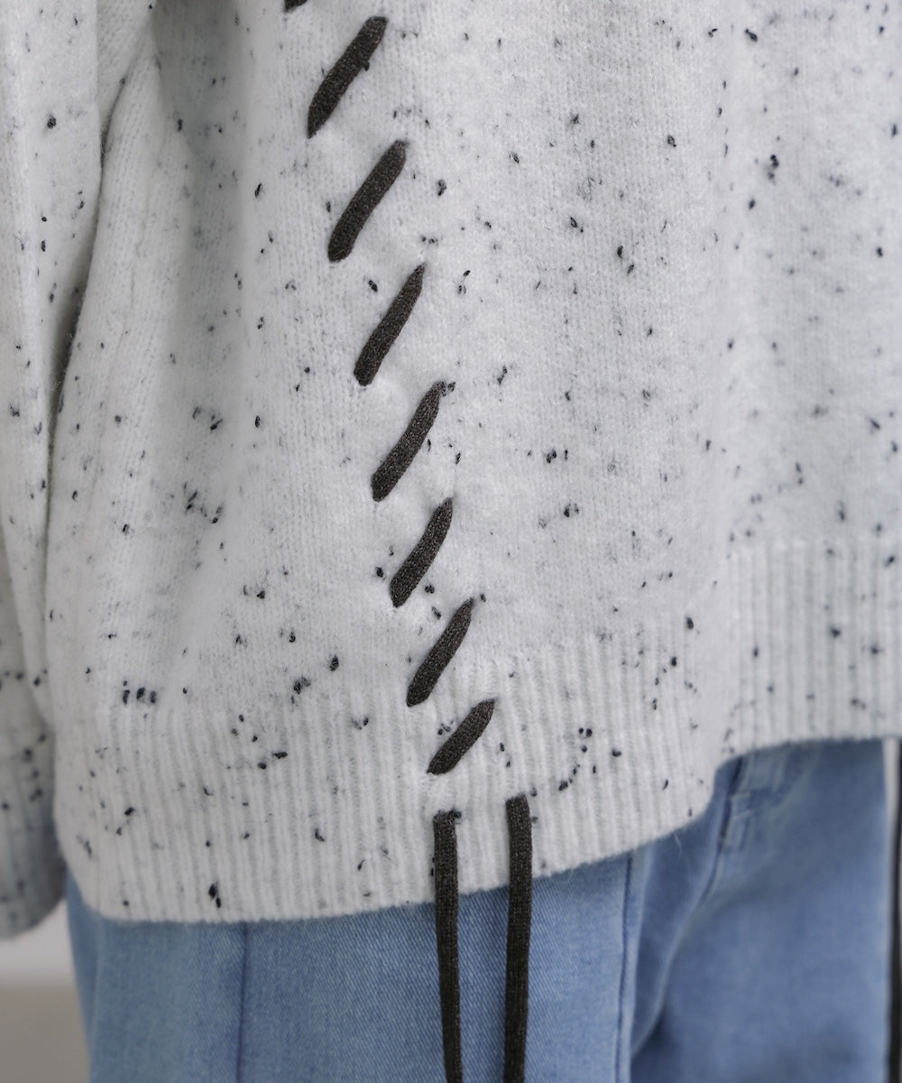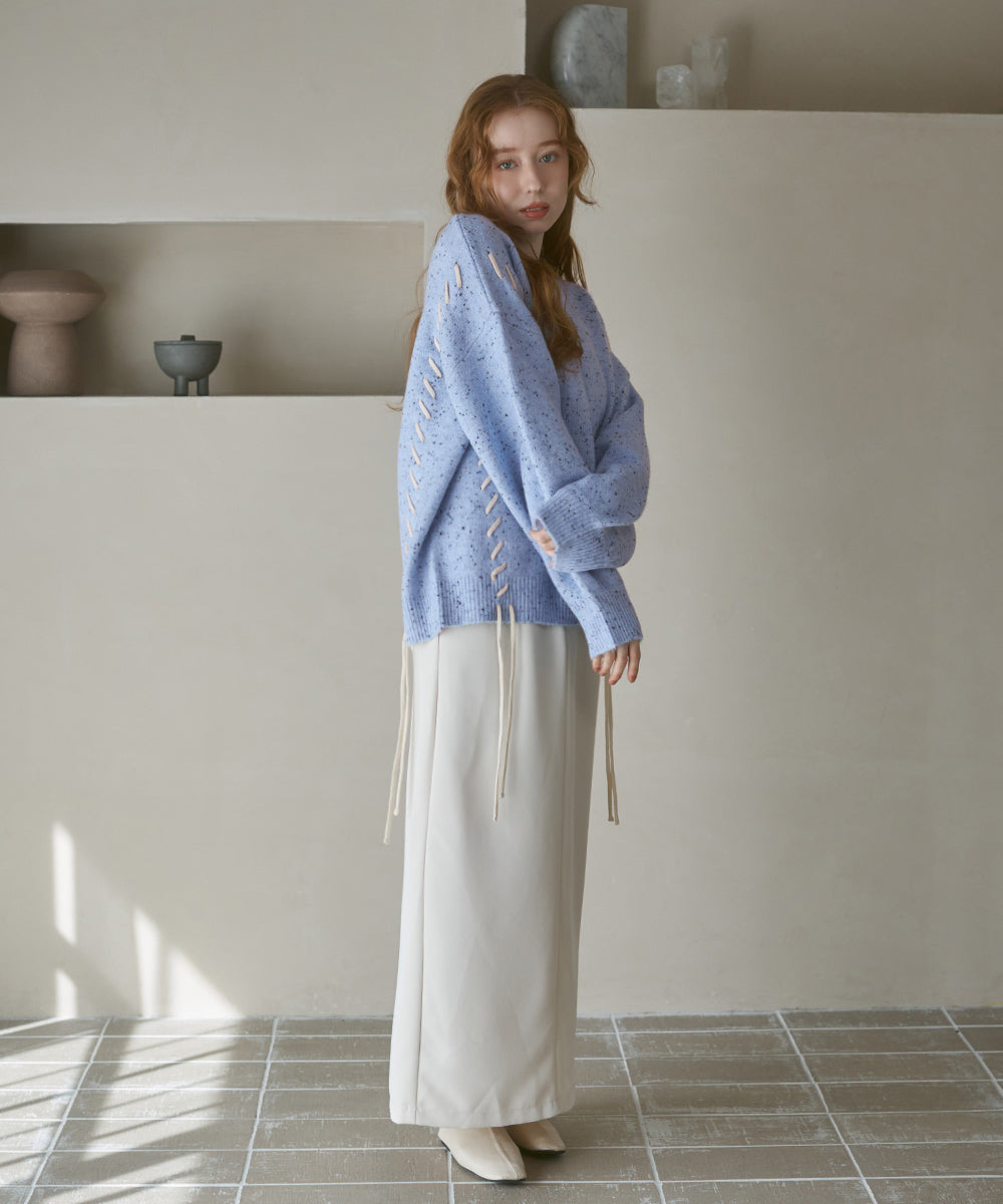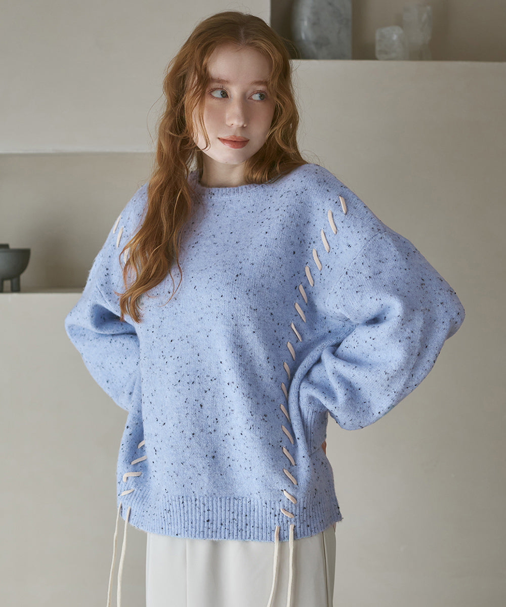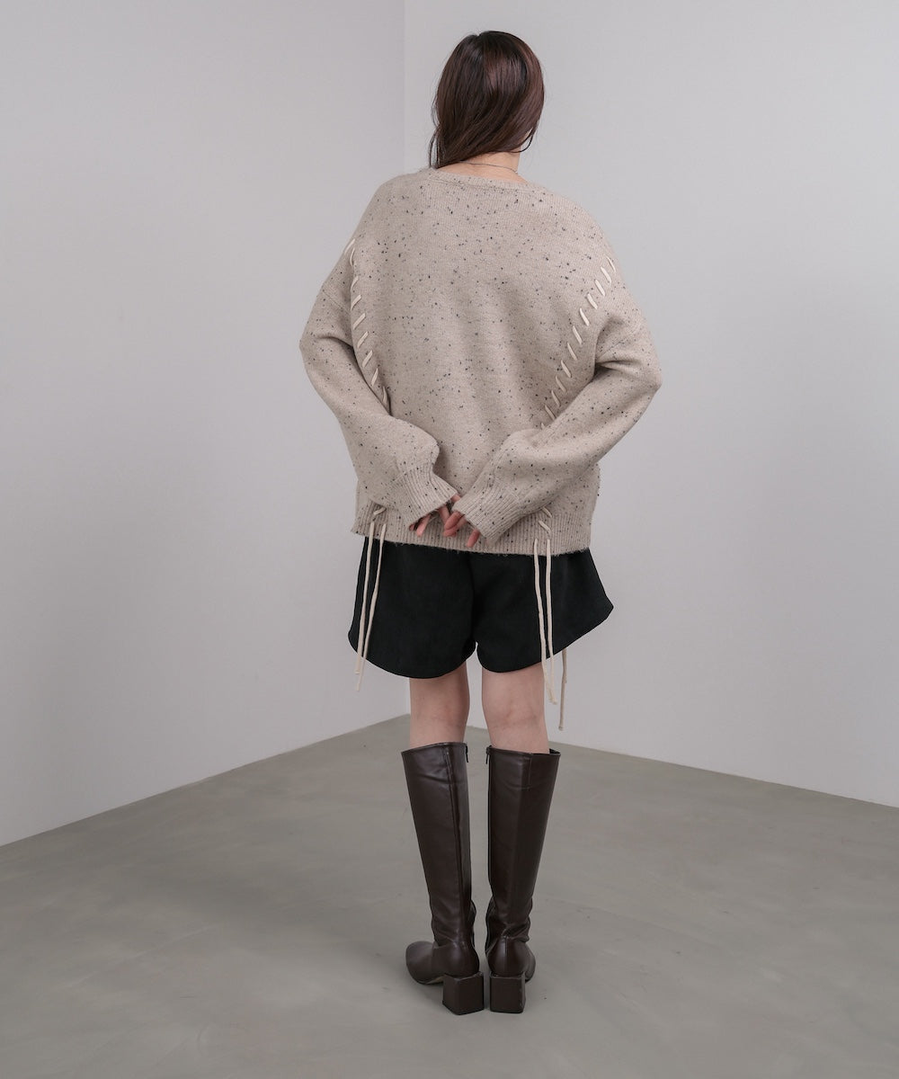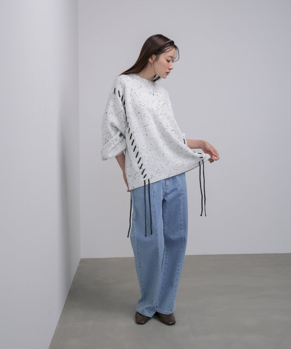 去年大人気だったチョコチップニットトップスが新しいカラーを加えて登場!ネップヤーンの暖かみがシーズンムード満載なニットトップス!控えめに浮き出た表面感が、まるでチョコチップのような可愛らしいルックスです。ショルダー部分から施された編み上げのデザインが目を惹くアクセントになり、1枚でお召し頂いても華やかさ際立つディティールに。ルーズなシルエットがフェミニンさを引き立て、大人女子のカジュアルスタイルをさらにブラッシュアップしてくれるアイテムになりました。