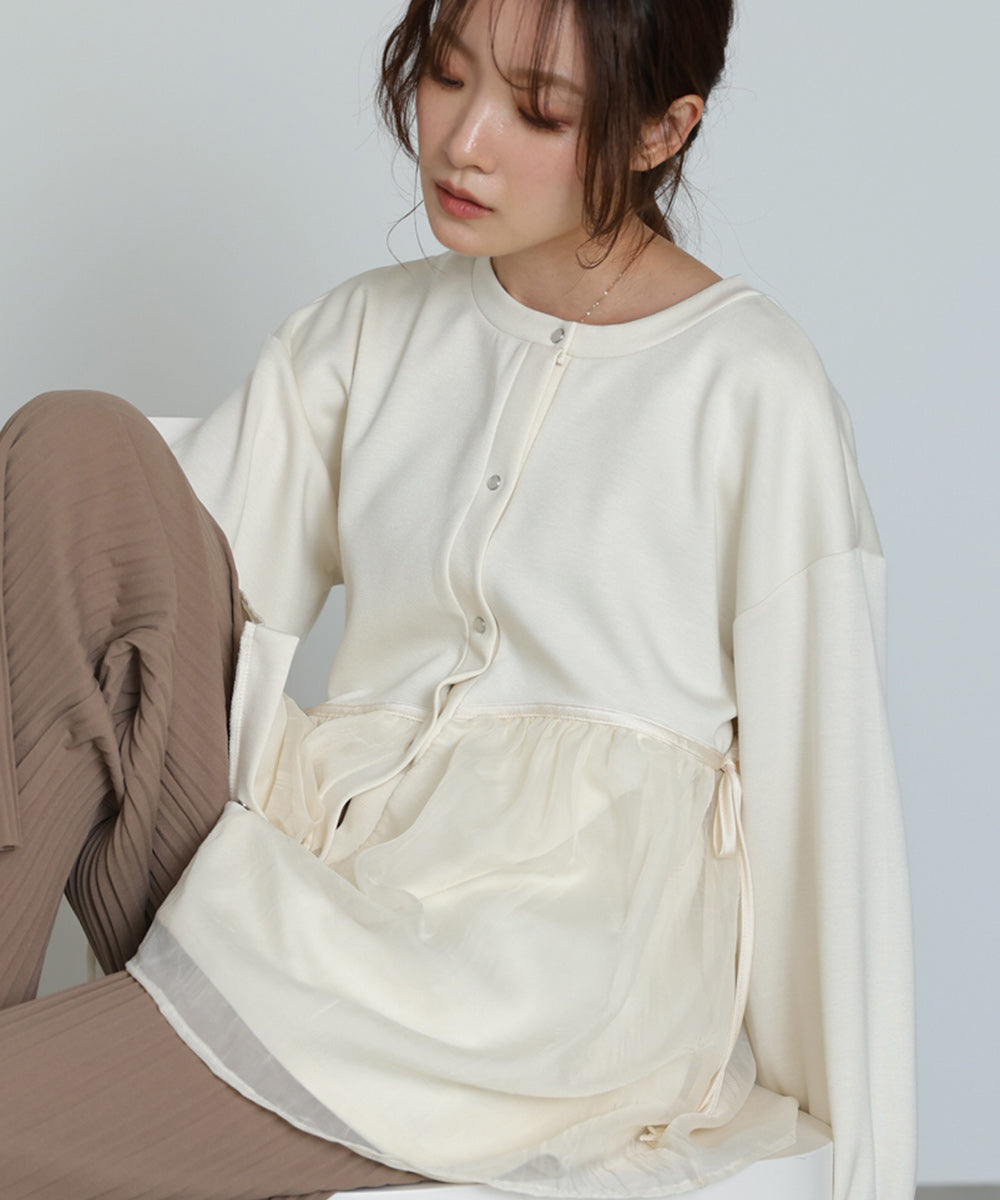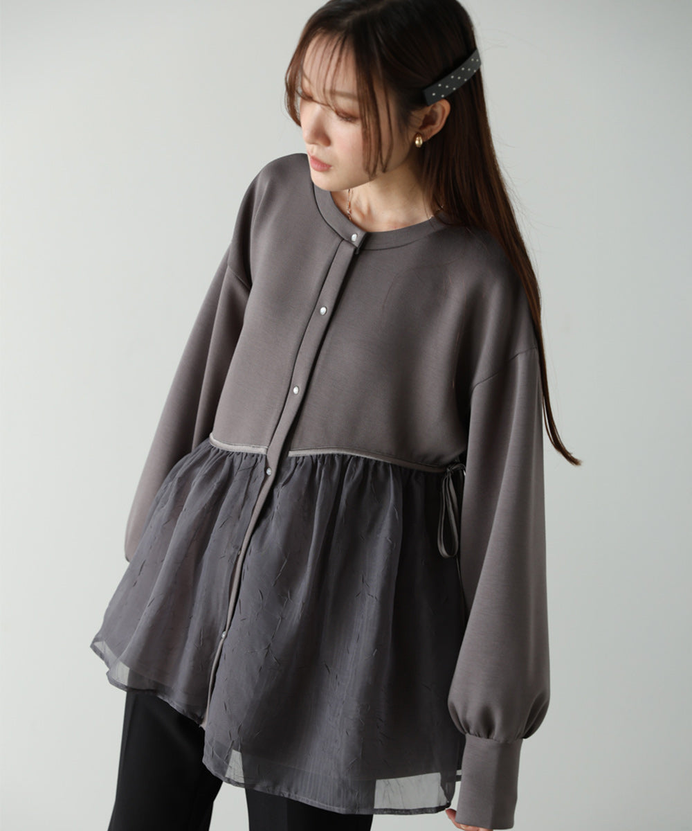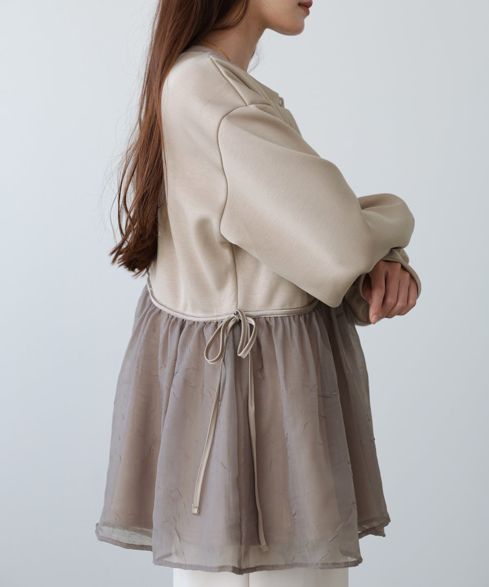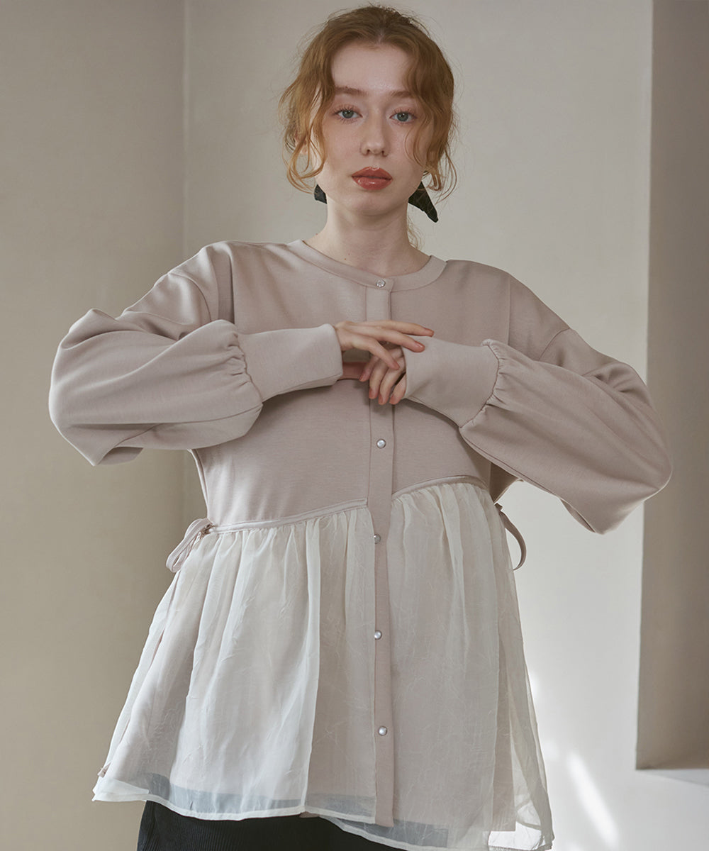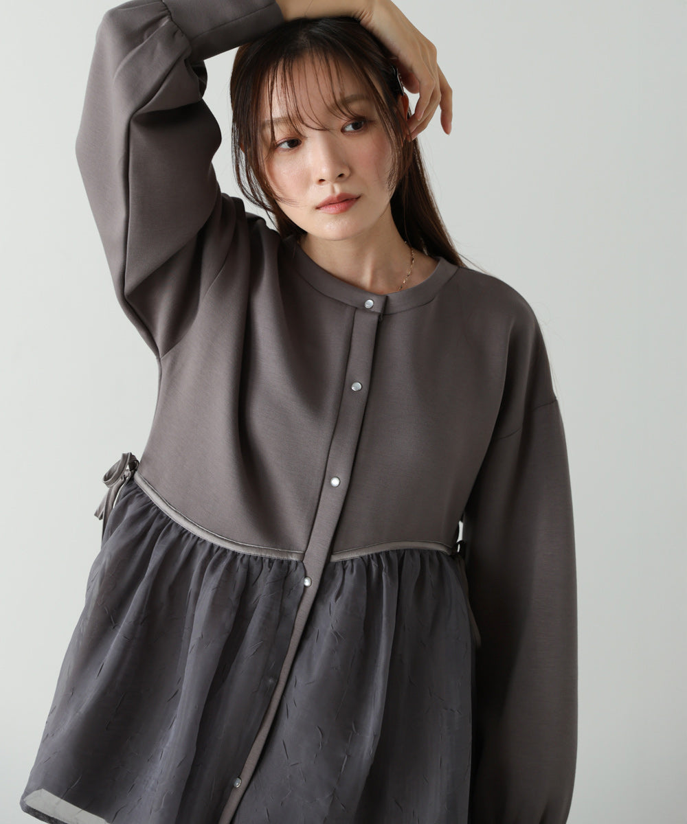 ペプラムの切り替えからシアー素材を重ね、動くたびにふわっと遊びがあるデザインが軽やかなトップスの登場です。気軽にお召し頂ける嬉しいポンチ素材で、柔らかい着心地も特徴です。サイドのリボンとボリューム感のある袖が可愛らしいアクセントになります。今年はボタン留めにして羽織としてもお使いいただけます。柔らかい素材感と開け閉め可能なので妊婦さんにも使いやすいアイテムです。