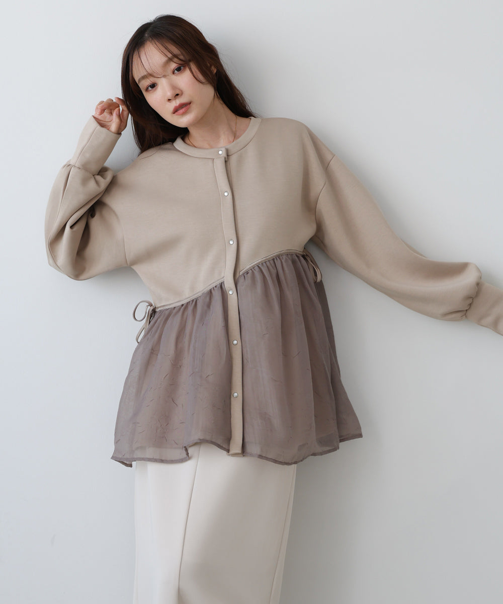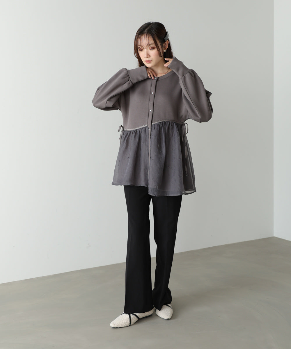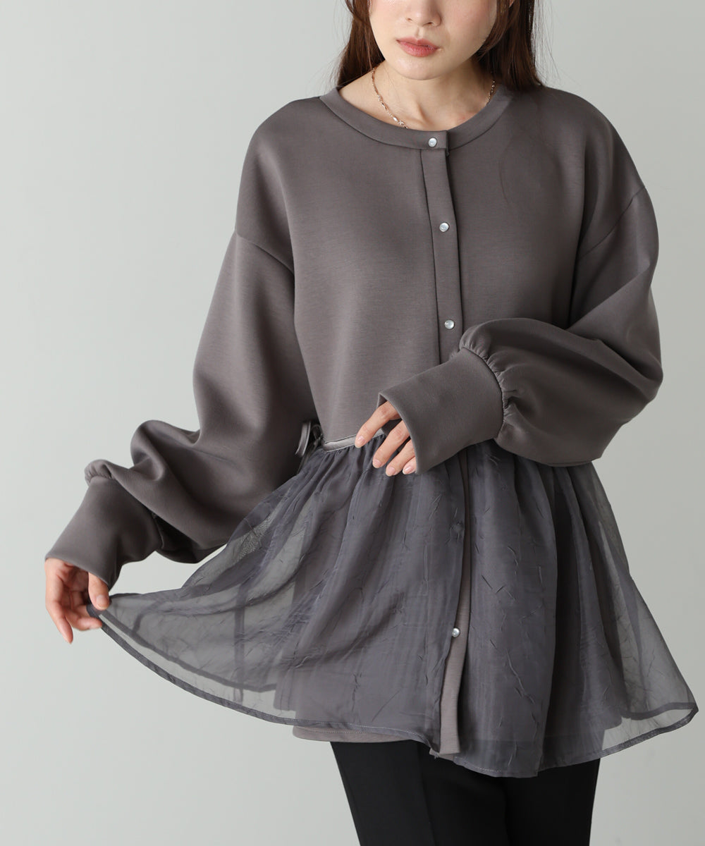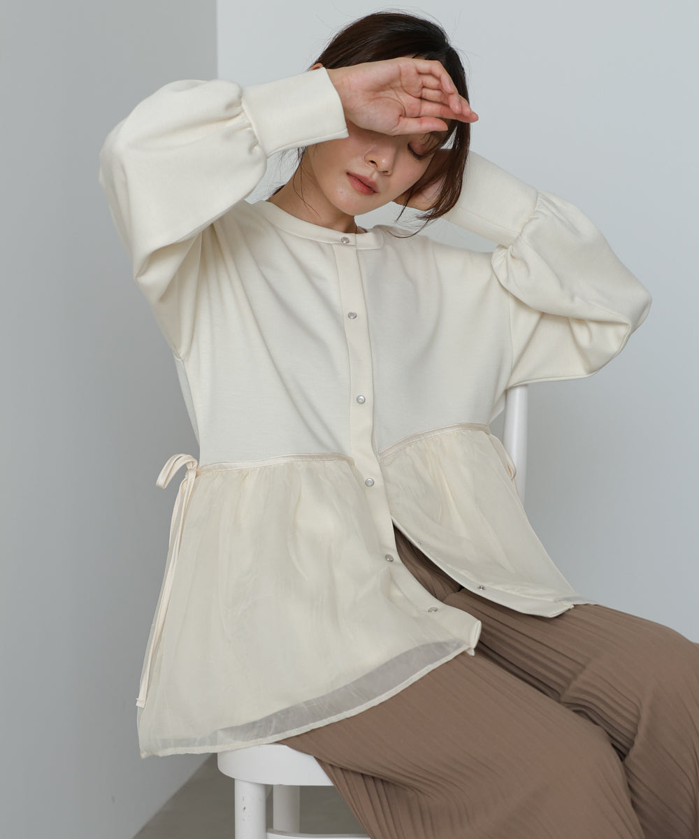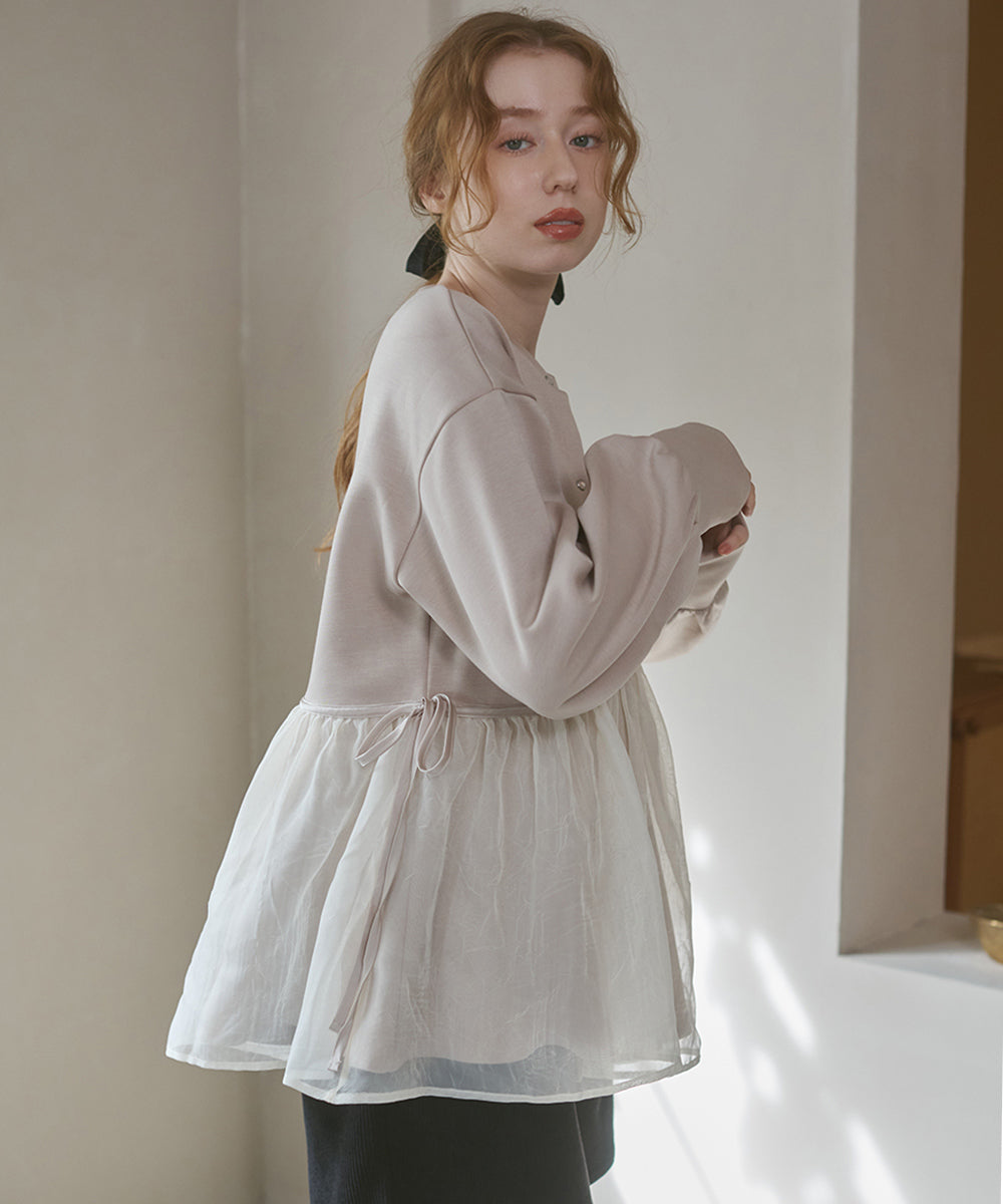 ペプラムの切り替えからシアー素材を重ね、動くたびにふわっと遊びがあるデザインが軽やかなトップスの登場です。気軽にお召し頂ける嬉しいポンチ素材で、柔らかい着心地も特徴です。サイドのリボンとボリューム感のある袖が可愛らしいアクセントになります。今年はボタン留めにして羽織としてもお使いいただけます。柔らかい素材感と開け閉め可能なので妊婦さんにも使いやすいアイテムです。