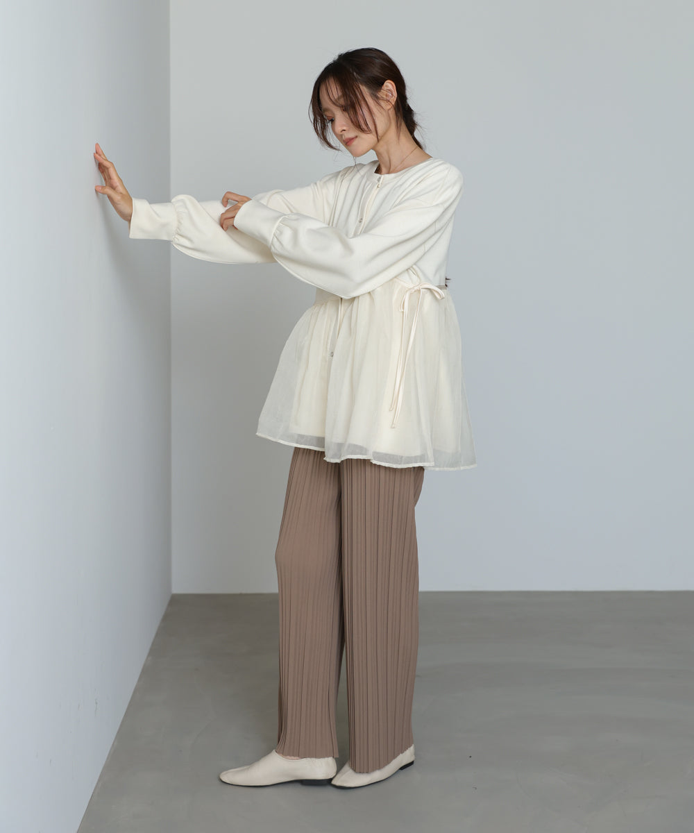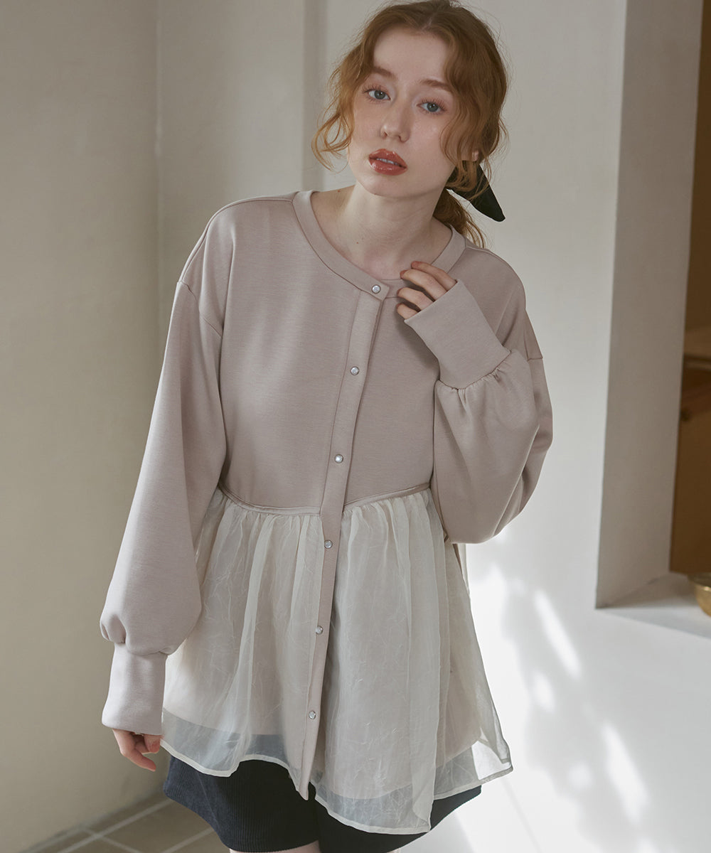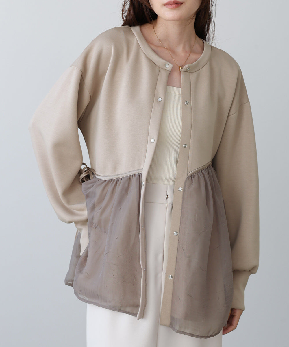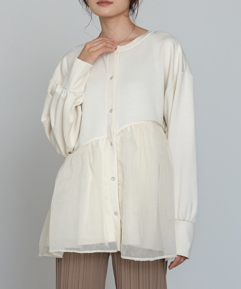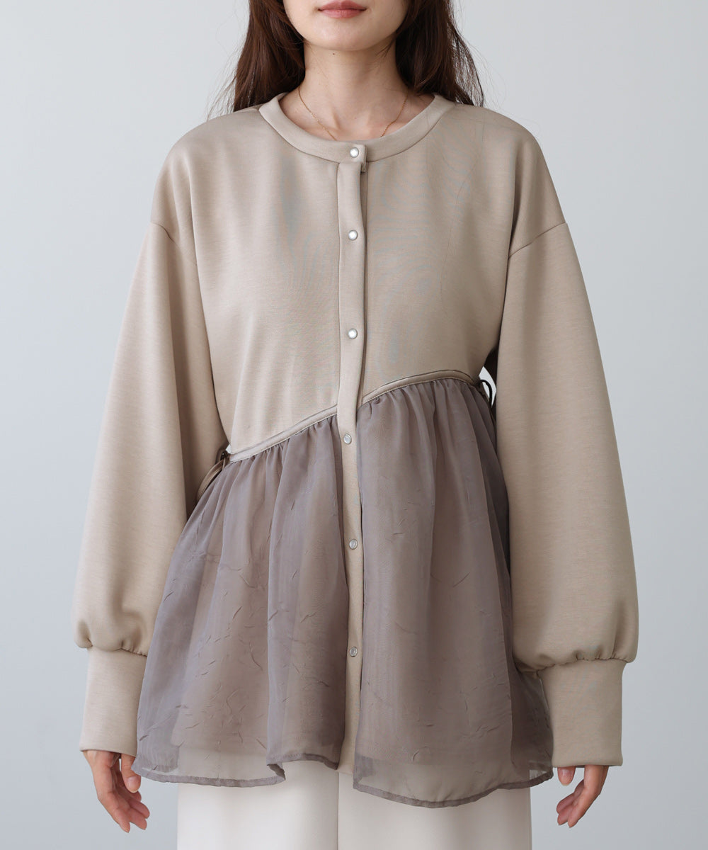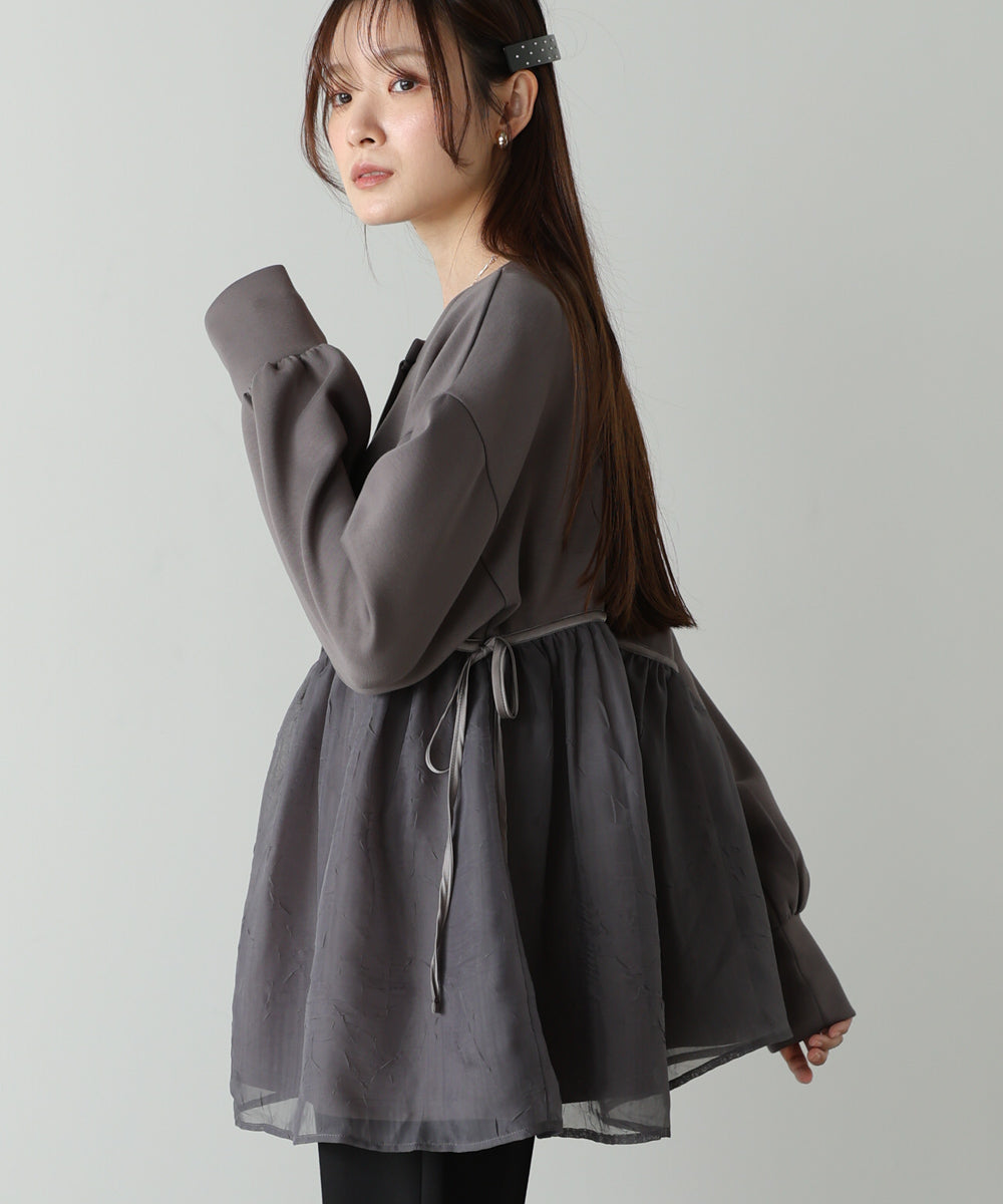 ペプラムの切り替えからシアー素材を重ね、動くたびにふわっと遊びがあるデザインが軽やかなトップスの登場です。気軽にお召し頂ける嬉しいポンチ素材で、柔らかい着心地も特徴です。サイドのリボンとボリューム感のある袖が可愛らしいアクセントになります。今年はボタン留めにして羽織としてもお使いいただけます。柔らかい素材感と開け閉め可能なので妊婦さんにも使いやすいアイテムです。