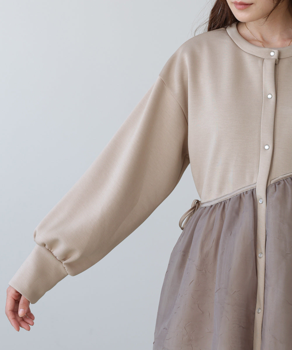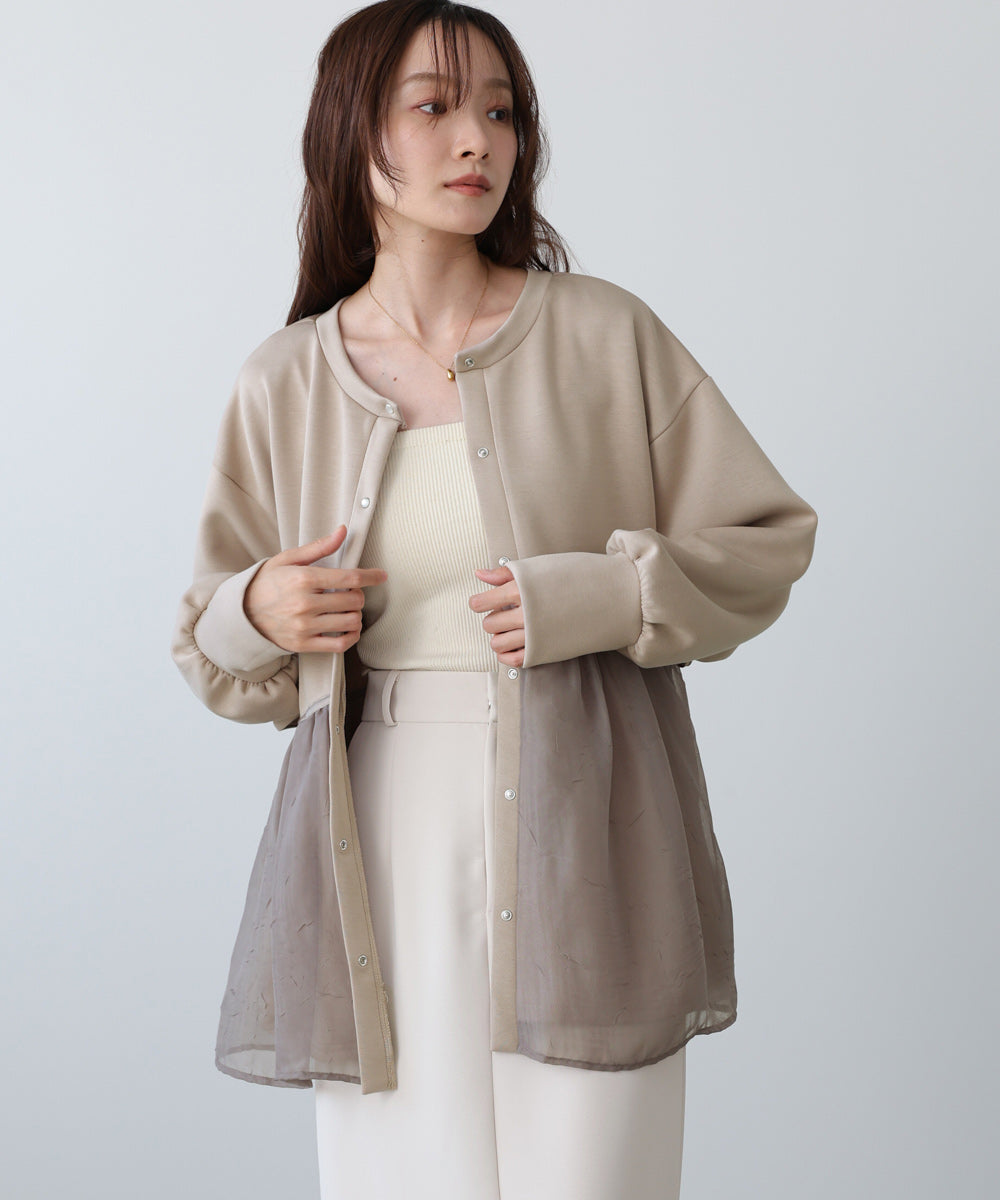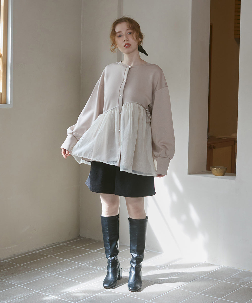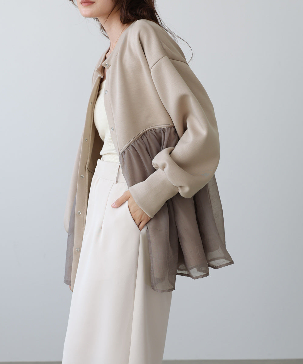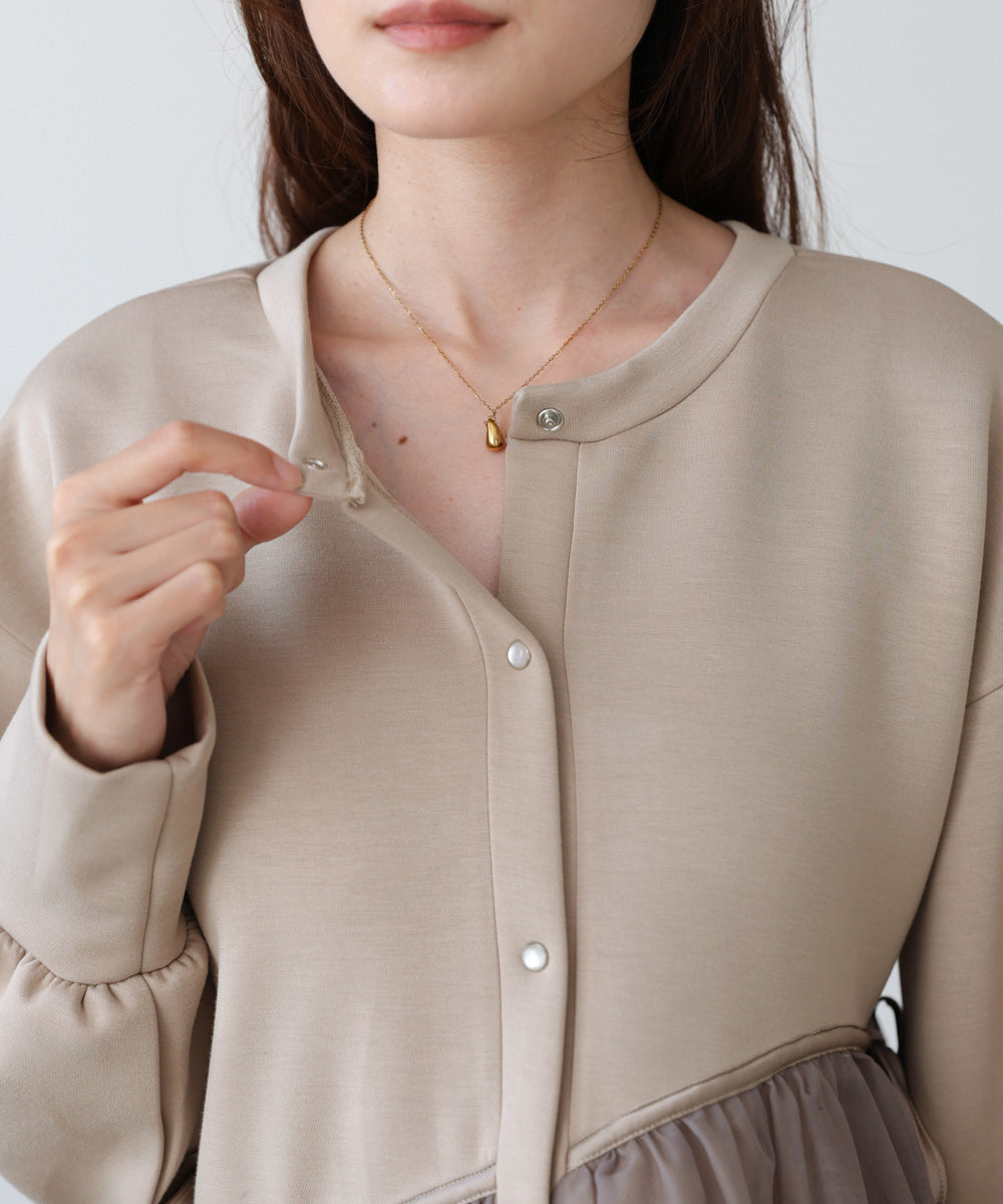 ペプラムの切り替えからシアー素材を重ね、動くたびにふわっと遊びがあるデザインが軽やかなトップスの登場です。気軽にお召し頂ける嬉しいポンチ素材で、柔らかい着心地も特徴です。サイドのリボンとボリューム感のある袖が可愛らしいアクセントになります。今年はボタン留めにして羽織としてもお使いいただけます。柔らかい素材感と開け閉め可能なので妊婦さんにも使いやすいアイテムです。