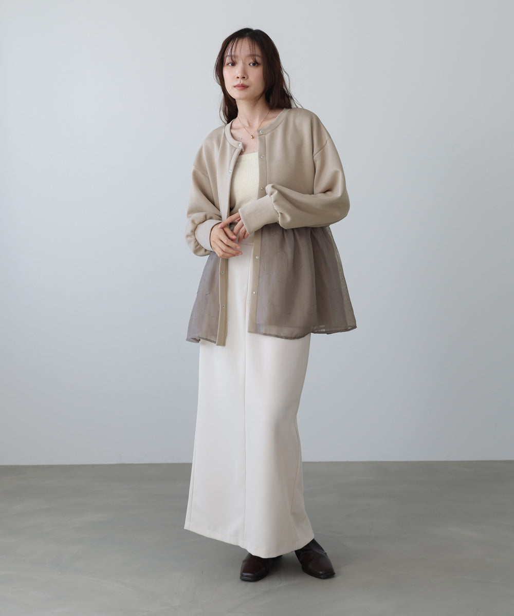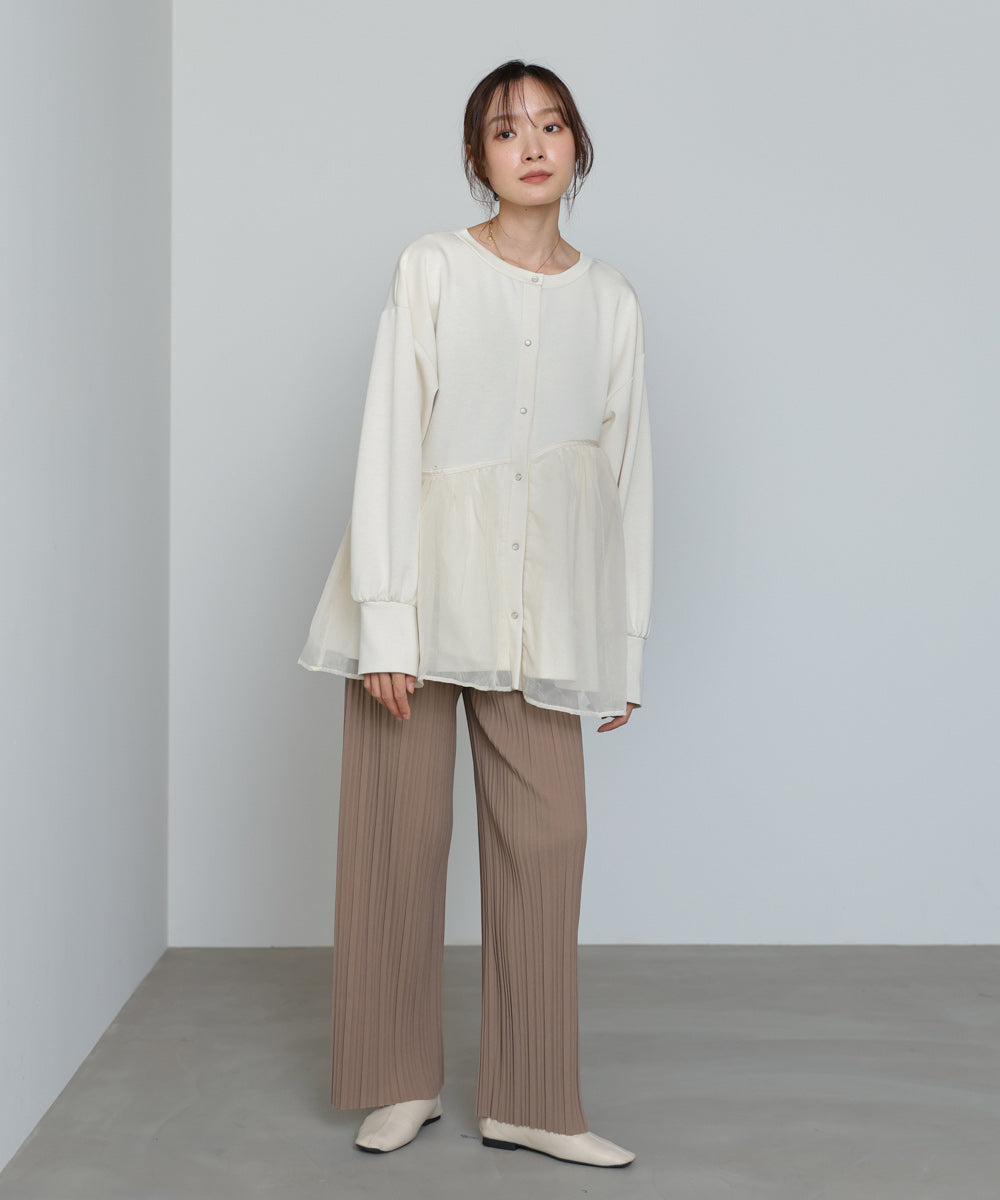 ペプラム切り替えからフレアーシルエットになるので、スカートを合わせる際はIラインのようなすっきりした形がおすすめです。カジュアルとキレイめ どちらでも馴染む素材のコンビネーションなので、スラックスでもジーンズでも万能に合わせて頂けます。