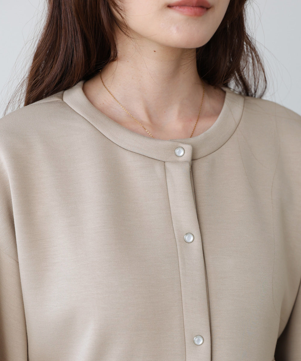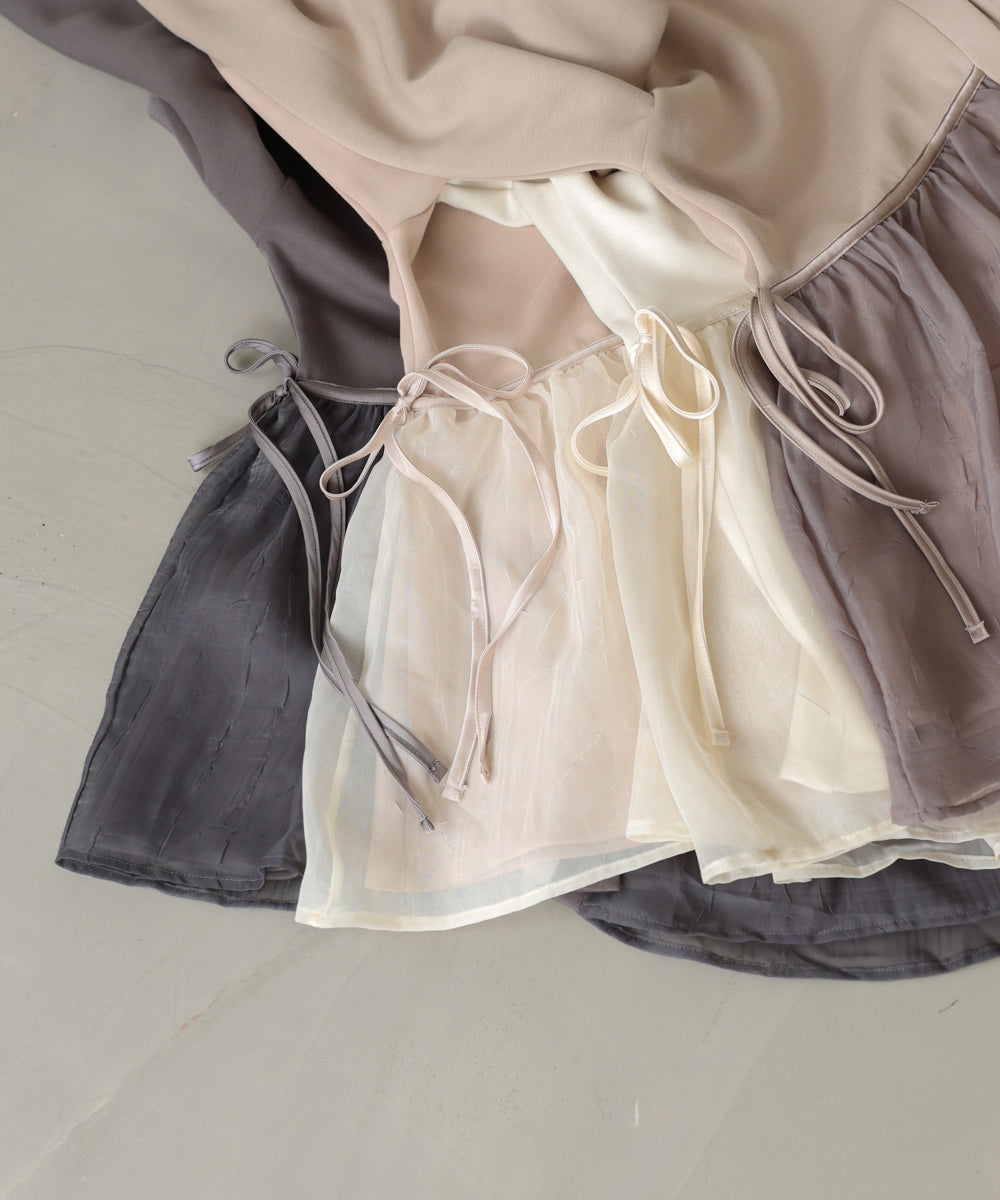 皴になりにくいポンチ生地で軽く柔らかい素材感です。適度な透けのあるシフォン素材が女性らしさを引き出します。