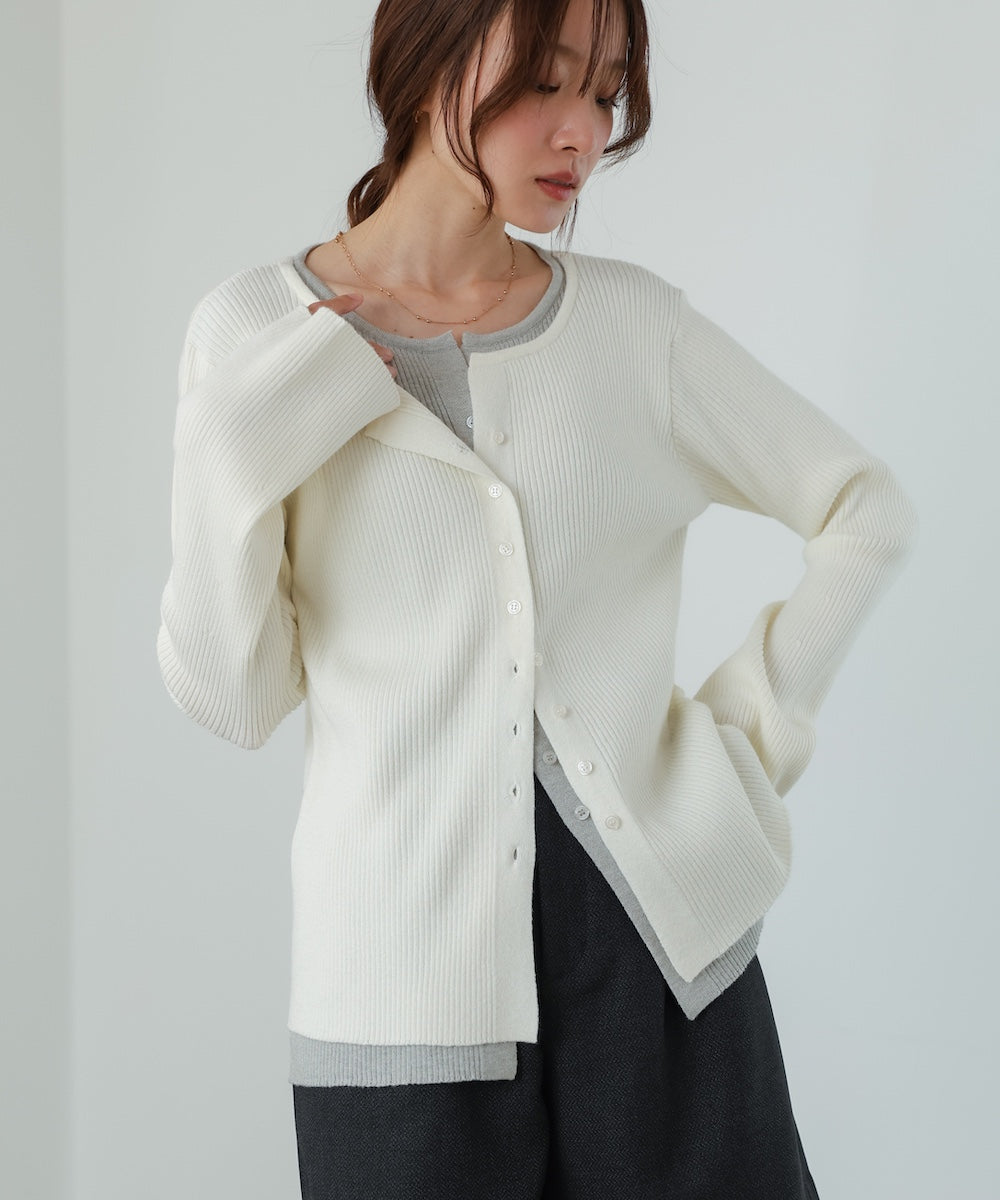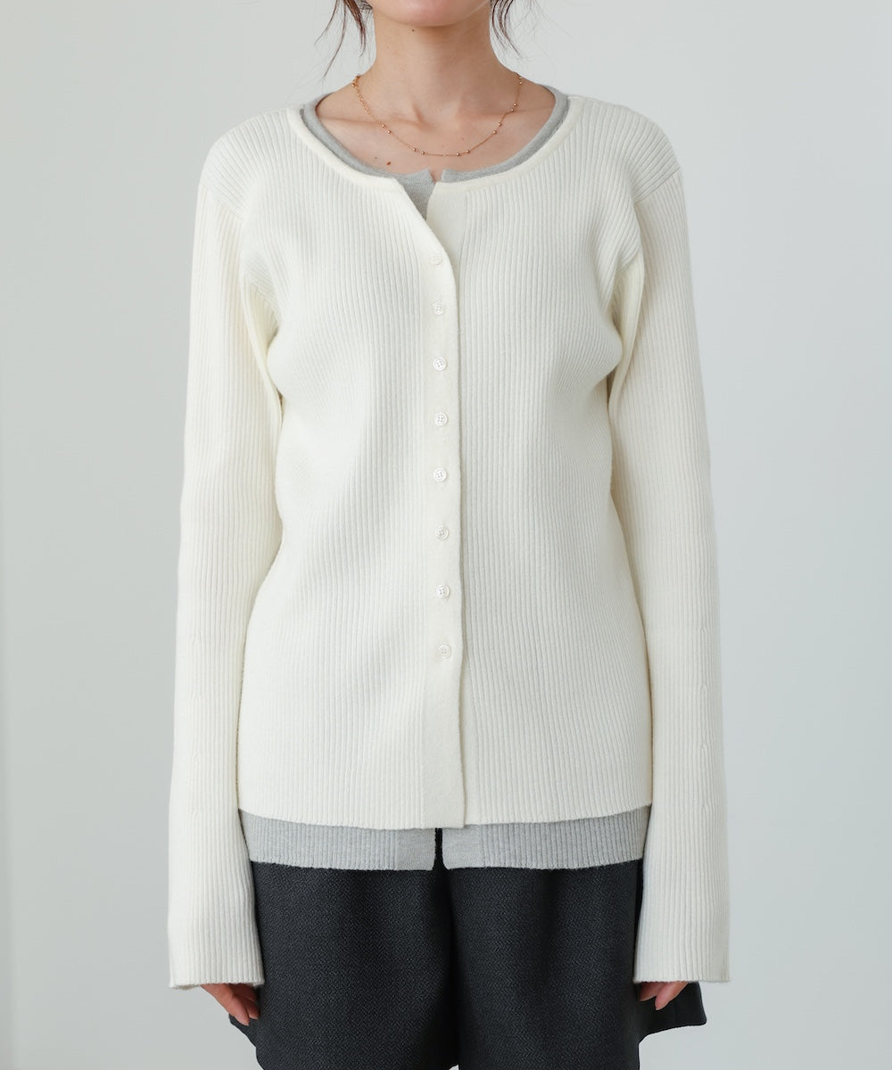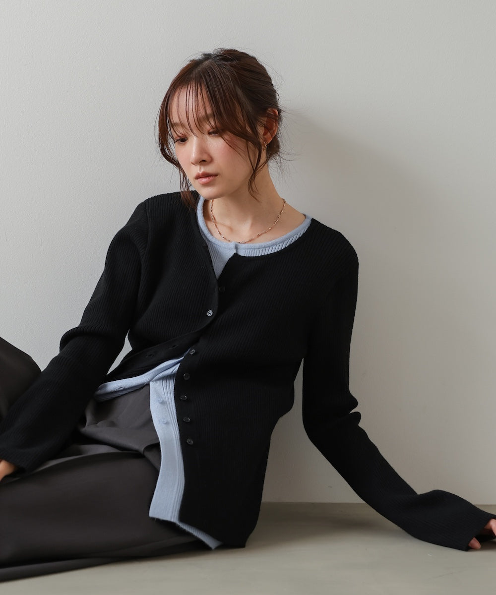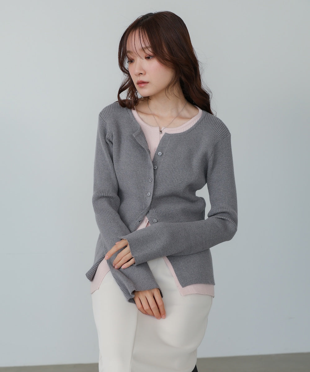 配色デザインでレイヤード風に見せた、着映え力のあるニットカーディガン。実は一体型になっており、重ね着いらずでバランスの取れたスタイリングが完成します。ボタンの開け閉めによって印象を変えられるので、きちんと感のある着こなしから程よく抜け感のあるスタイルまで幅広く対応。アイボリー×グレーは上品に、ブラック×ブルーは洗練された印象に、グレー×ピンクはさりげなく女性らしいムードを演出してくれます。通勤からデイリーまで活躍するレイヤードニットです。