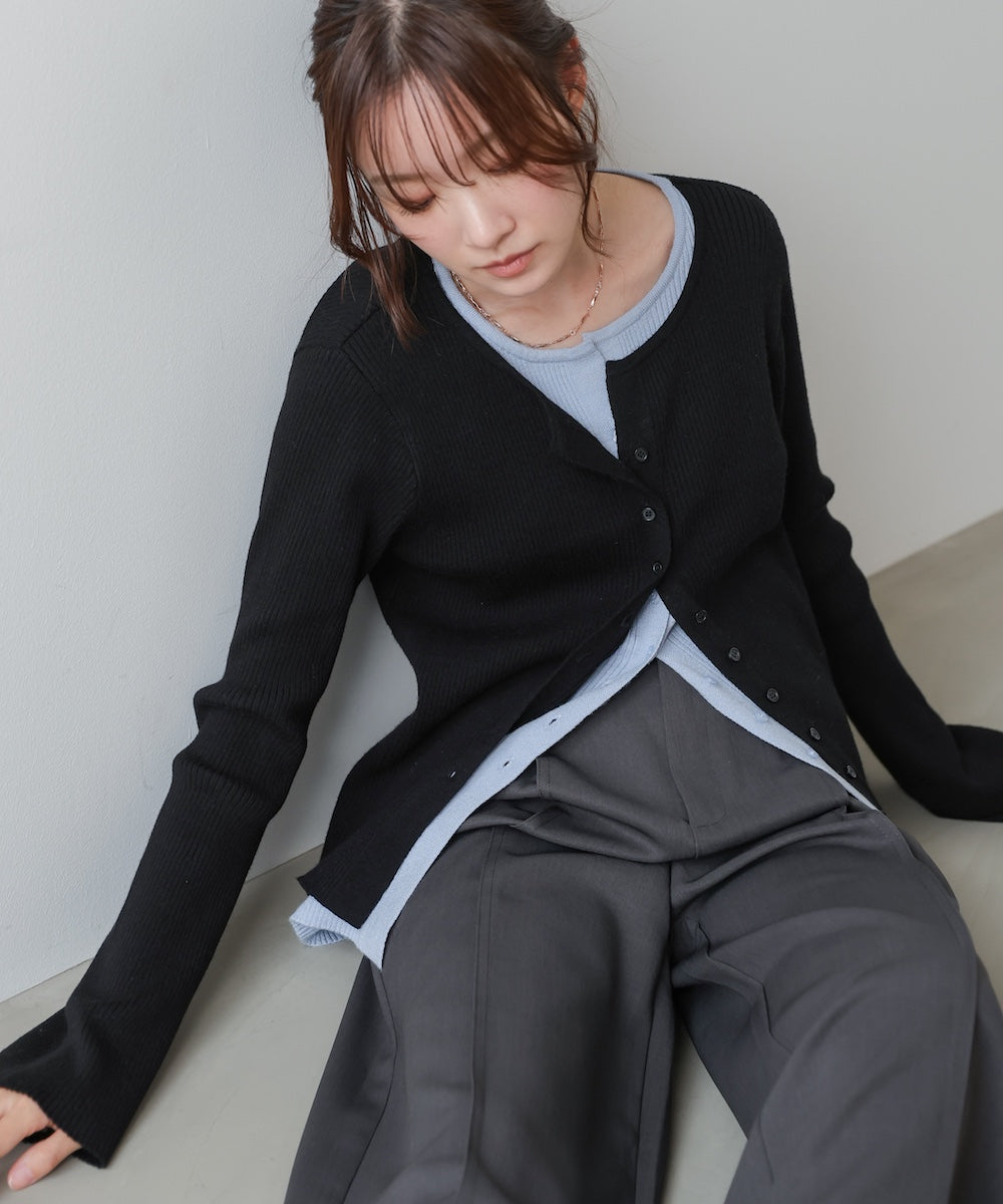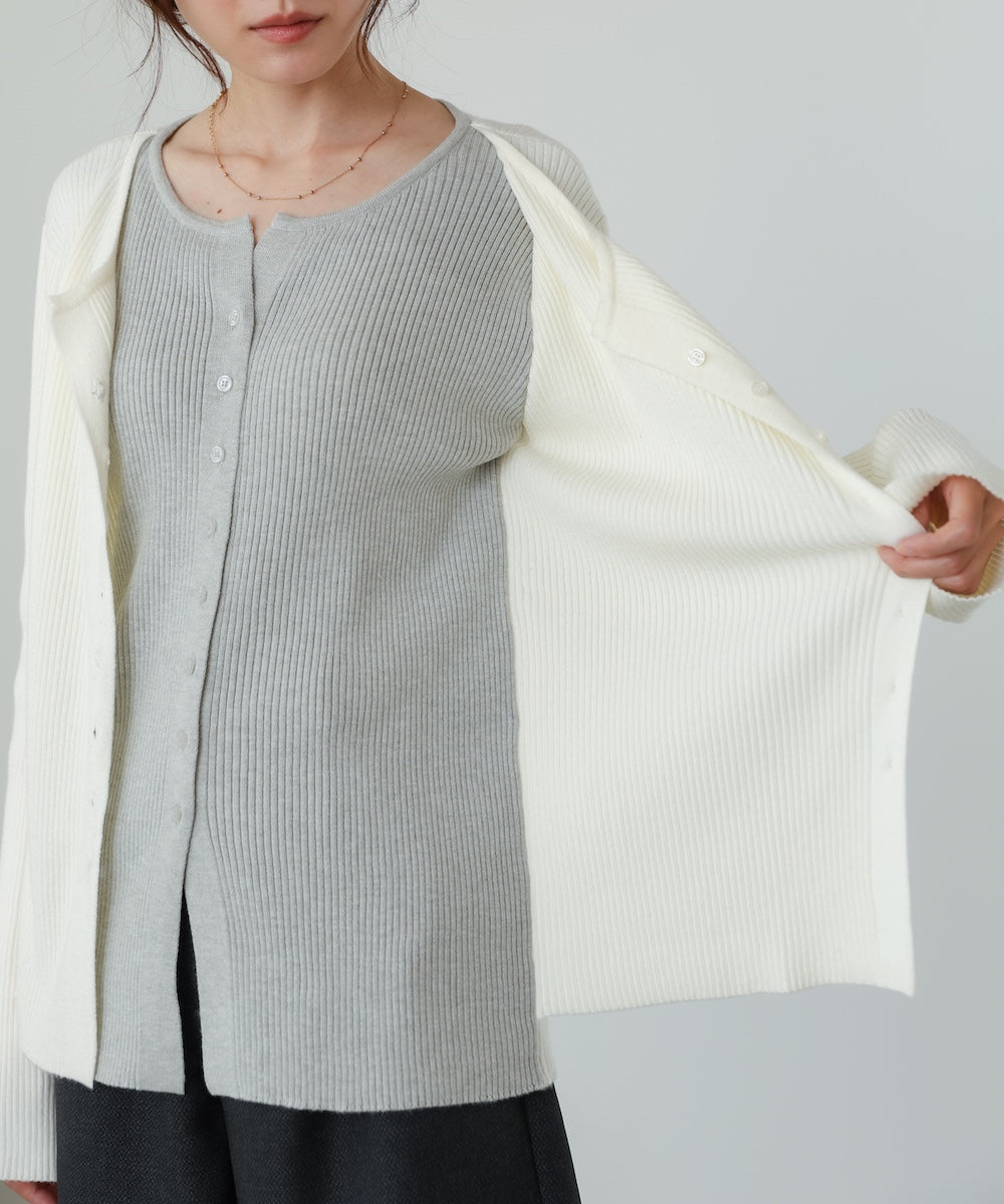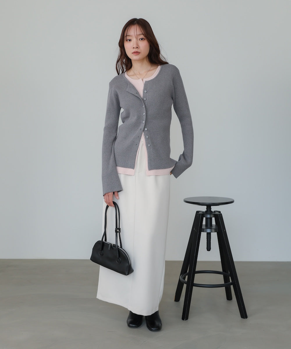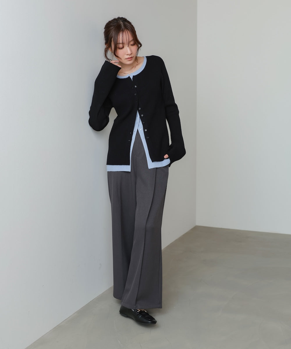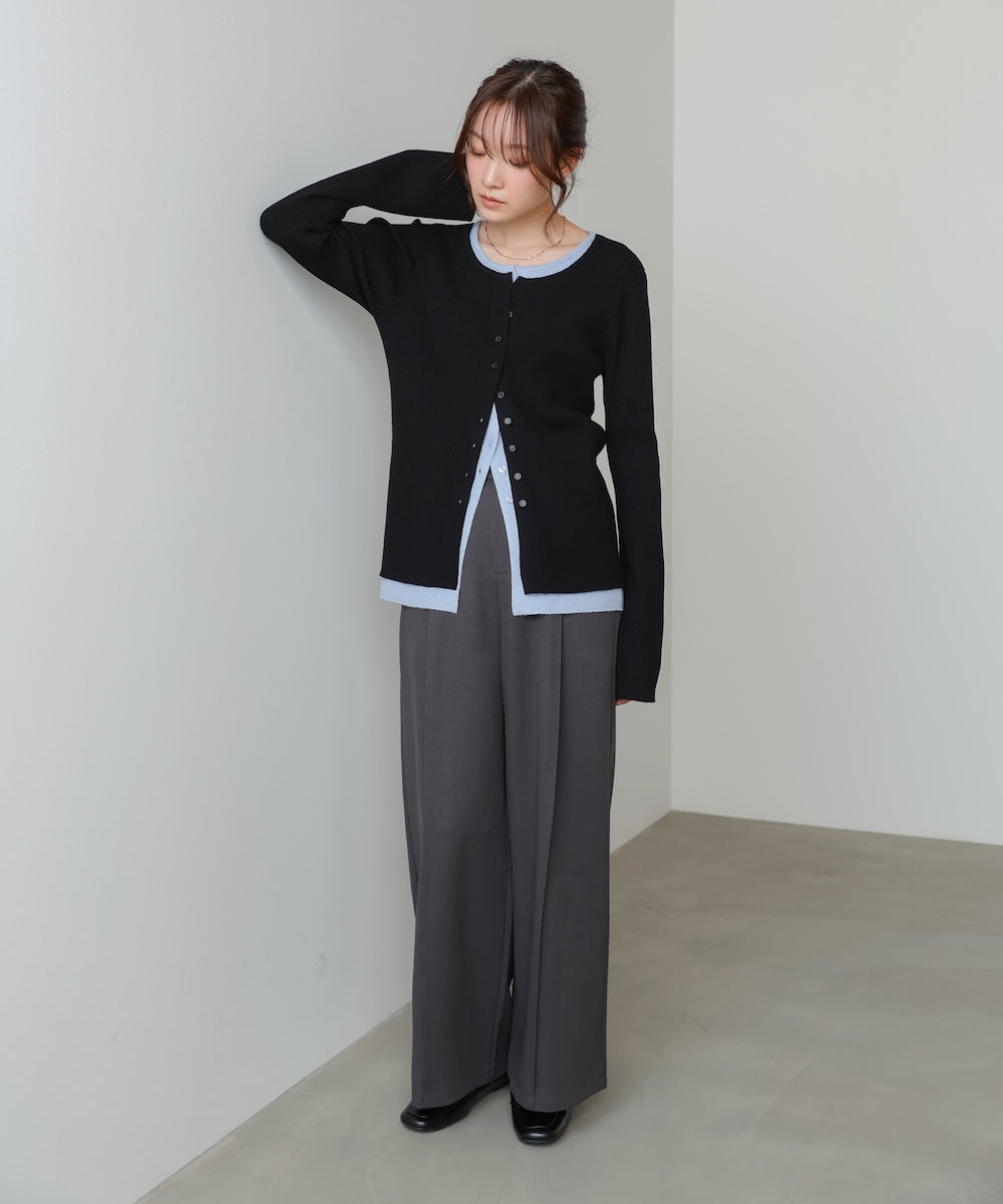 配色デザインでレイヤード風に見せた、着映え力のあるニットカーディガン。実は一体型になっており、重ね着いらずでバランスの取れたスタイリングが完成します。ボタンの開け閉めによって印象を変えられるので、きちんと感のある着こなしから程よく抜け感のあるスタイルまで幅広く対応。アイボリー×グレーは上品に、ブラック×ブルーは洗練された印象に、グレー×ピンクはさりげなく女性らしいムードを演出してくれます。通勤からデイリーまで活躍するレイヤードニットです。