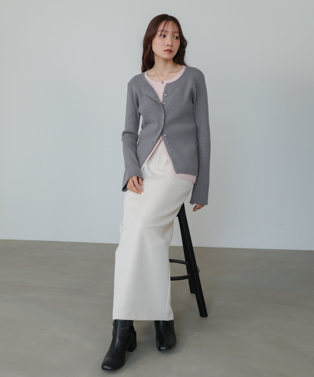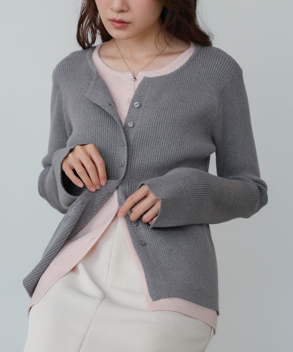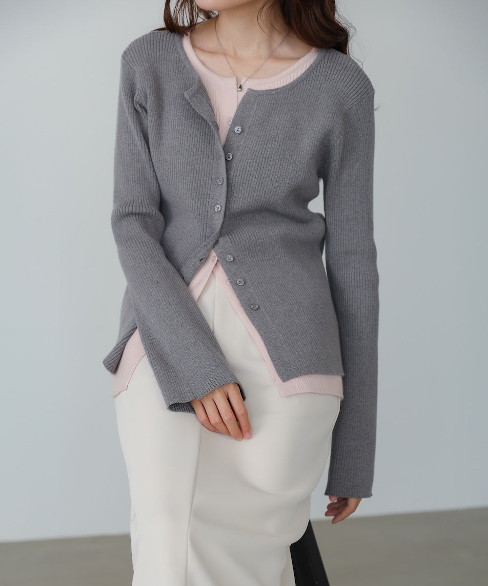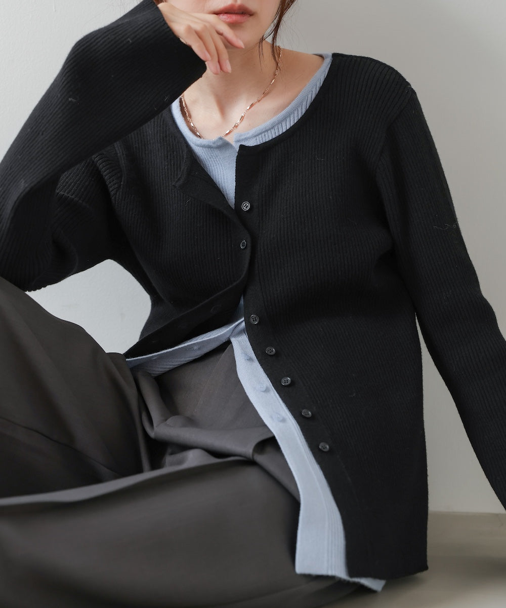 配色デザインでレイヤード風に見せた、着映え力のあるニットカーディガン。実は一体型になっており、重ね着いらずでバランスの取れたスタイリングが完成します。ボタンの開け閉めによって印象を変えられるので、きちんと感のある着こなしから程よく抜け感のあるスタイルまで幅広く対応。アイボリー×グレーは上品に、ブラック×ブルーは洗練された印象に、グレー×ピンクはさりげなく女性らしいムードを演出してくれます。通勤からデイリーまで活躍するレイヤードニットです。