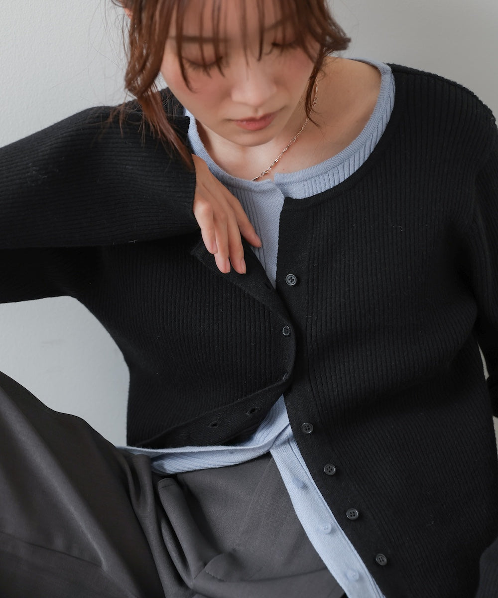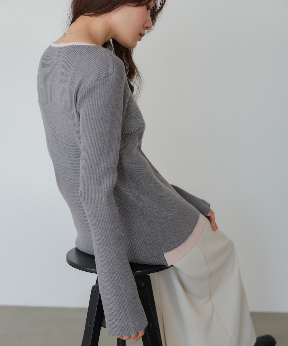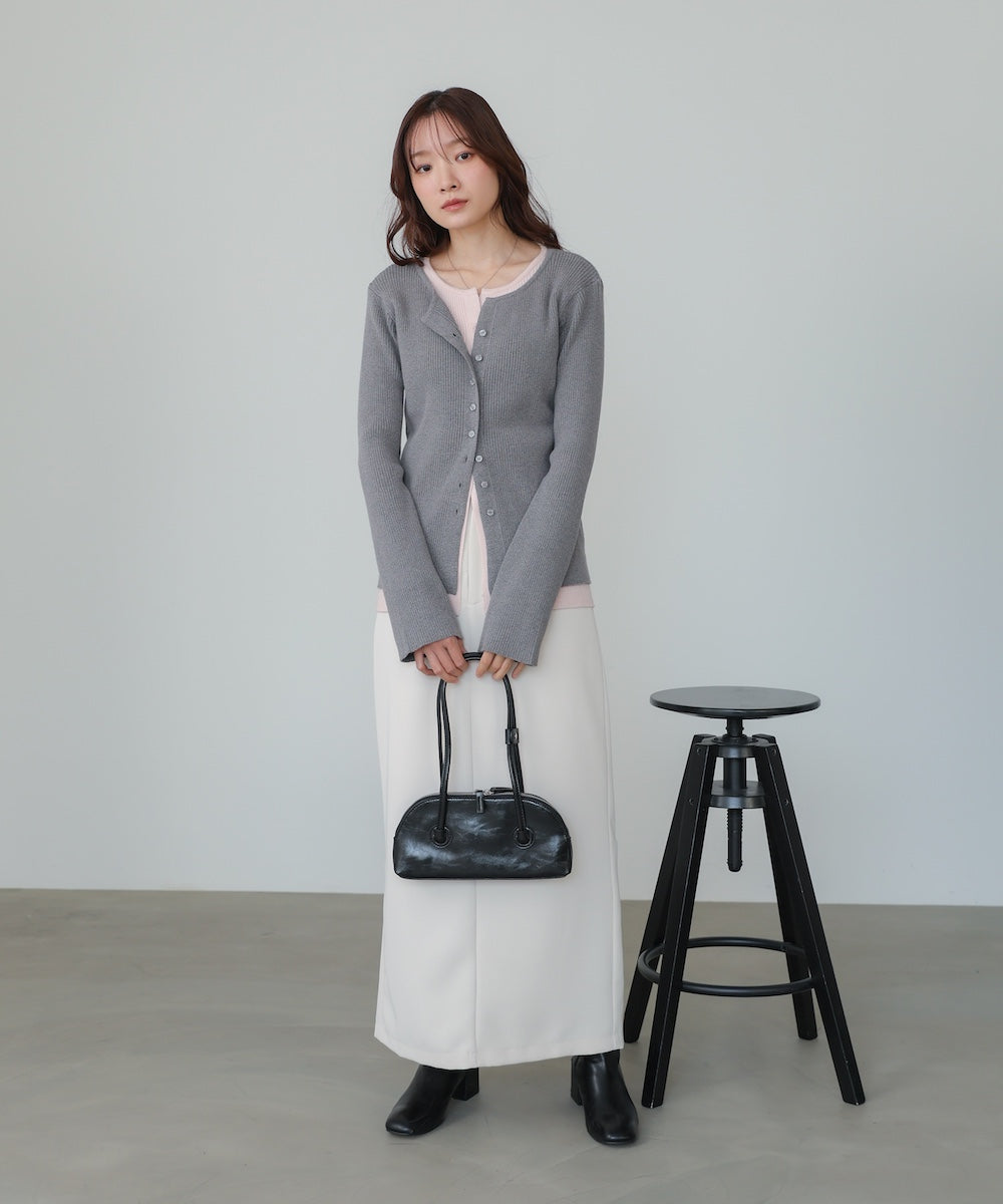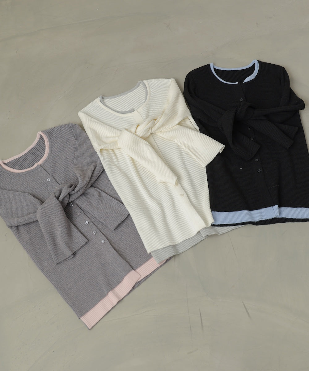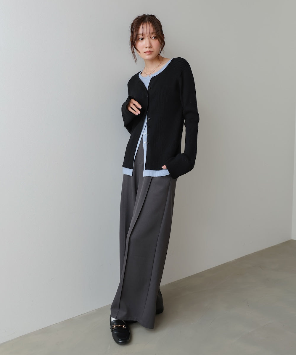 配色デザインでレイヤード風に見せた、着映え力のあるニットカーディガン。実は一体型になっており、重ね着いらずでバランスの取れたスタイリングが完成します。ボタンの開け閉めによって印象を変えられるので、きちんと感のある着こなしから程よく抜け感のあるスタイルまで幅広く対応。アイボリー×グレーは上品に、ブラック×ブルーは洗練された印象に、グレー×ピンクはさりげなく女性らしいムードを演出してくれます。通勤からデイリーまで活躍するレイヤードニットです。