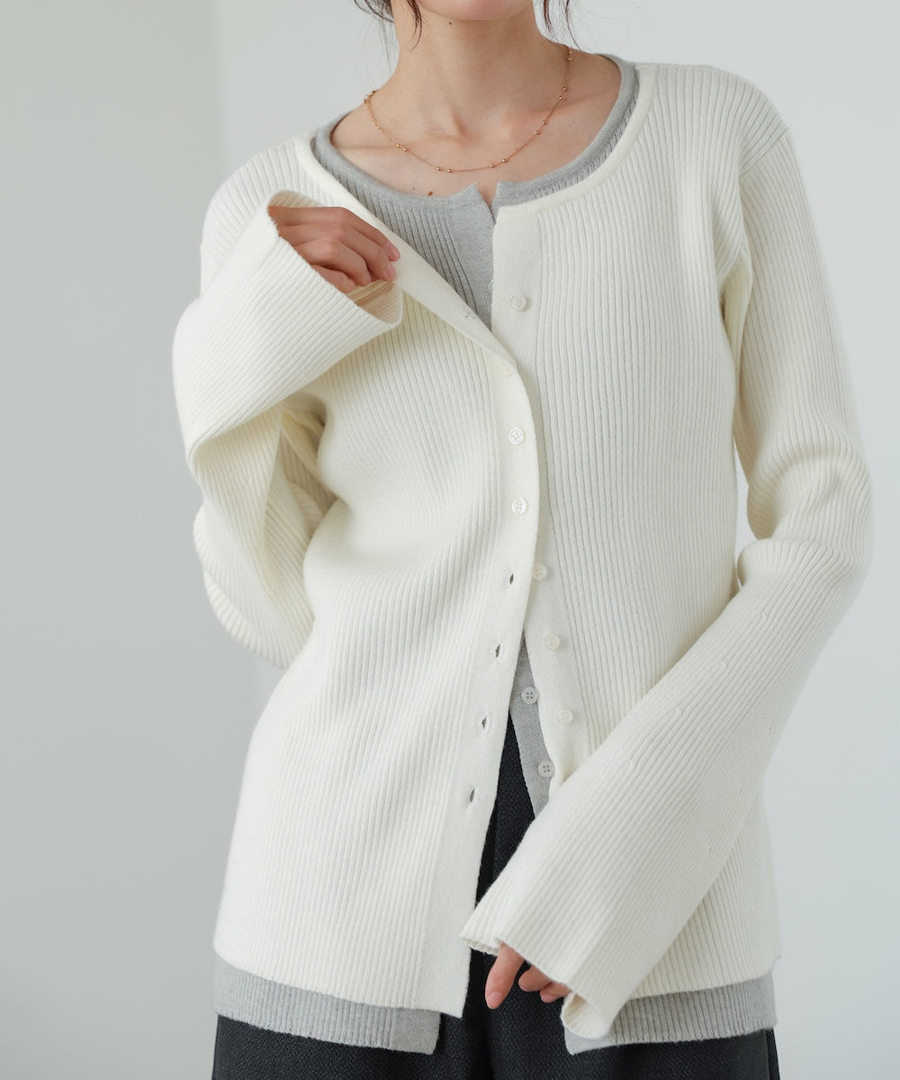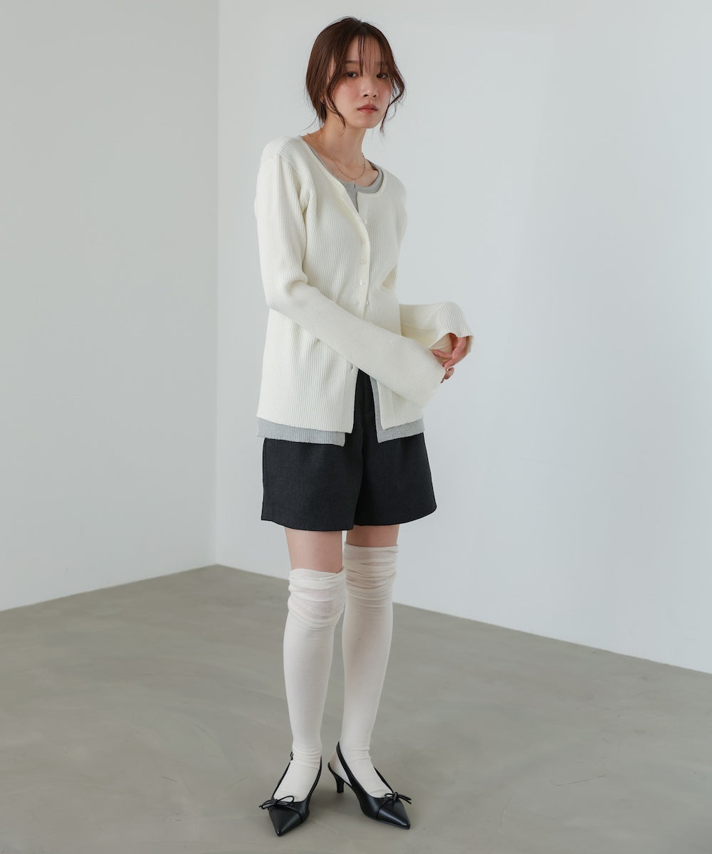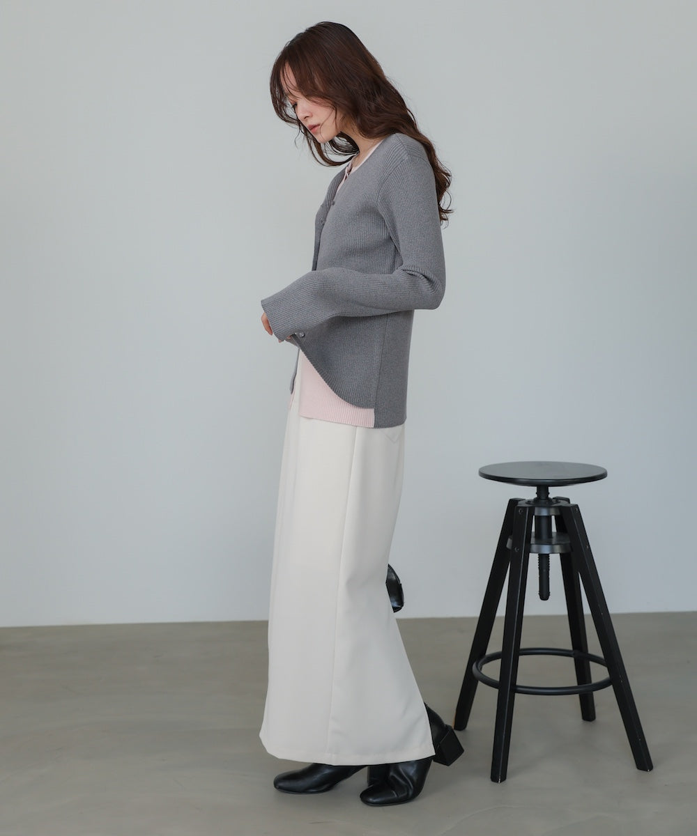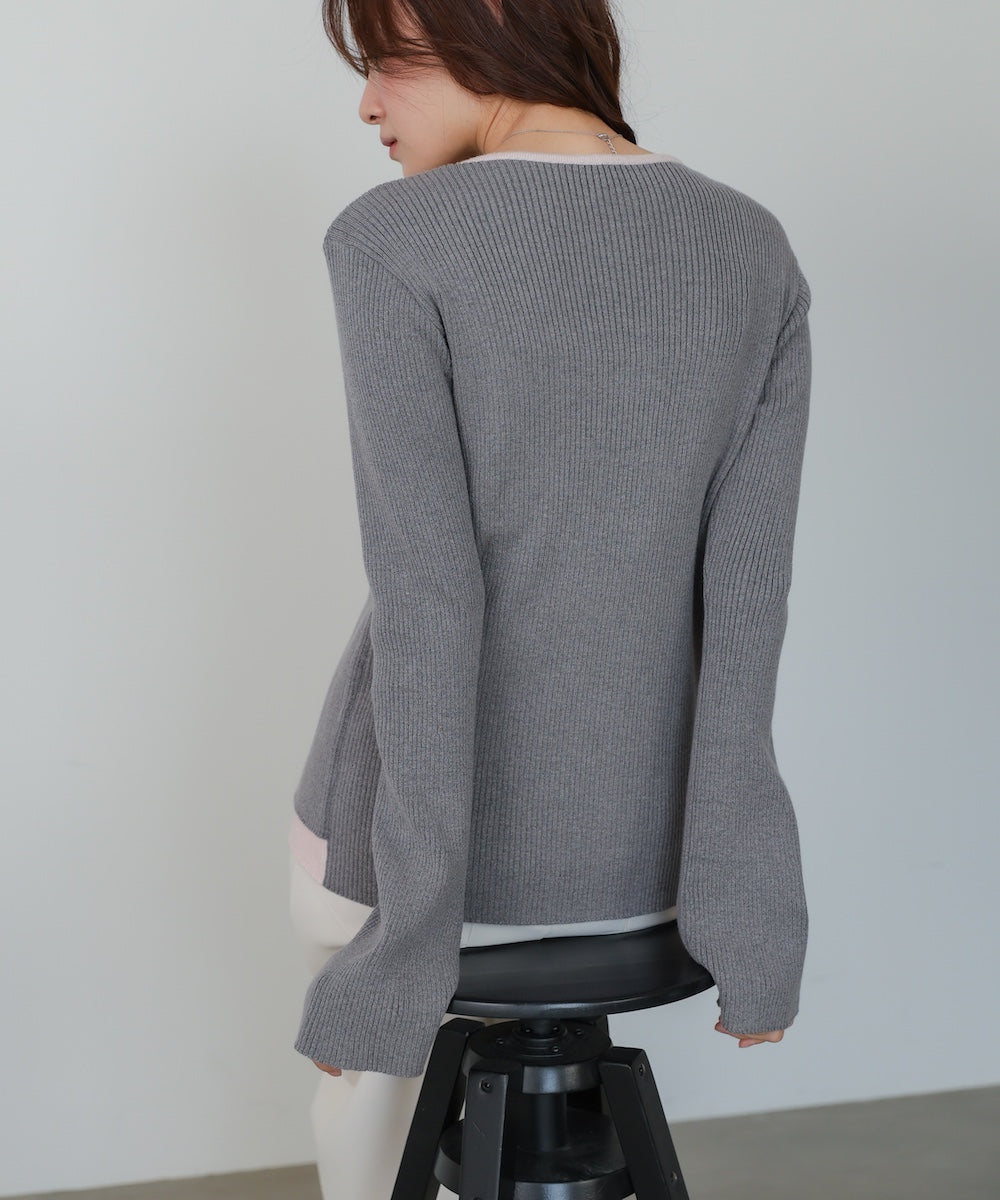 配色デザインでレイヤード風に見せた、着映え力のあるニットカーディガン。実は一体型になっており、重ね着いらずでバランスの取れたスタイリングが完成します。ボタンの開け閉めによって印象を変えられるので、きちんと感のある着こなしから程よく抜け感のあるスタイルまで幅広く対応。アイボリー×グレーは上品に、ブラック×ブルーは洗練された印象に、グレー×ピンクはさりげなく女性らしいムードを演出してくれます。通勤からデイリーまで活躍するレイヤードニットです。