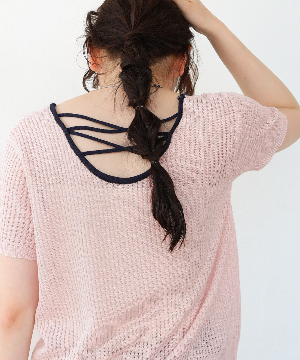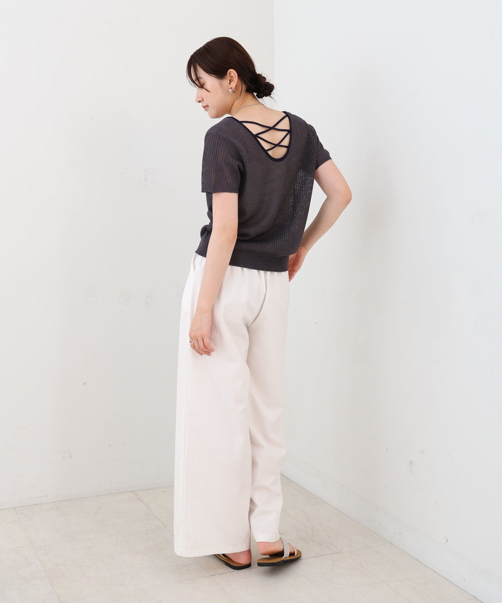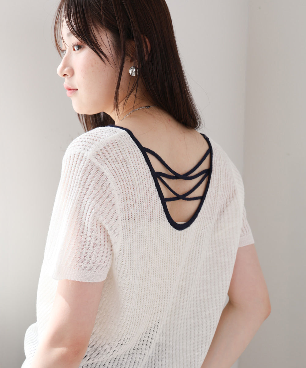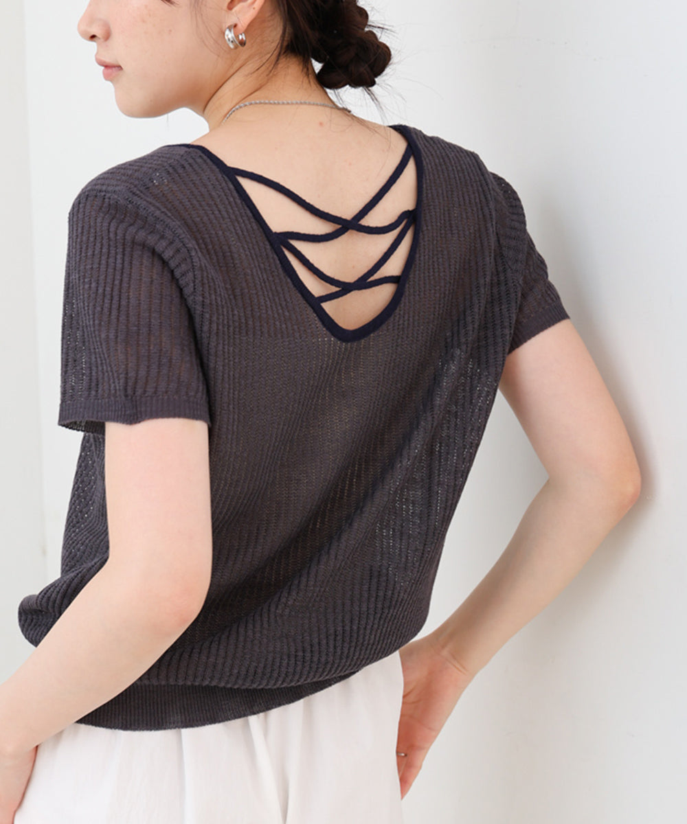 ■POINT バックレースがポイントのサマーニットトップスが登場!涼しげなニット素材に、レースアップデザインをプラスした夏映えトップス。ニットトップスならではのさりげないストライプラインがスタイルアップして見えます。ナチュラルな透け感と軽やかな肌ざわりで、暑い季節もさらりと着られる一枚です。