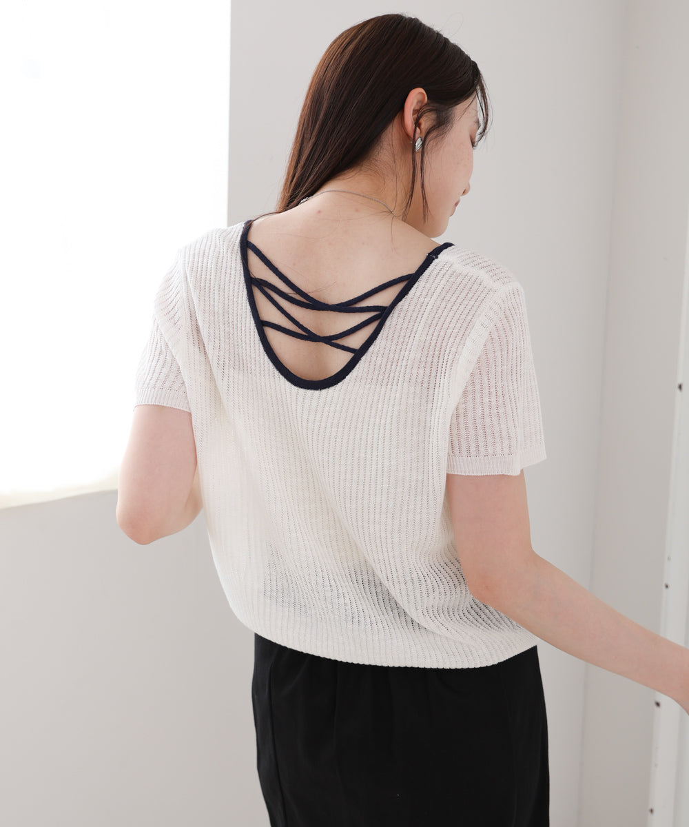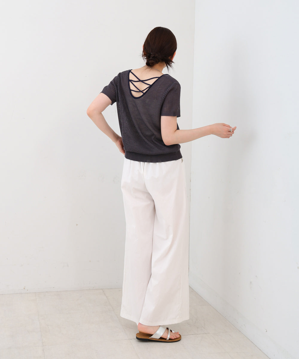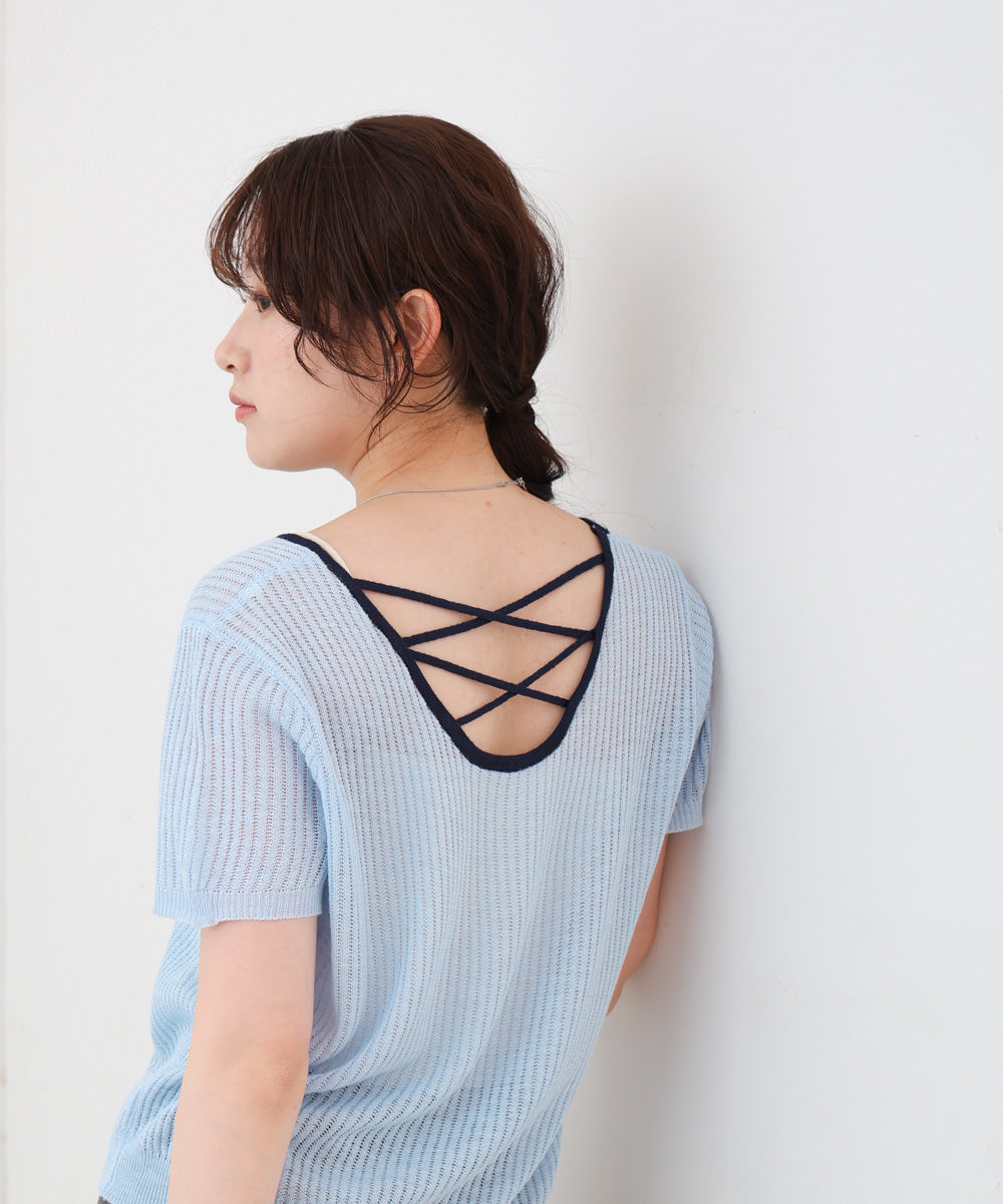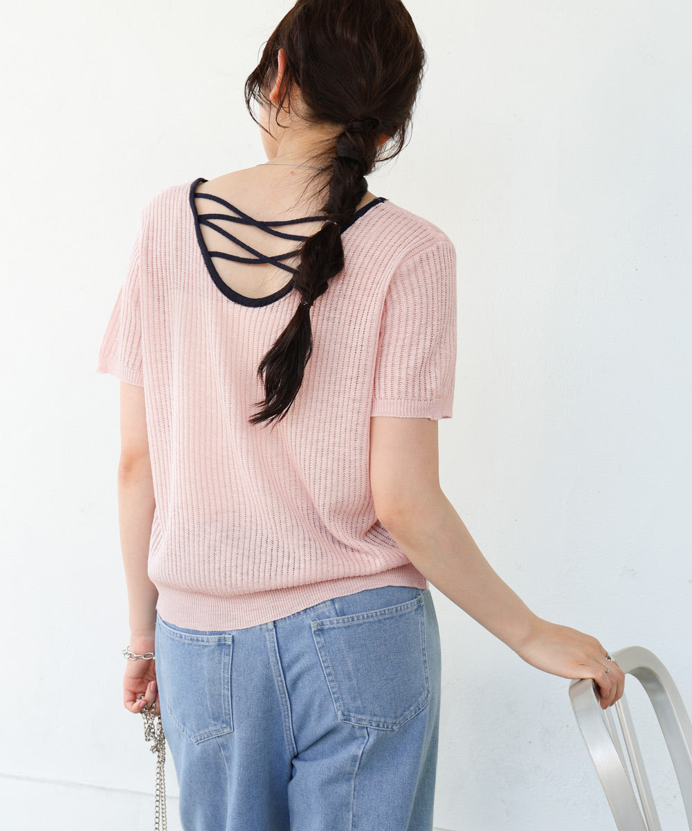 ■POINT バックレースがポイントのサマーニットトップスが登場!涼しげなニット素材に、レースアップデザインをプラスした夏映えトップス。ニットトップスならではのさりげないストライプラインがスタイルアップして見えます。ナチュラルな透け感と軽やかな肌ざわりで、暑い季節もさらりと着られる一枚です。