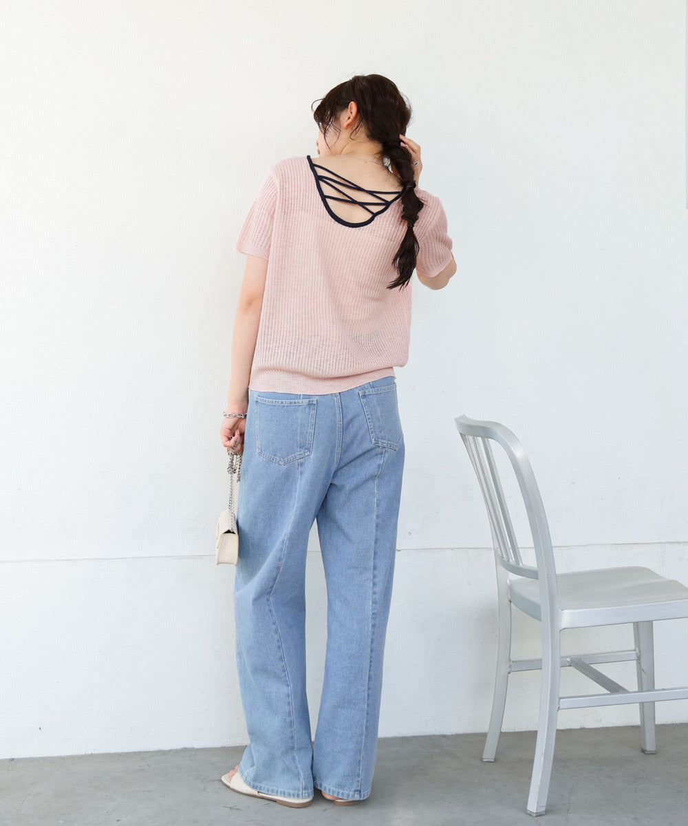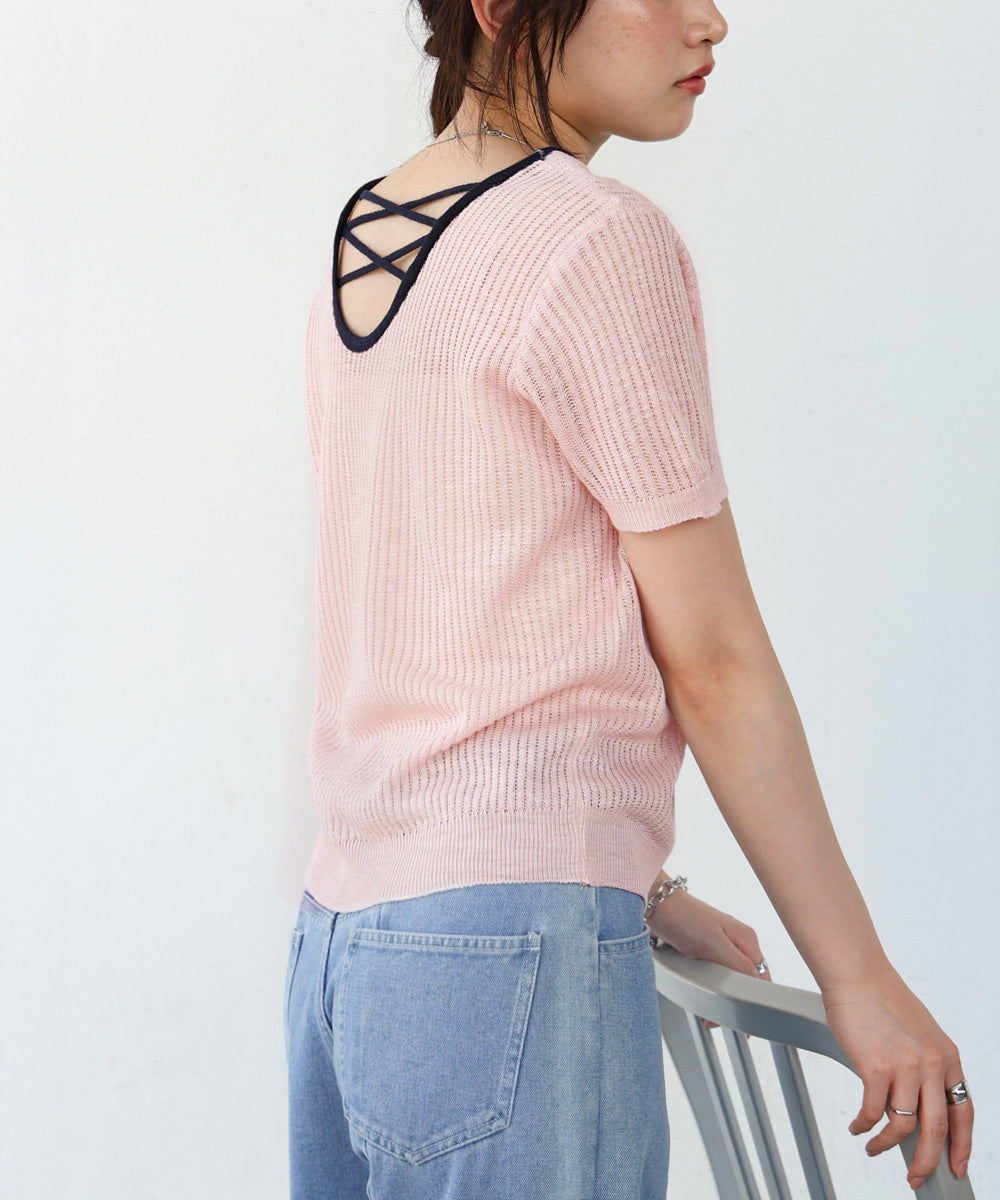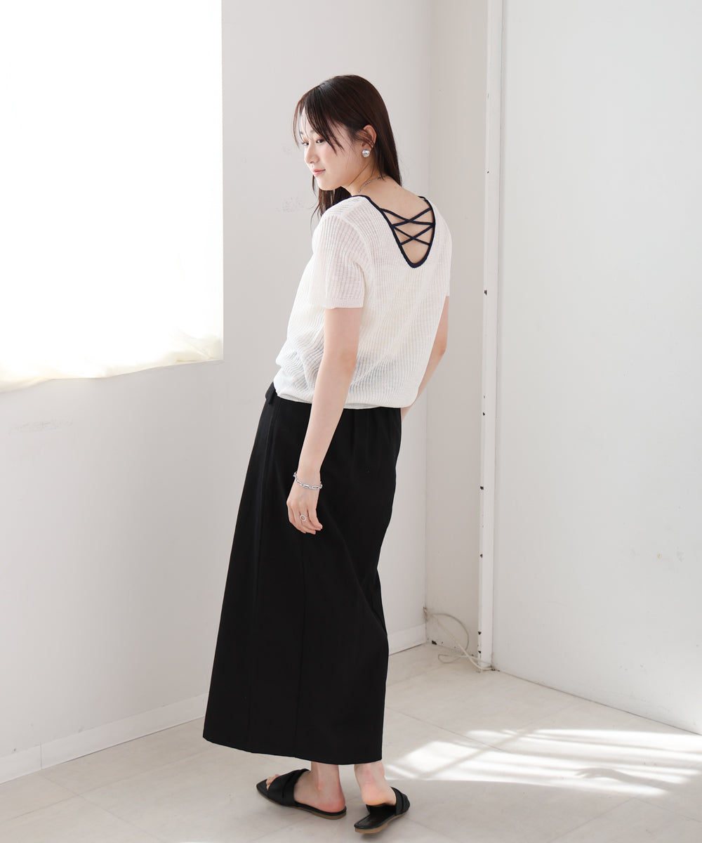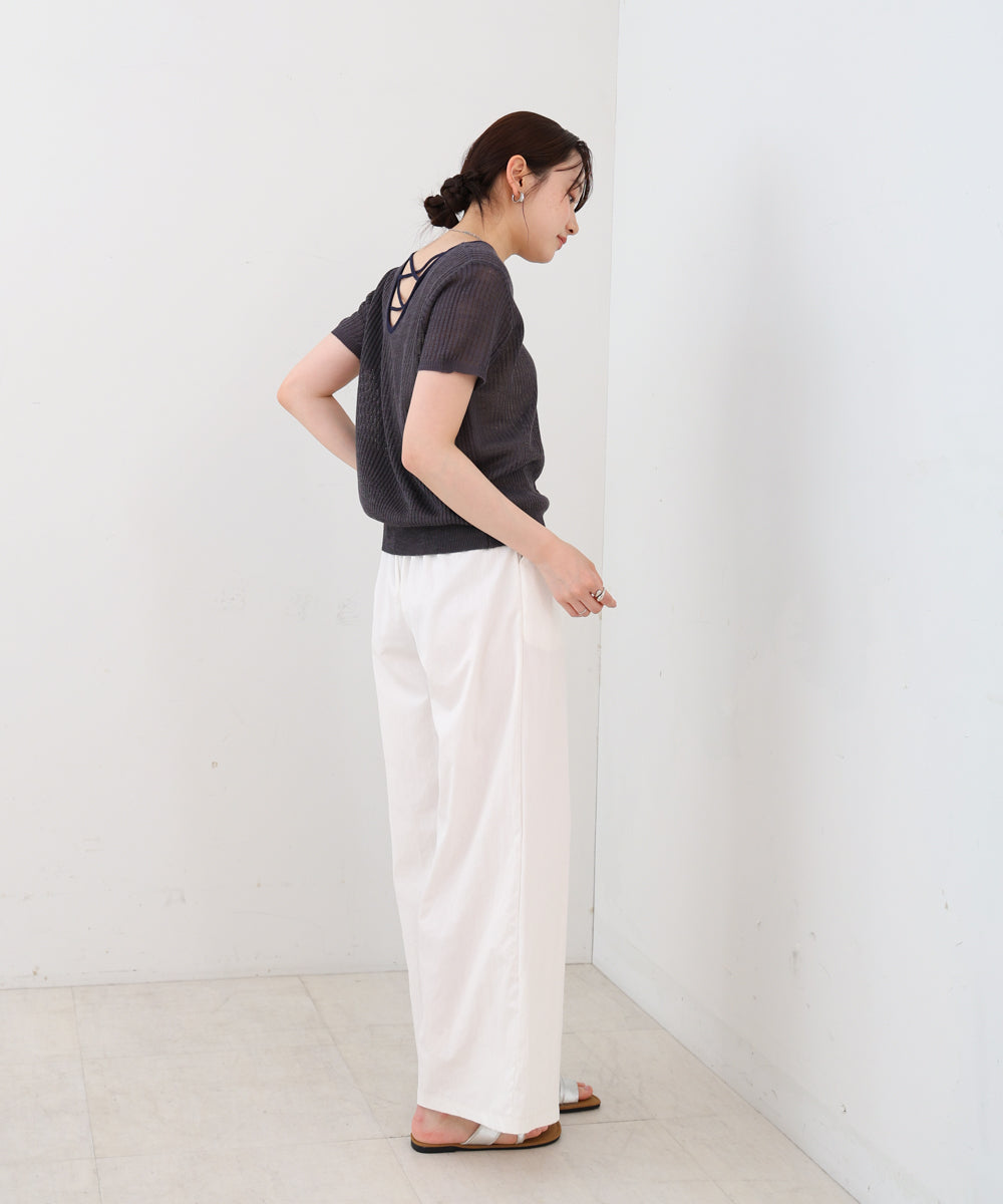 ■POINT バックレースがポイントのサマーニットトップスが登場!涼しげなニット素材に、レースアップデザインをプラスした夏映えトップス。ニットトップスならではのさりげないストライプラインがスタイルアップして見えます。ナチュラルな透け感と軽やかな肌ざわりで、暑い季節もさらりと着られる一枚です。
