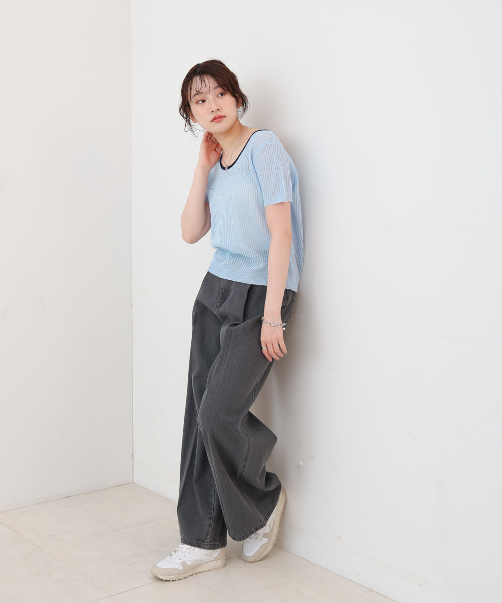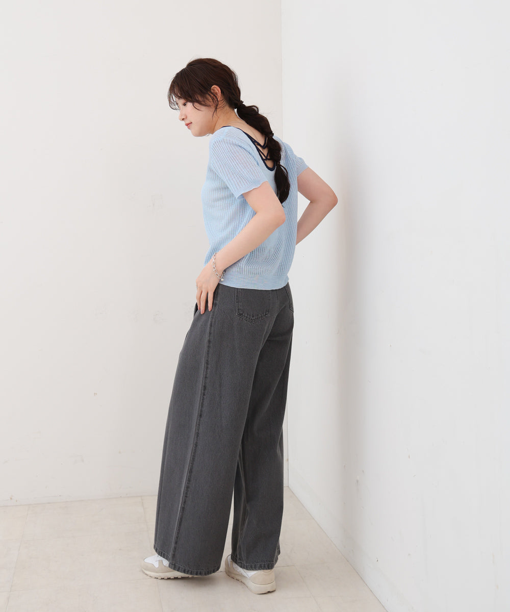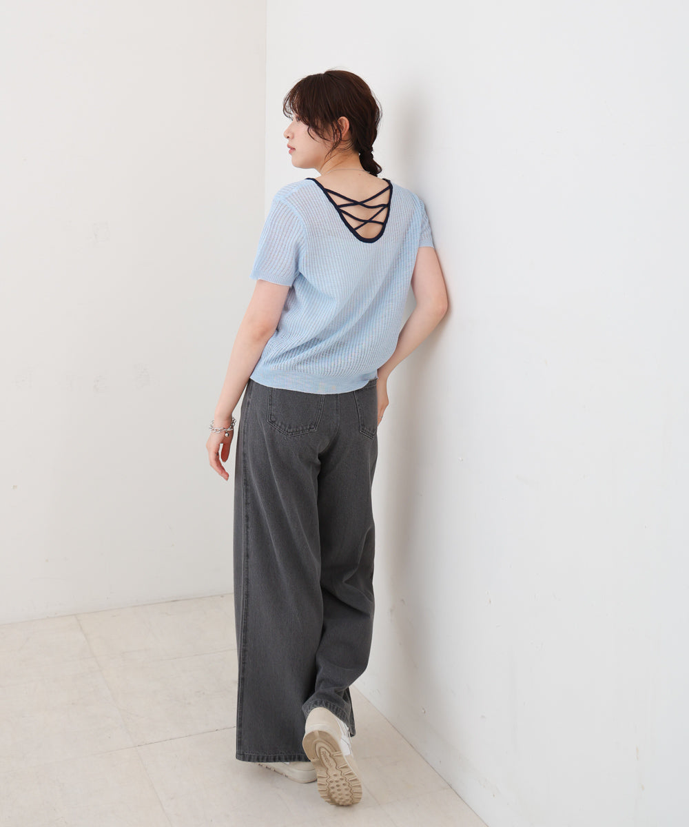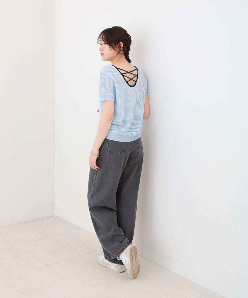 ■POINT バックレースがポイントのサマーニットトップスが登場!涼しげなニット素材に、レースアップデザインをプラスした夏映えトップス。ニットトップスならではのさりげないストライプラインがスタイルアップして見えます。ナチュラルな透け感と軽やかな肌ざわりで、暑い季節もさらりと着られる一枚です。