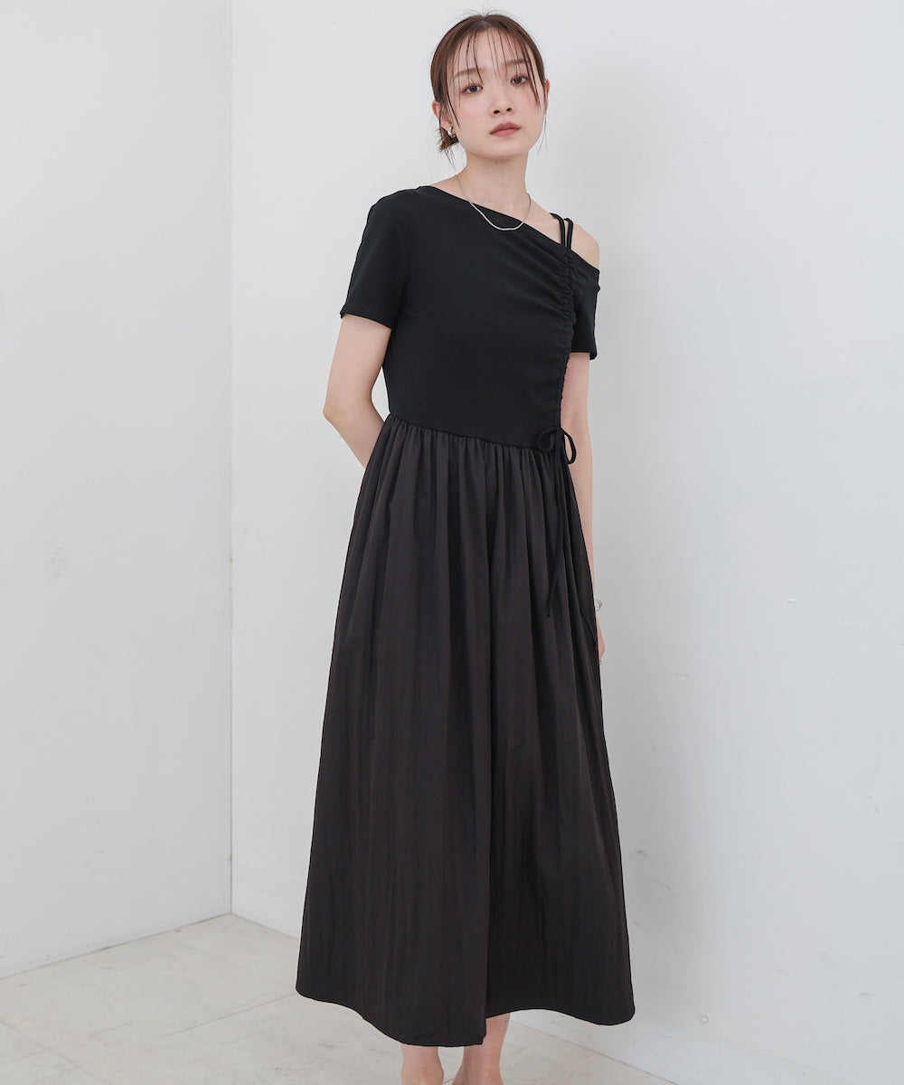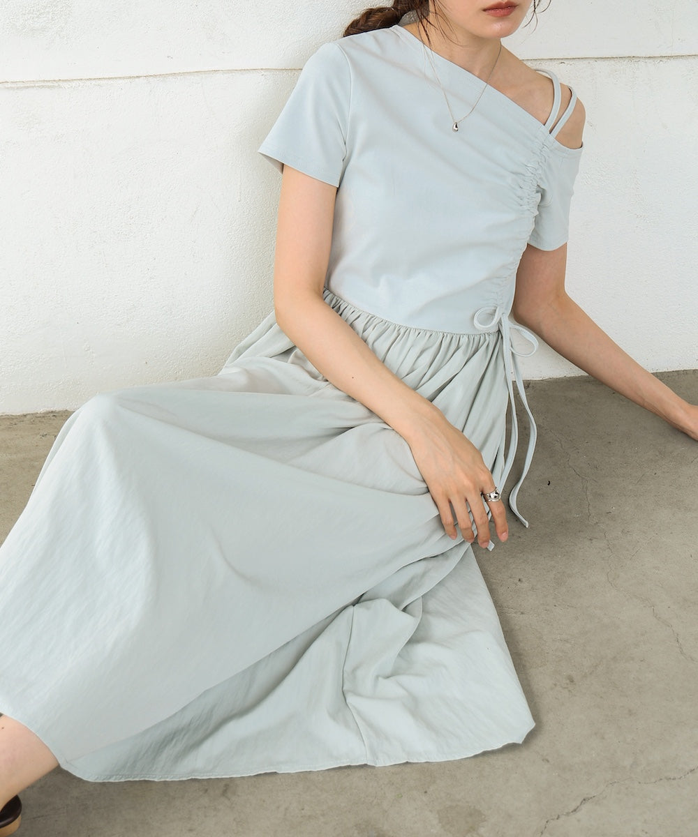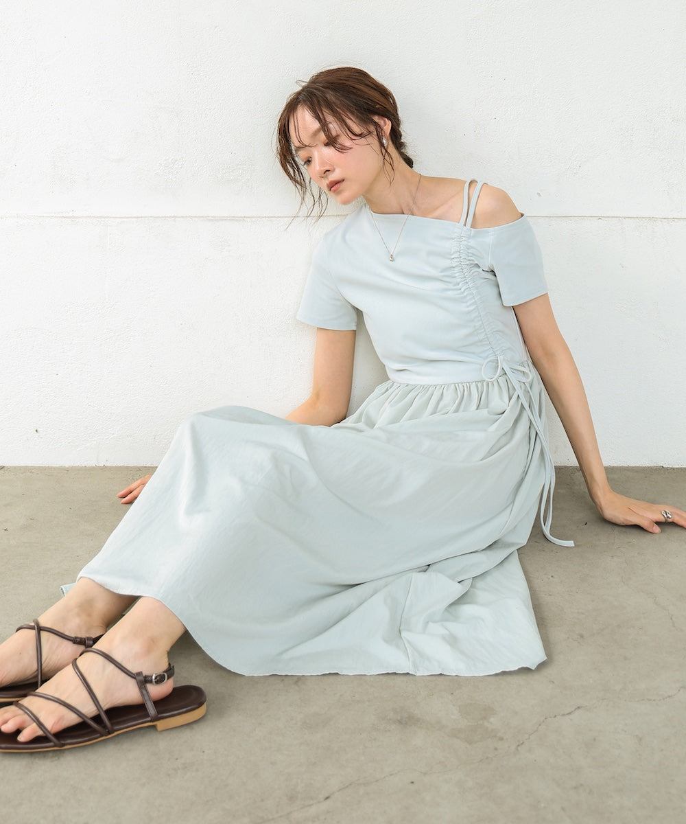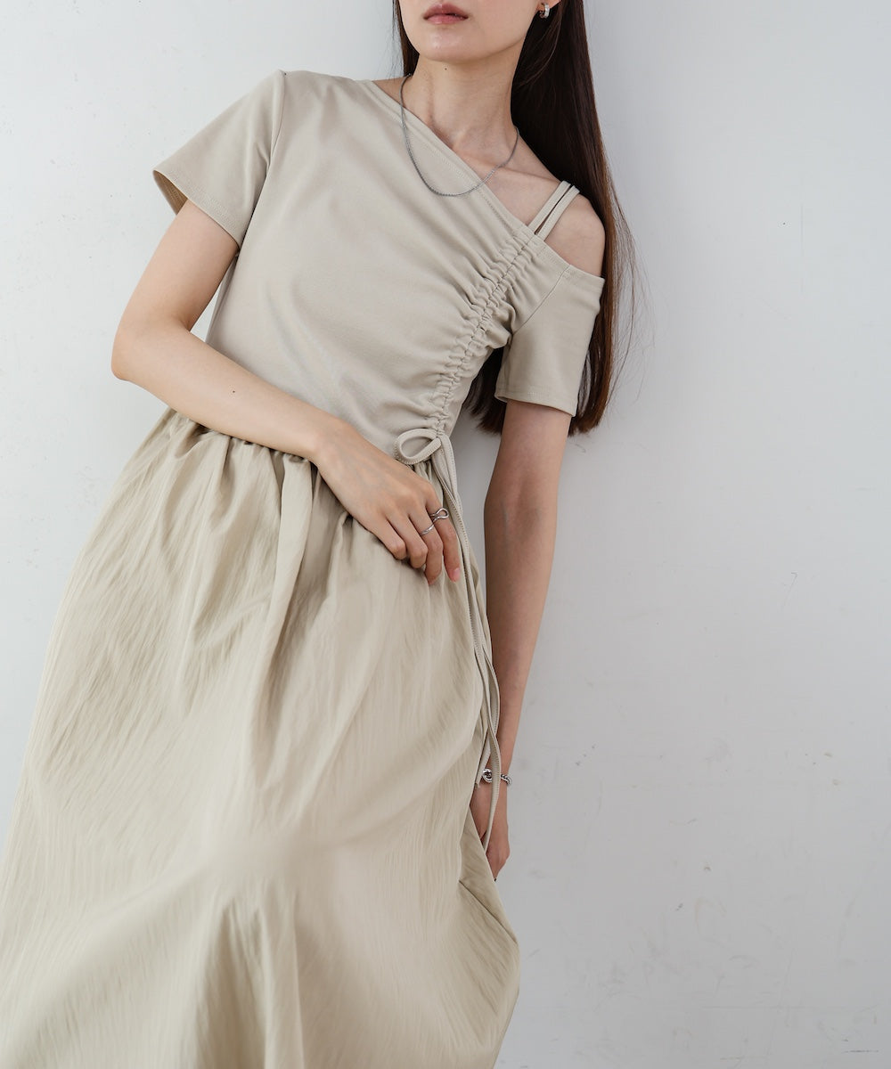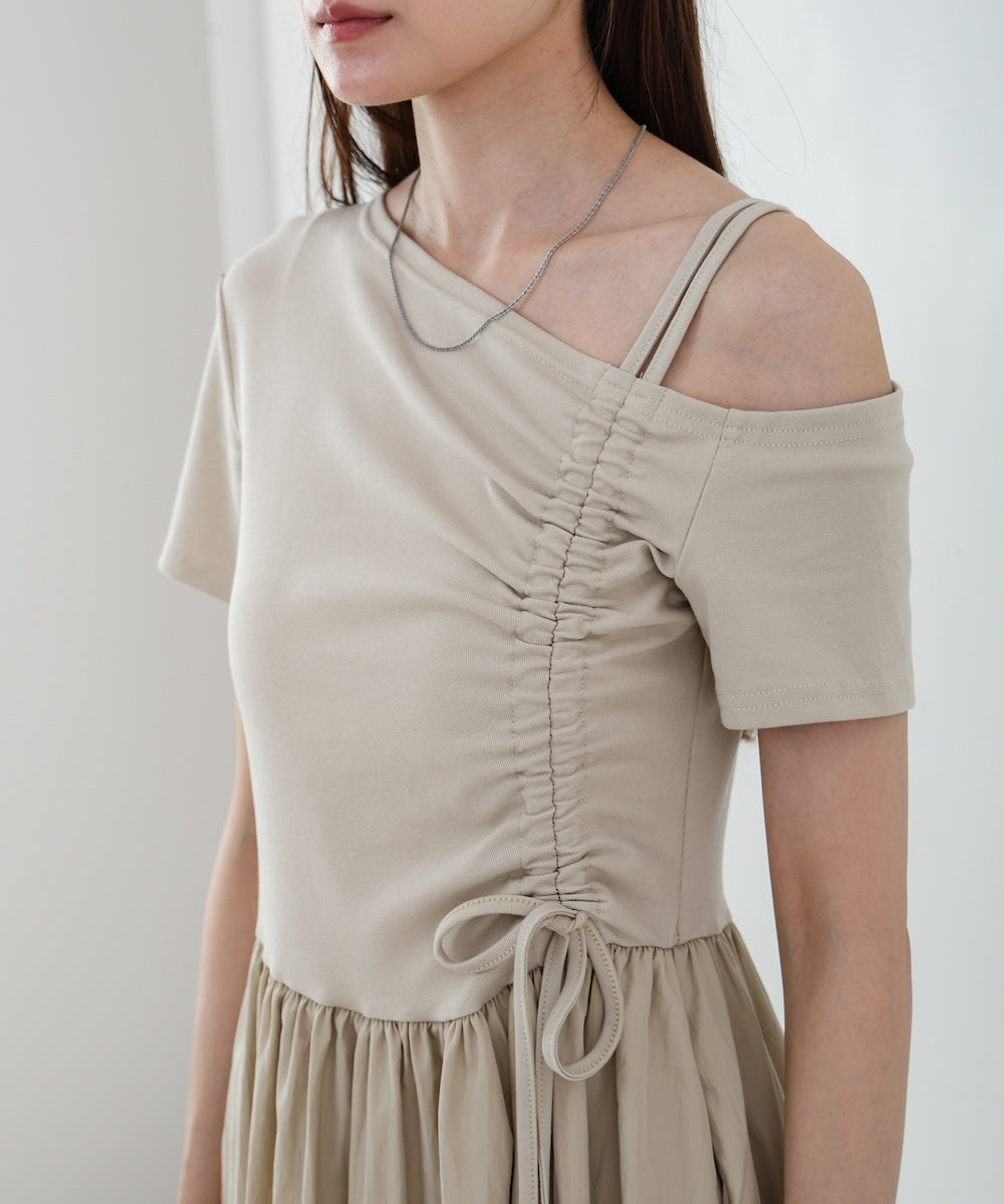 アシンメトリーデザイン×シャーリングが生み出す、立体的で印象的なシルエットが魅力の一着。片側に寄せたシャーリングディテールがウエストまで伸び、自然とスタイルアップを叶えてくれます。アシンメトリーデザイン部分も肩ひもがついているので安心して着ていただけます。