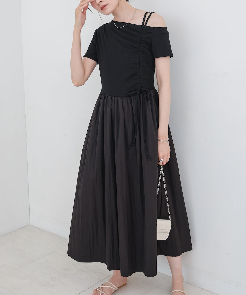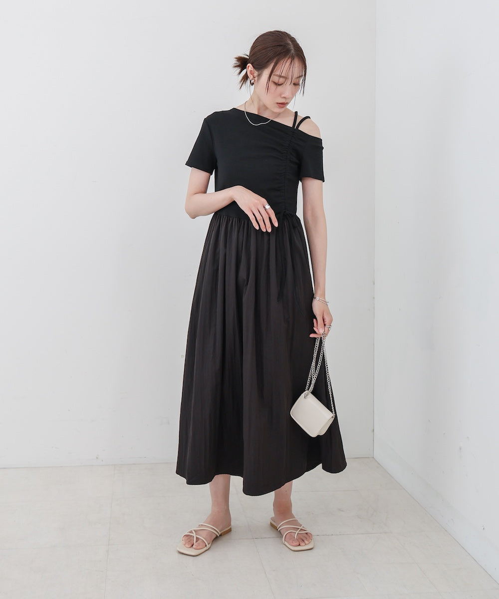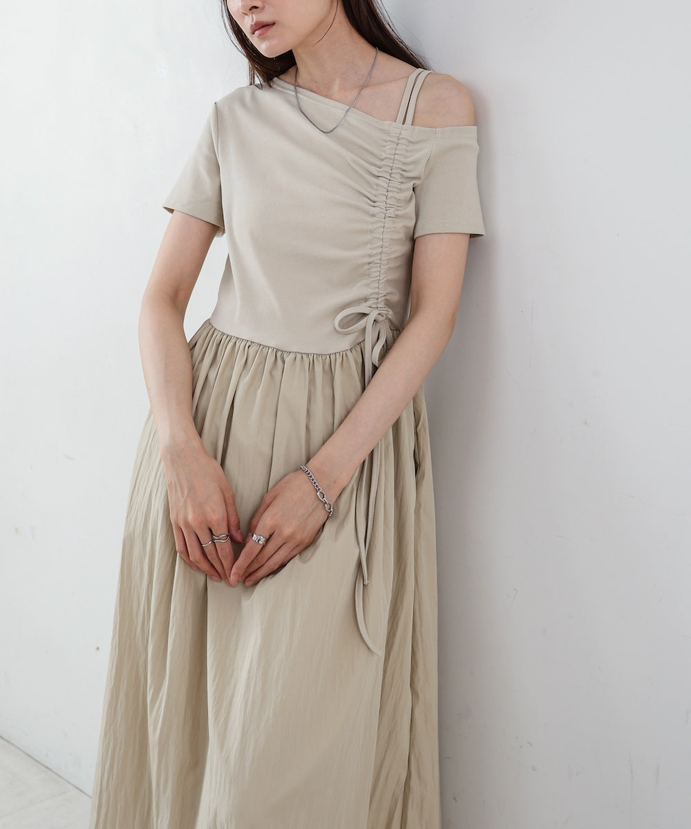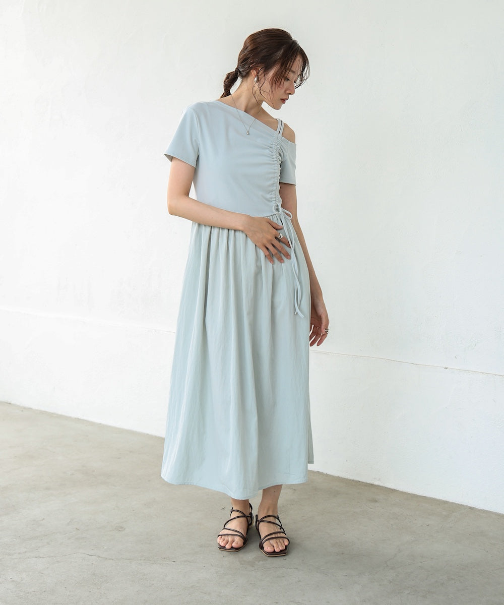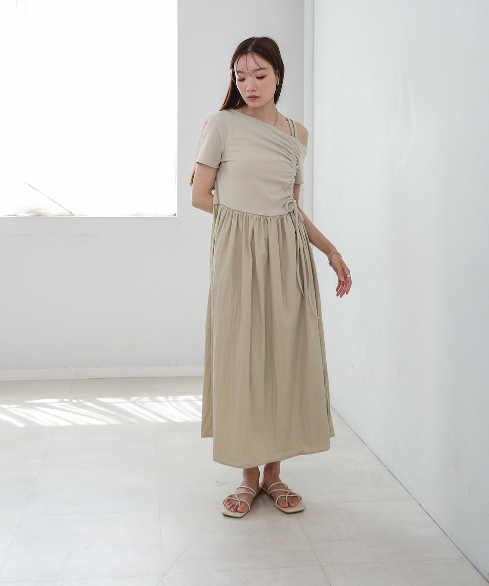 アシンメトリーデザイン×シャーリングが生み出す、立体的で印象的なシルエットが魅力の一着。片側に寄せたシャーリングディテールがウエストまで伸び、自然とスタイルアップを叶えてくれます。アシンメトリーデザイン部分も肩ひもがついているので安心して着ていただけます。