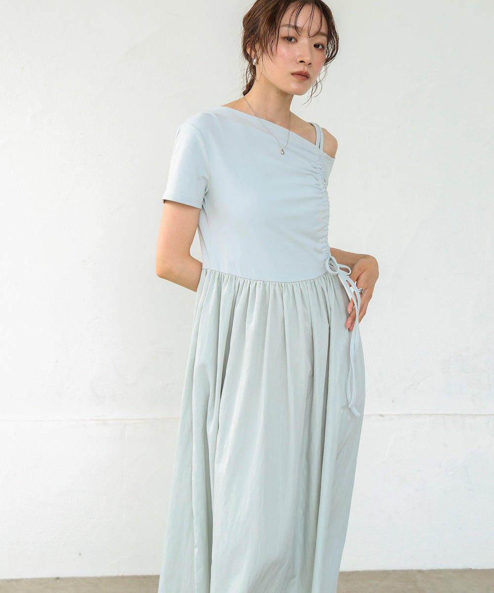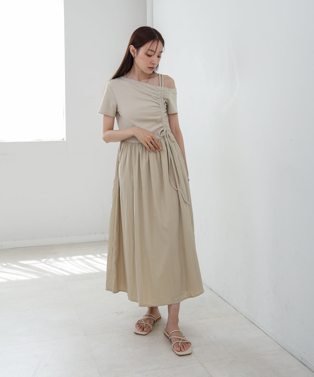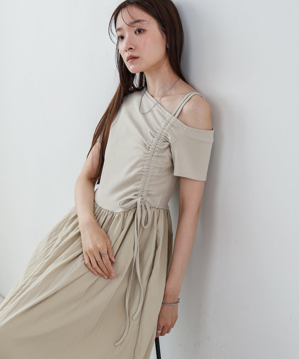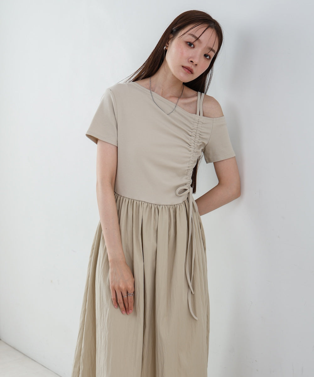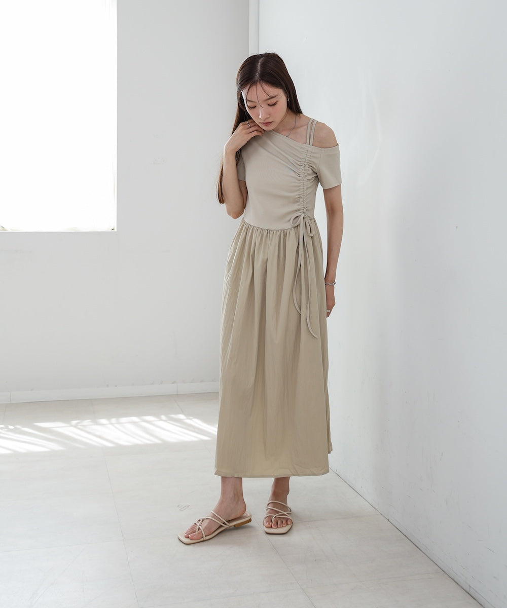 アシンメトリーデザイン×シャーリングが生み出す、立体的で印象的なシルエットが魅力の一着。片側に寄せたシャーリングディテールがウエストまで伸び、自然とスタイルアップを叶えてくれます。アシンメトリーデザイン部分も肩ひもがついているので安心して着ていただけます。