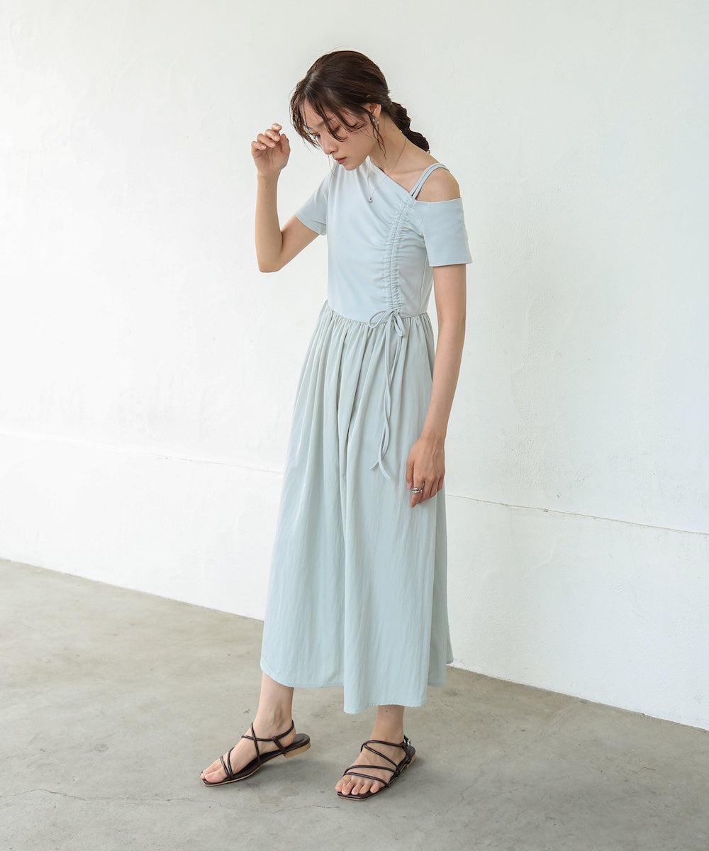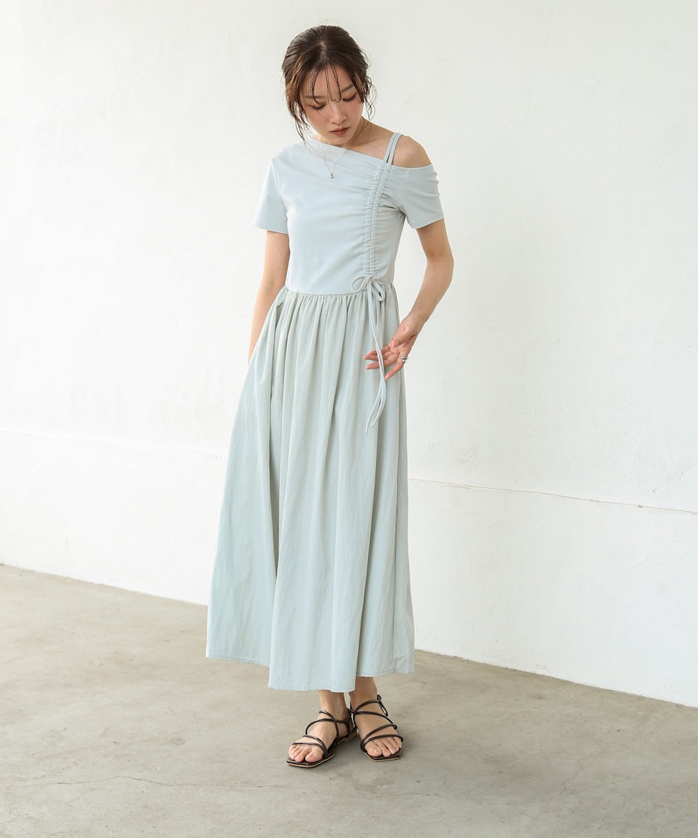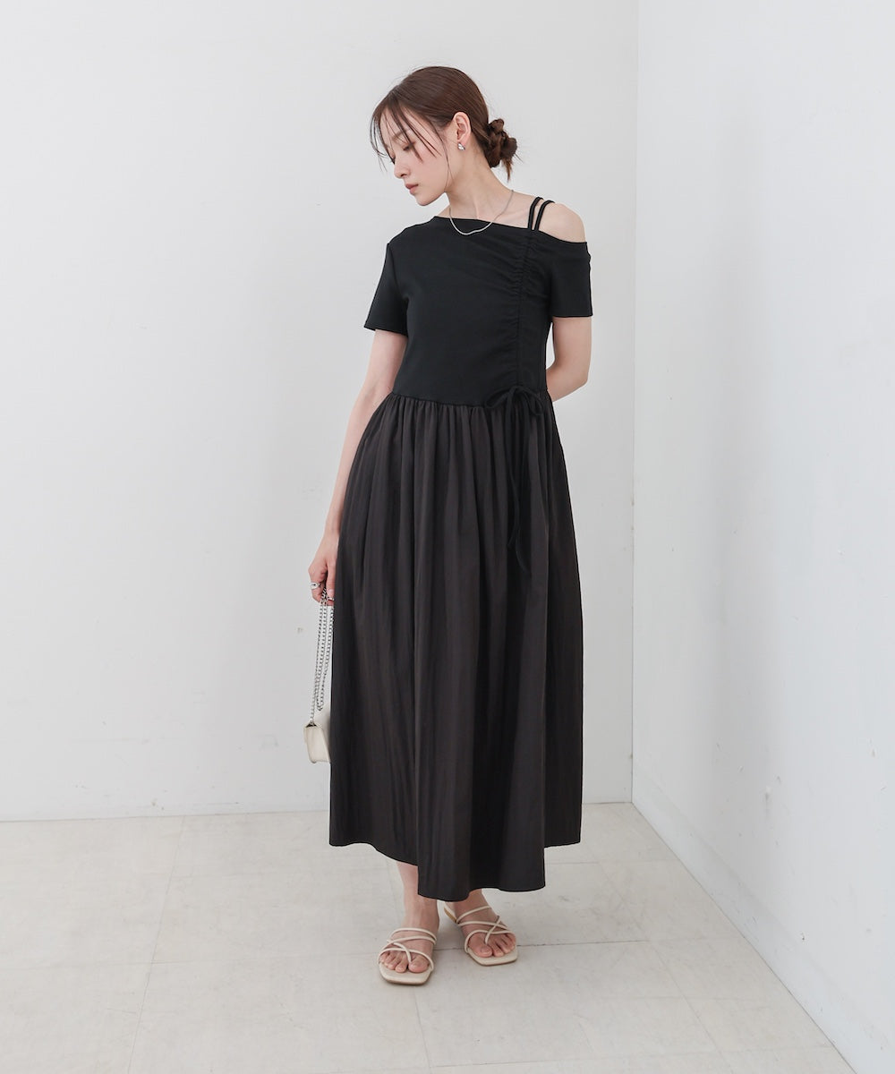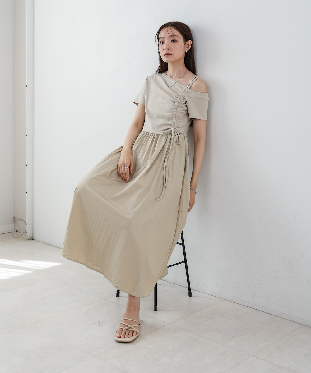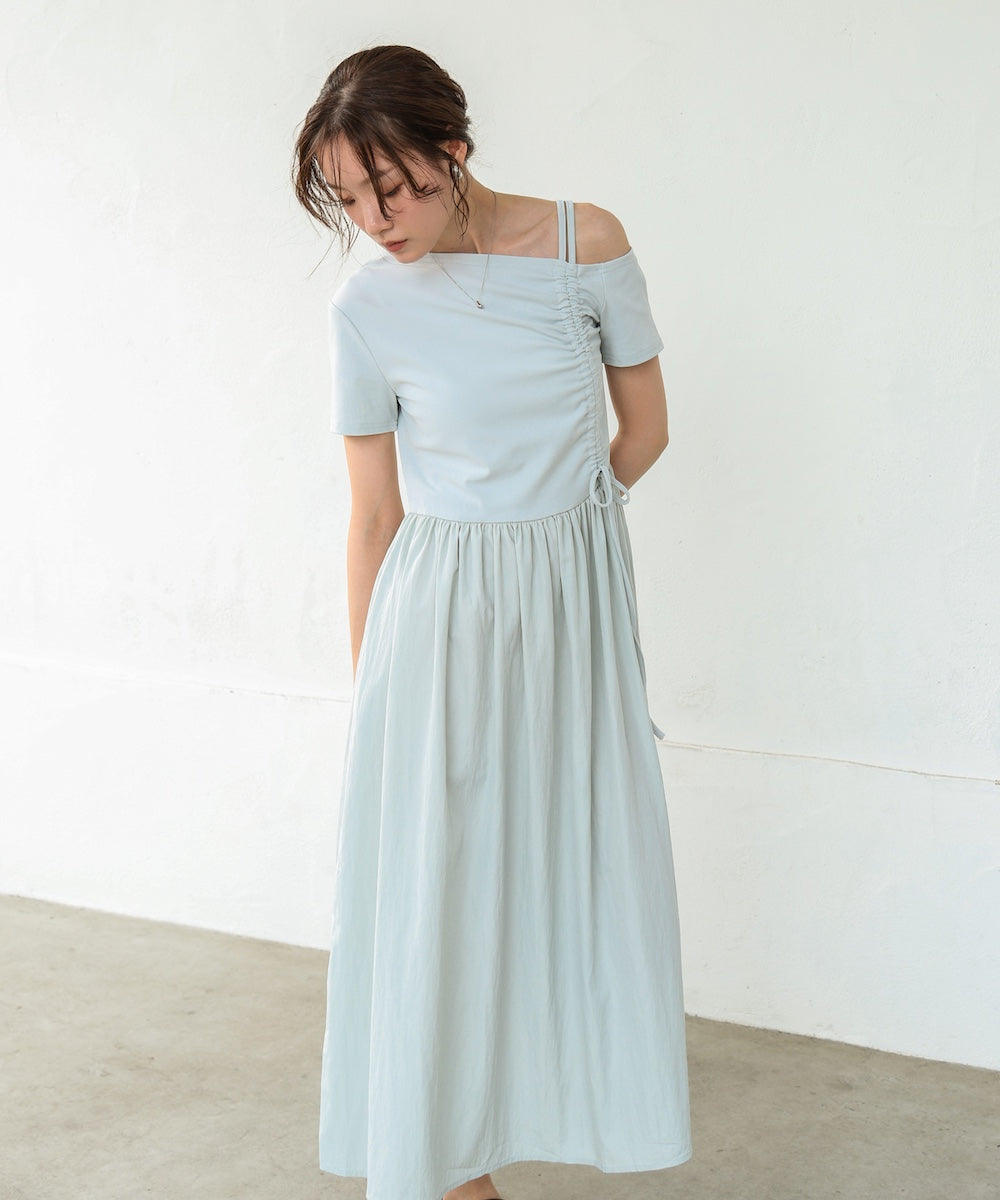 アシンメトリーデザイン×シャーリングが生み出す、立体的で印象的なシルエットが魅力の一着。片側に寄せたシャーリングディテールがウエストまで伸び、自然とスタイルアップを叶えてくれます。アシンメトリーデザイン部分も肩ひもがついているので安心して着ていただけます。