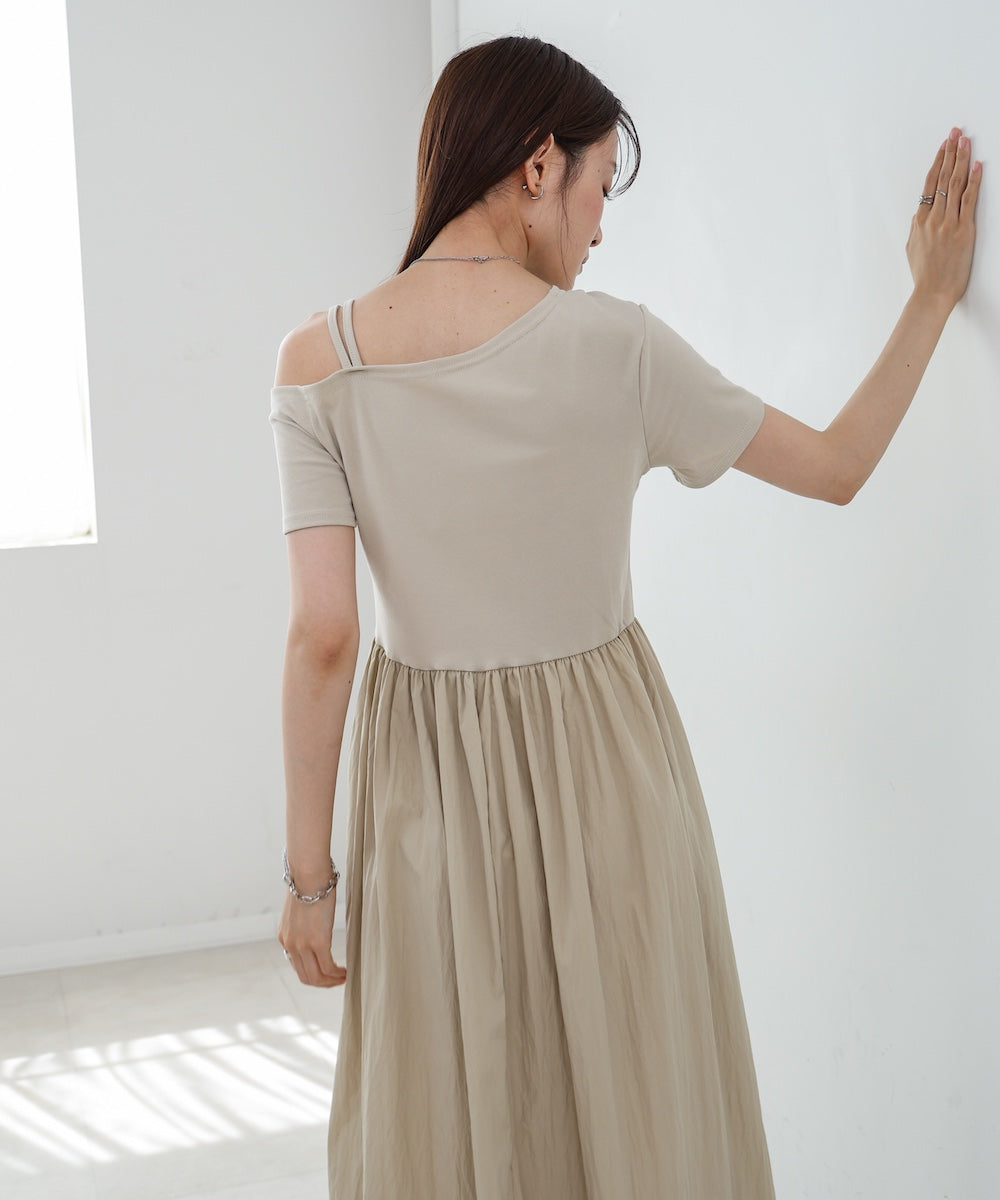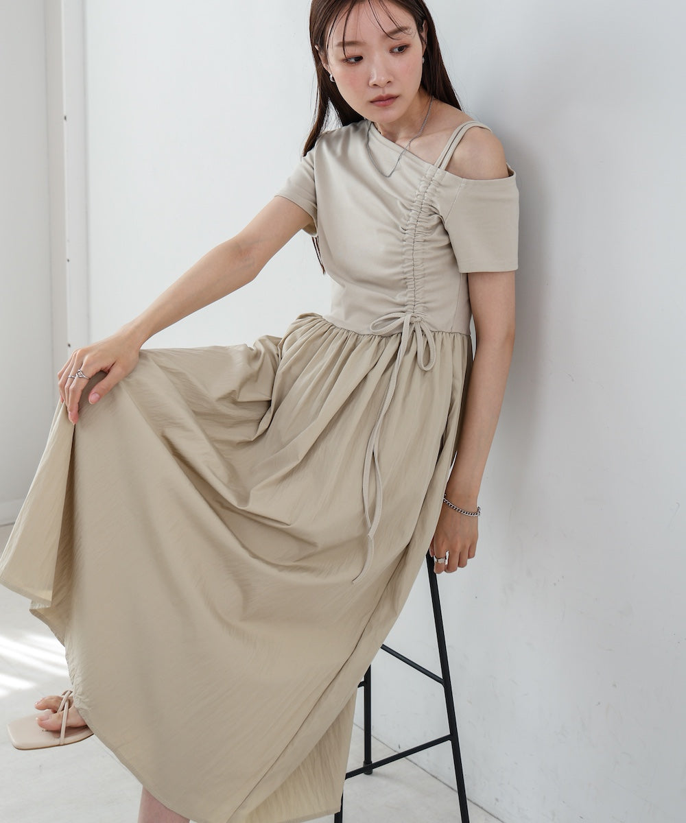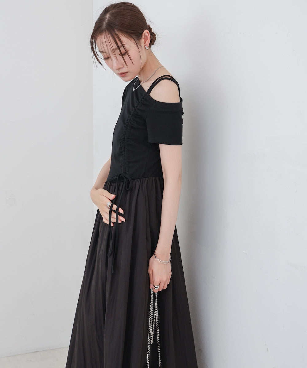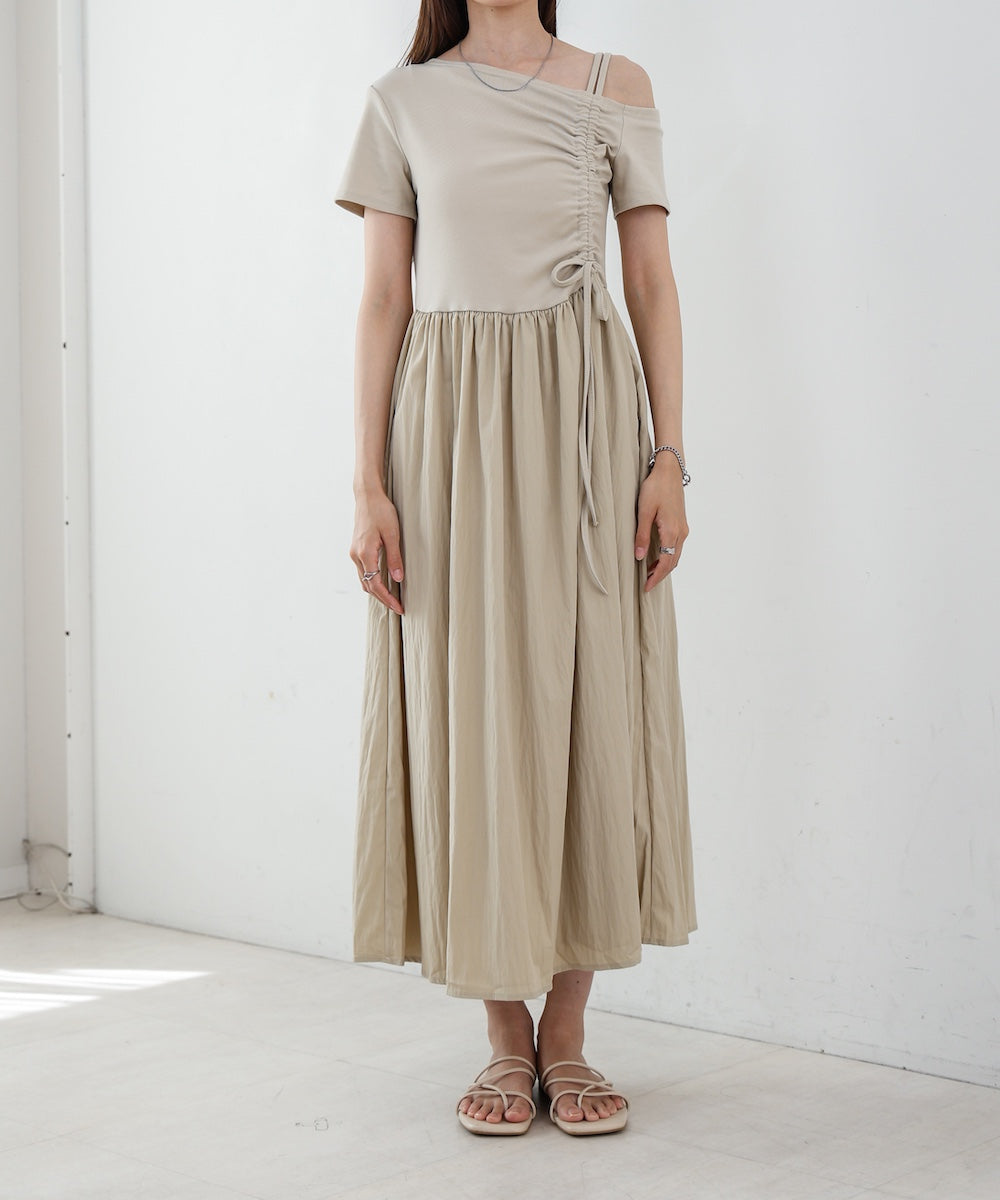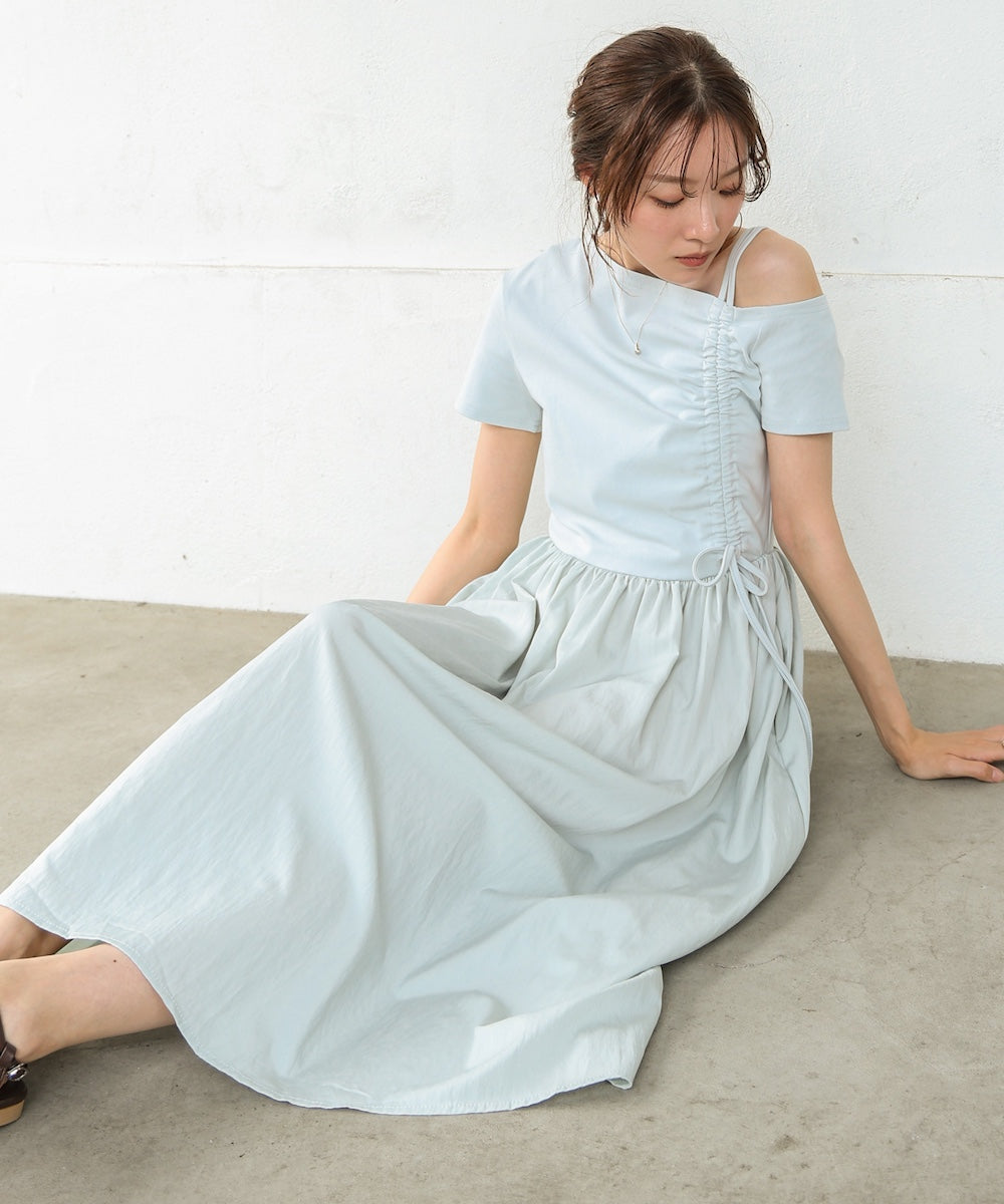 アシンメトリーデザイン×シャーリングが生み出す、立体的で印象的なシルエットが魅力の一着。片側に寄せたシャーリングディテールがウエストまで伸び、自然とスタイルアップを叶えてくれます。アシンメトリーデザイン部分も肩ひもがついているので安心して着ていただけます。