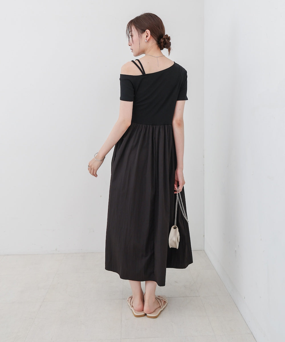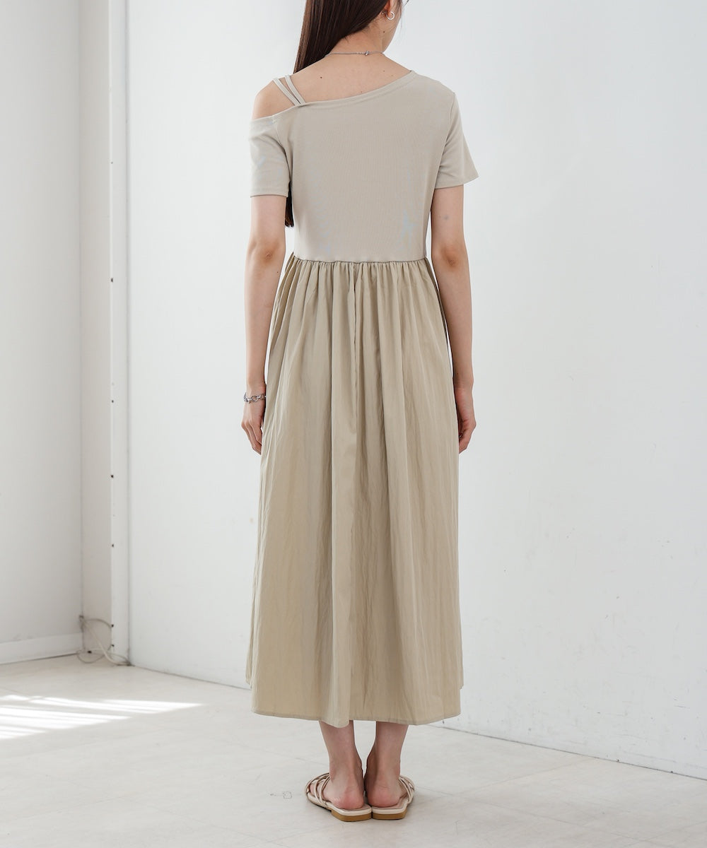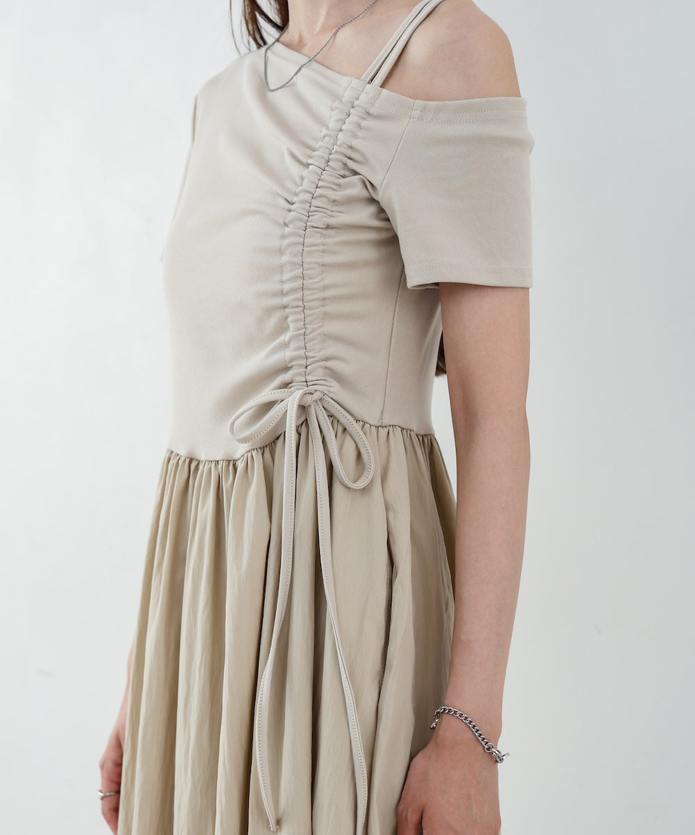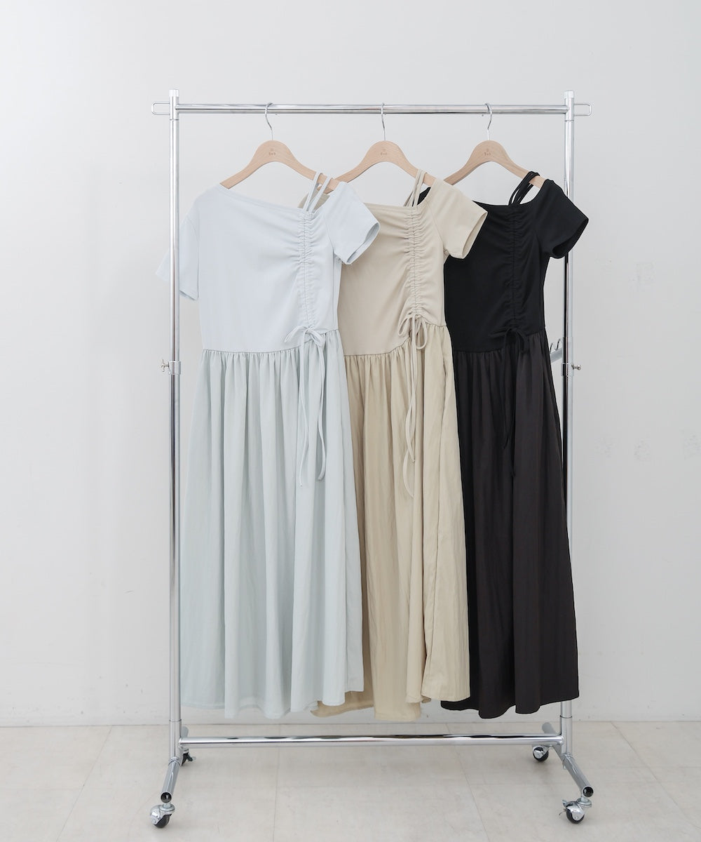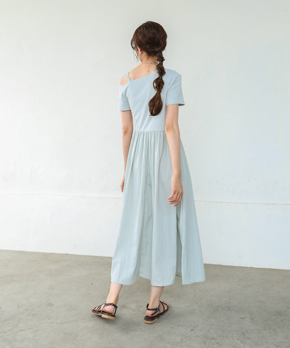アシンメトリーデザイン×シャーリングが生み出す、立体的で印象的なシルエットが魅力の一着。片側に寄せたシャーリングディテールがウエストまで伸び、自然とスタイルアップを叶えてくれます。アシンメトリーデザイン部分も肩ひもがついているので安心して着ていただけます。