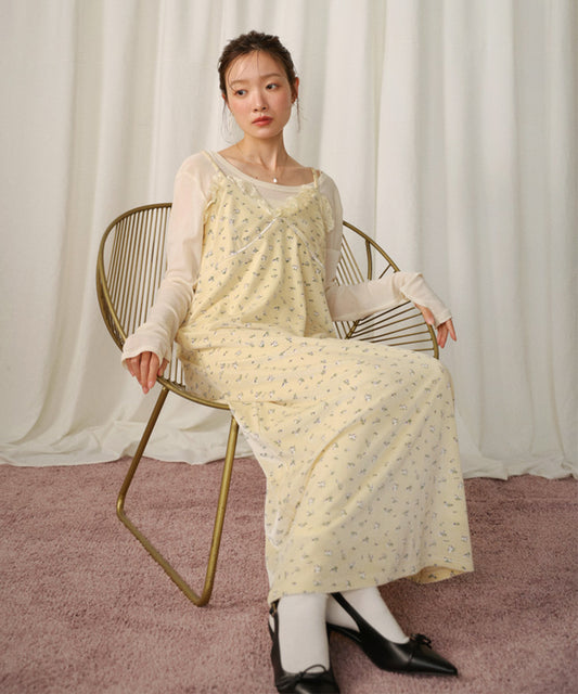 小花柄レース付きベロアキャミワンピース