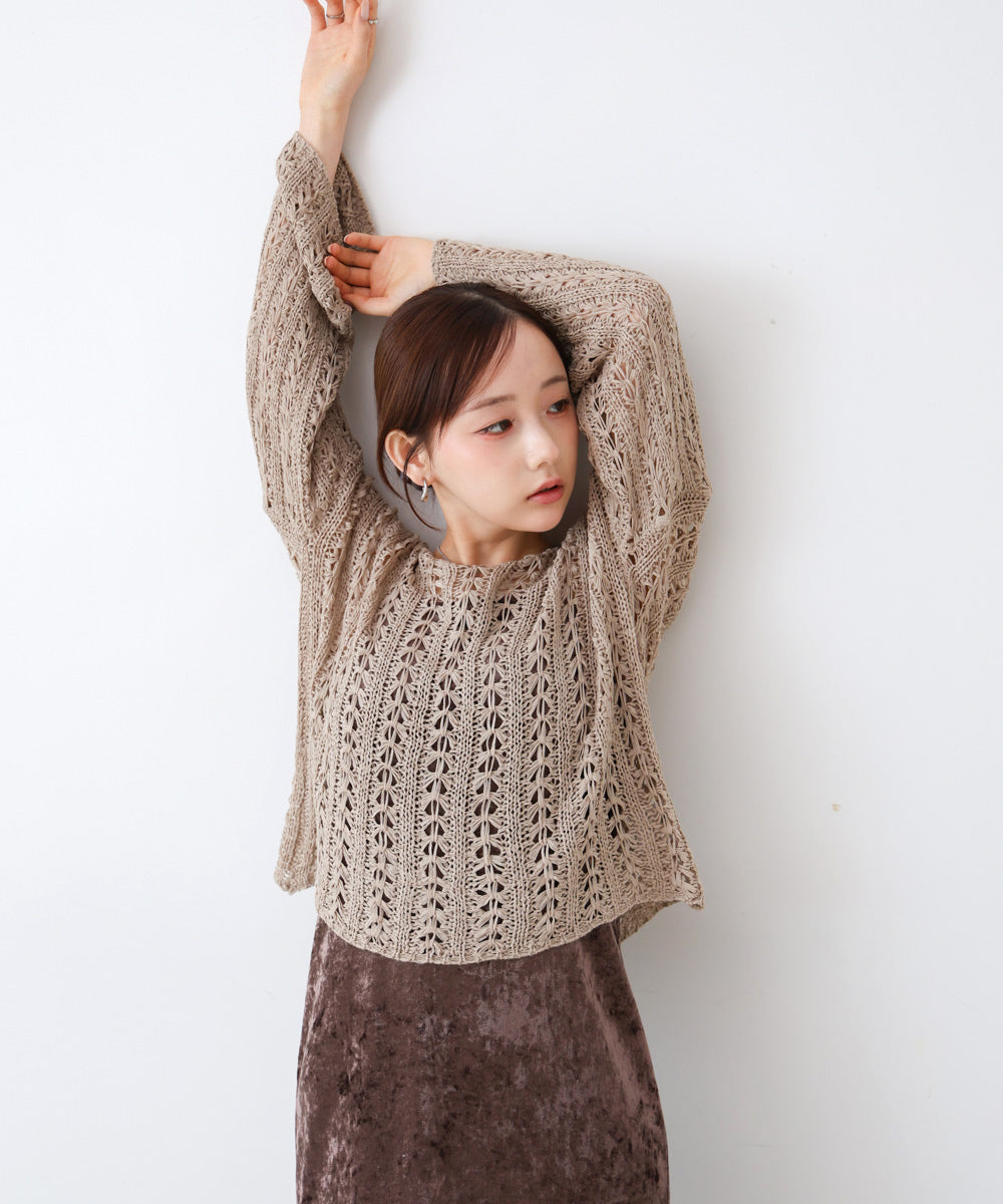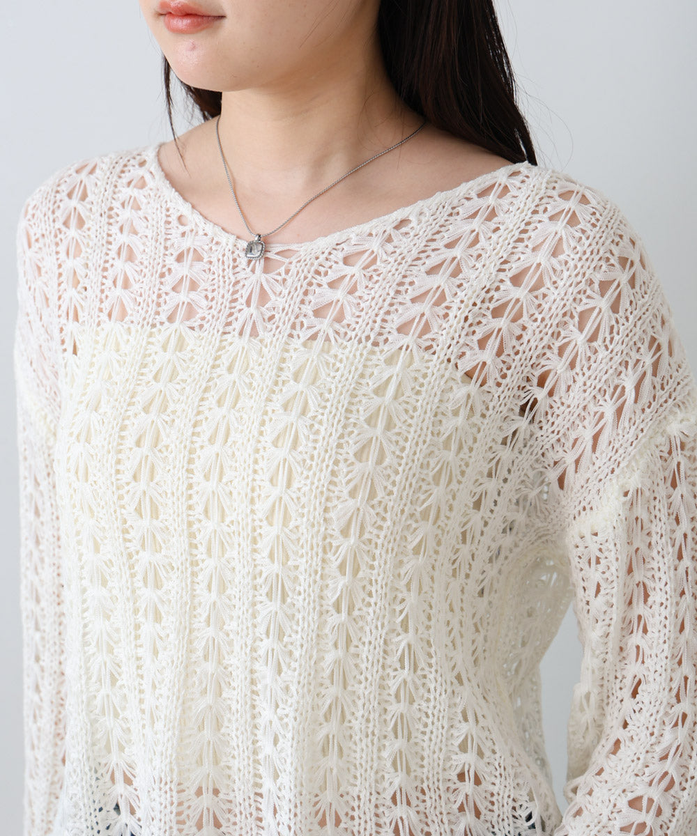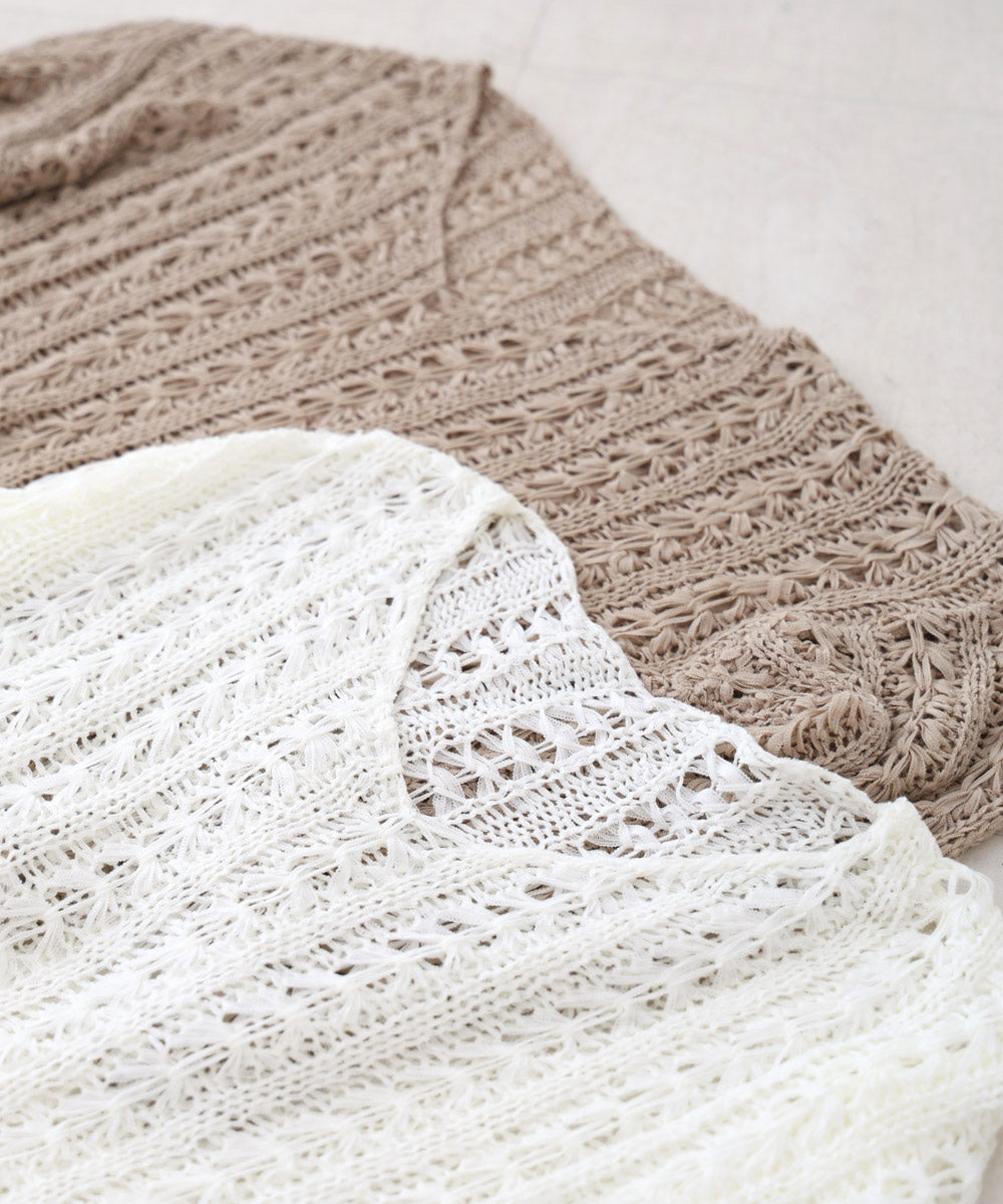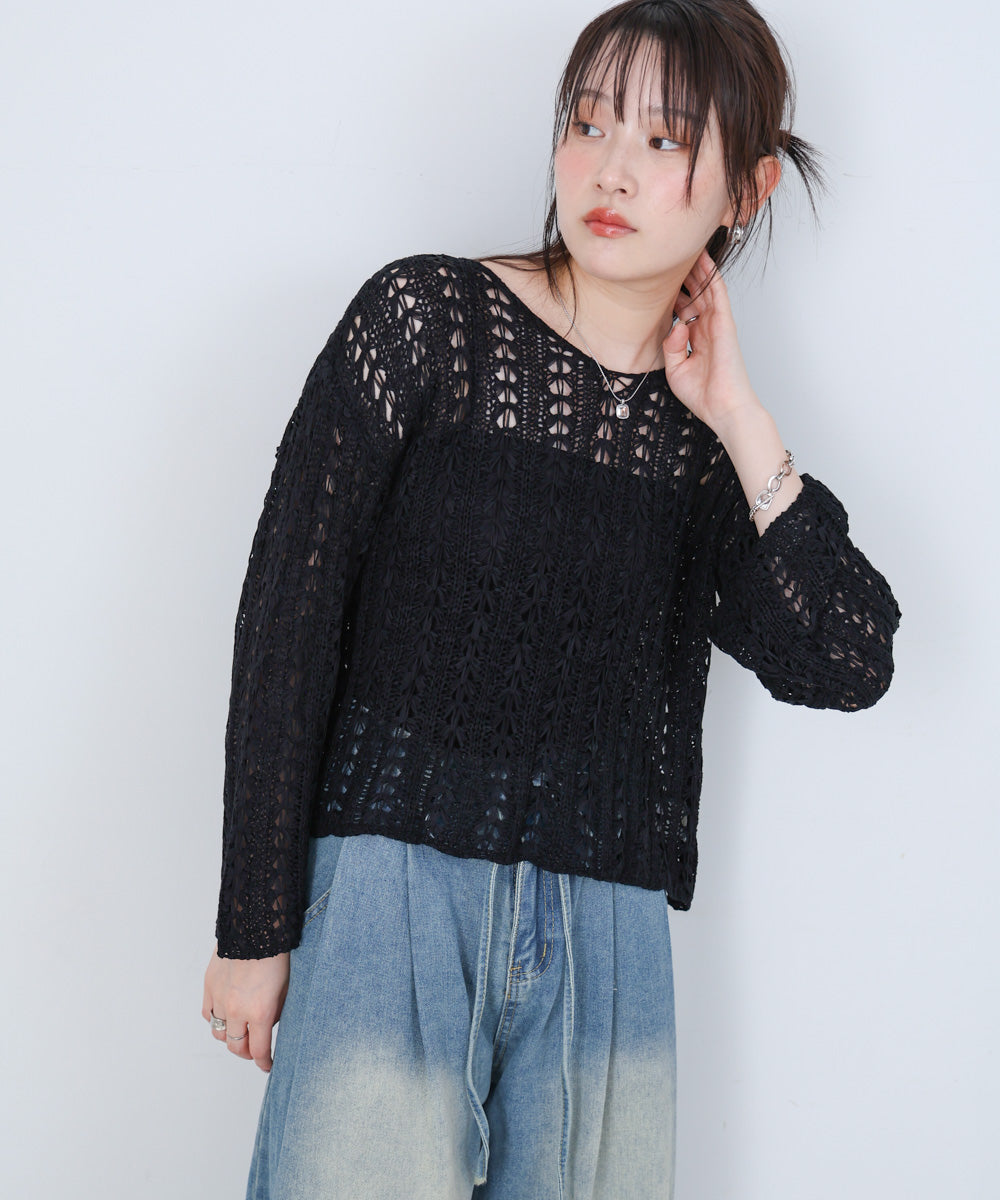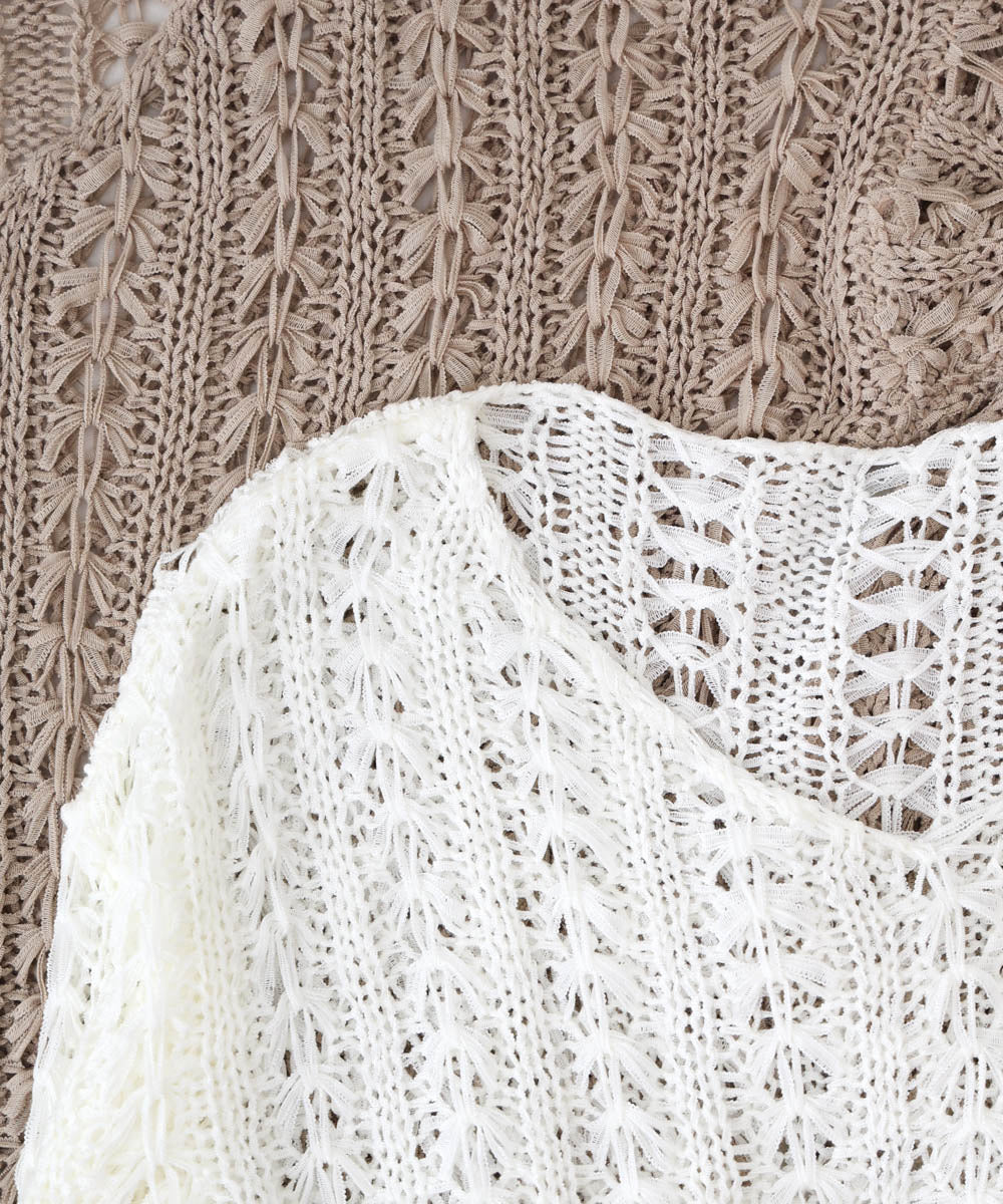 フラワー模様が可愛いレースニットトップスの登場です!網目が縦ラインに沿って入っているので華奢見えして見えるのもうれしいポイントです。フラワー模様のフェミニンさと網目の空き具合の抜け感が絶妙にマッチして、上品さもありながらどこかカジュアル感もそなえたトップスに仕上がっています。さらにストレッチ性があるので着やすくなっています。