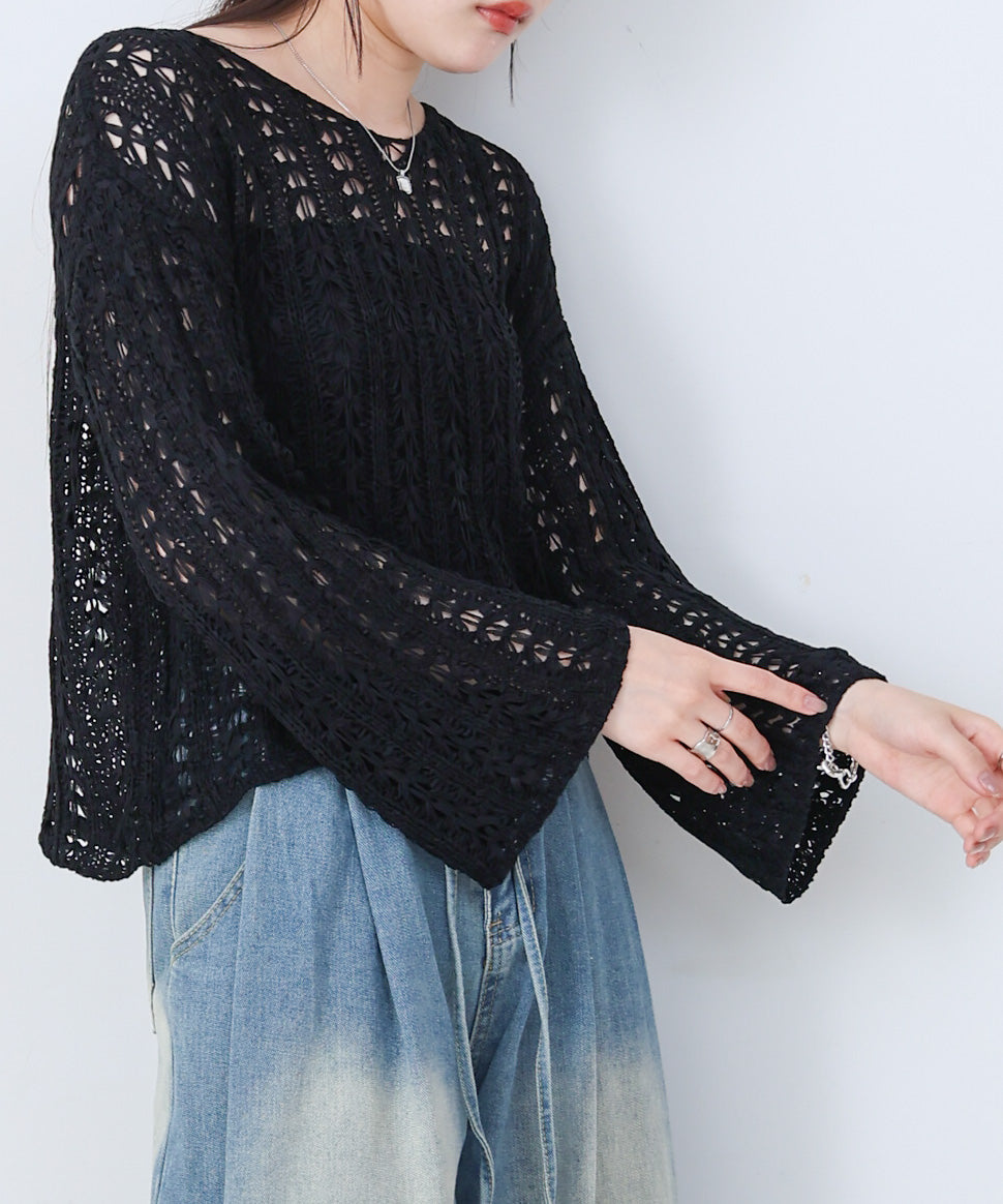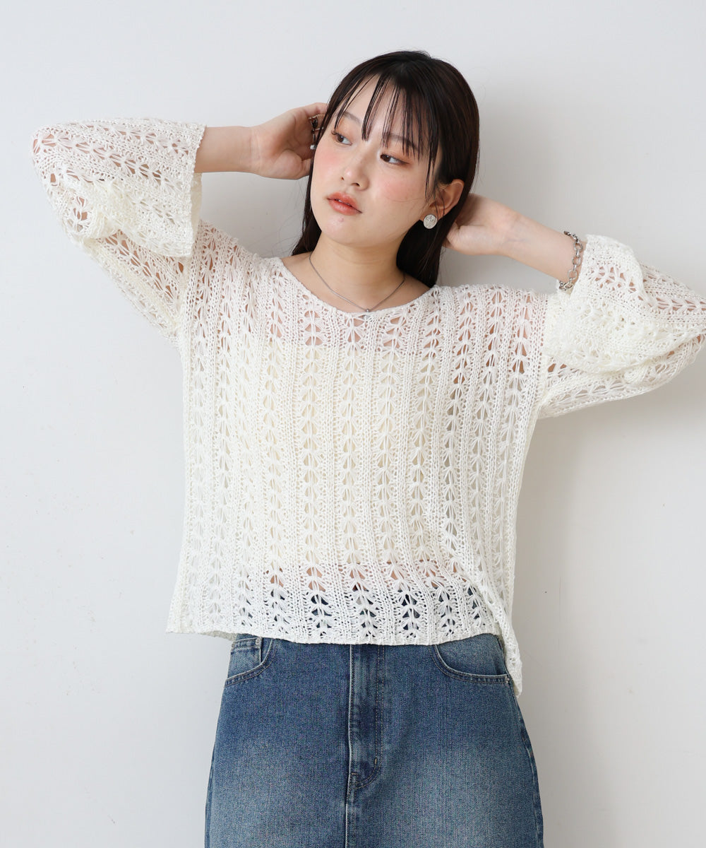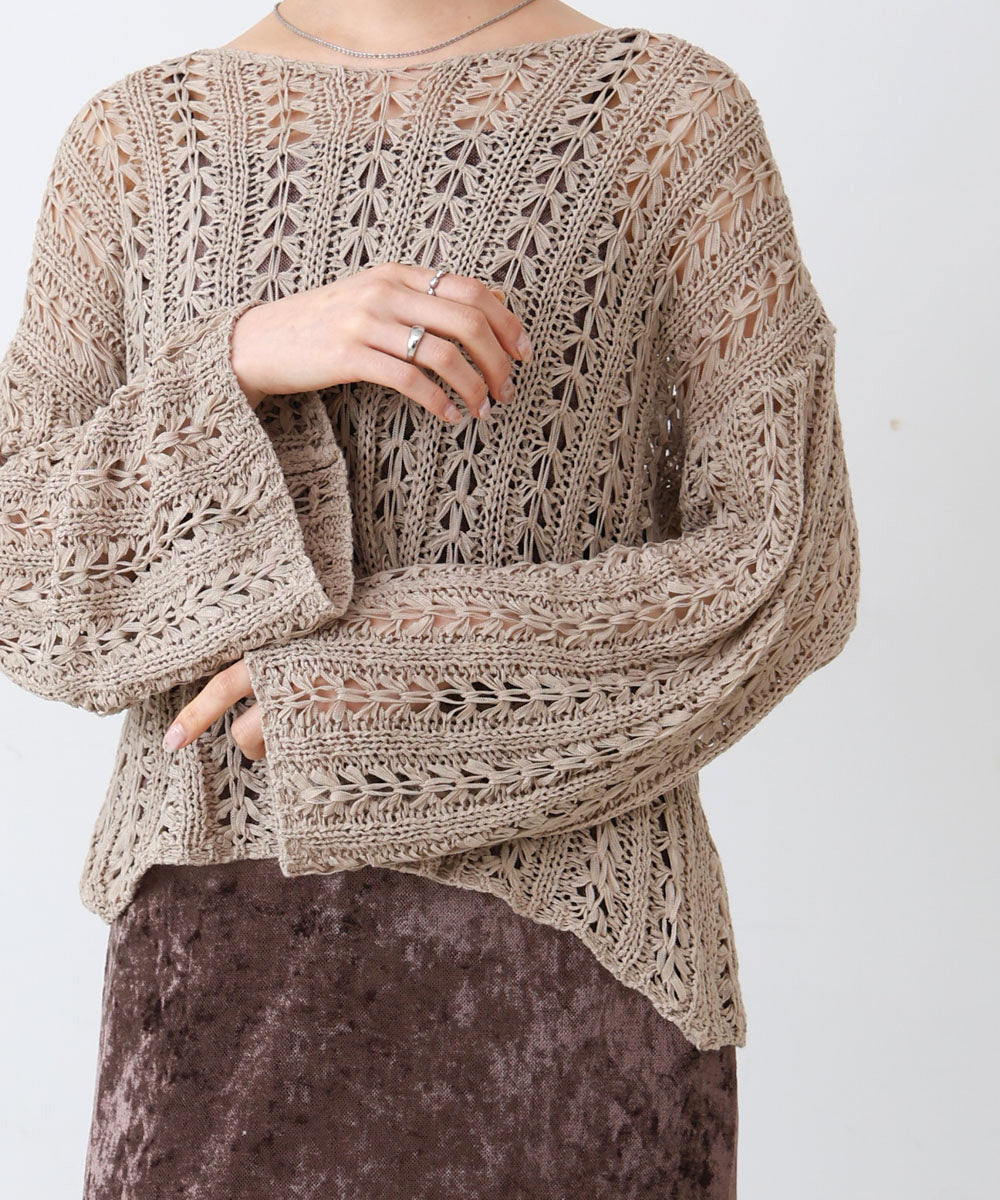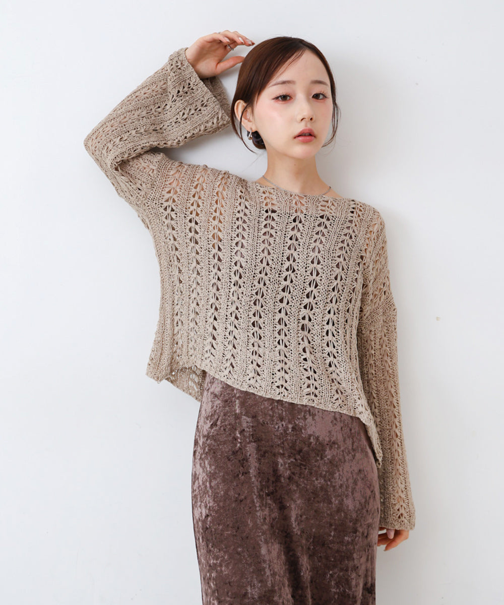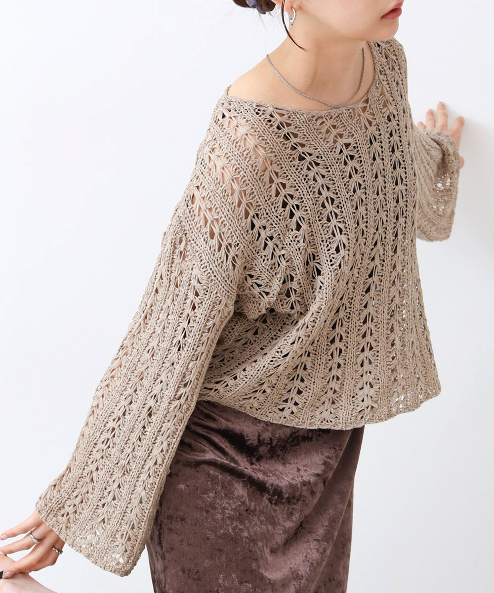 フラワー模様が可愛いレースニットトップスの登場です!網目が縦ラインに沿って入っているので華奢見えして見えるのもうれしいポイントです。フラワー模様のフェミニンさと網目の空き具合の抜け感が絶妙にマッチして、上品さもありながらどこかカジュアル感もそなえたトップスに仕上がっています。さらにストレッチ性があるので着やすくなっています。